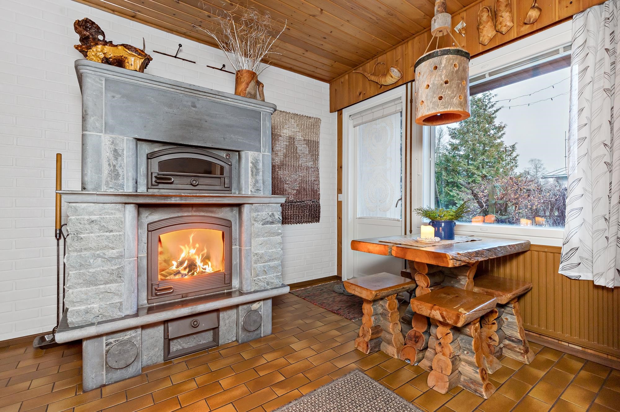 Keittiö: Seinät maalattu / tapetoitu, lattiat muovimatto. Olohuone: Seinät maalattu / tapetoitu, lattiat laminaatti. Makuuhuone 1: Seinät lasikuitutapetti, lattiat muovimatto. Makuuhuone 2: Seinät lasikuitutapetti, lattiat muovimatto. Makuuhuone 3: Seinät lasikuitutapetti, lattiat muovimatto. Sauna: Seinät paneloitu, lattia laatoitettu. Kylpyhuone: Seinät laatoitettu, lattia laatoitettu. Eteinen: Seinät lasikuitutapetti, lattia laminaatt. Wc: Seinät kaakeli/tapetti, lattia laatta. Takkahuone: Seinät tiili / puupaneeli, lattia laatta. Tuulikaappi: Seinät lasikuitutapetti, lattia laatta.