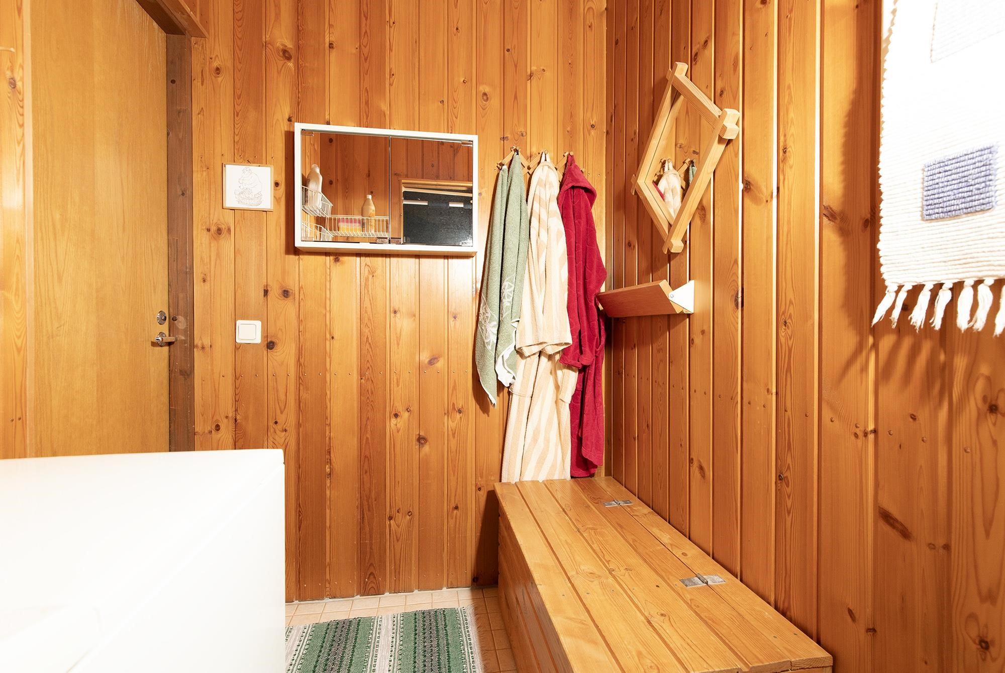 - Sauna, puukiuas, kylpyhuone, erillinen wc, suihku, peilikaappi, allaskaappi, pesukoneliitäntä, lattialämmitys, kiinteät valaisimet.