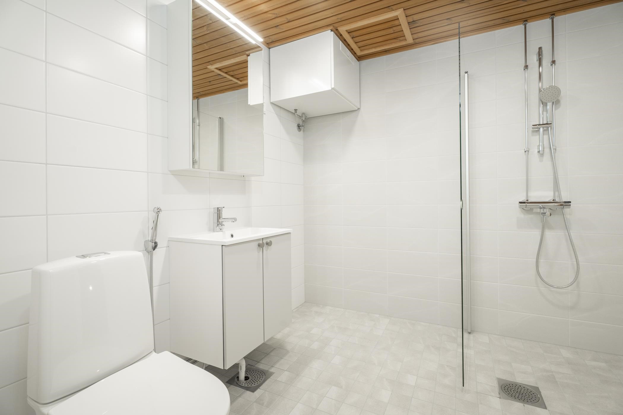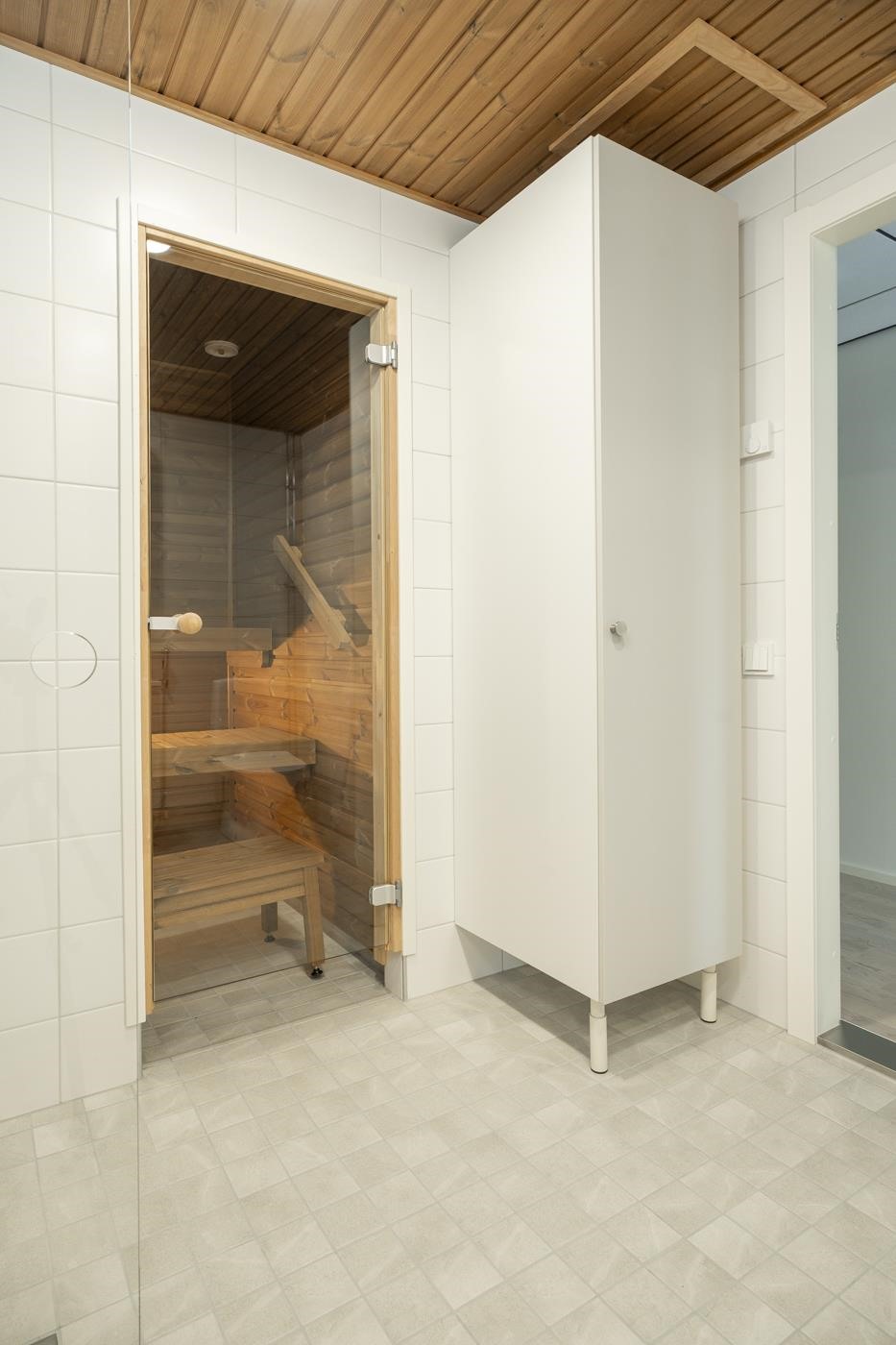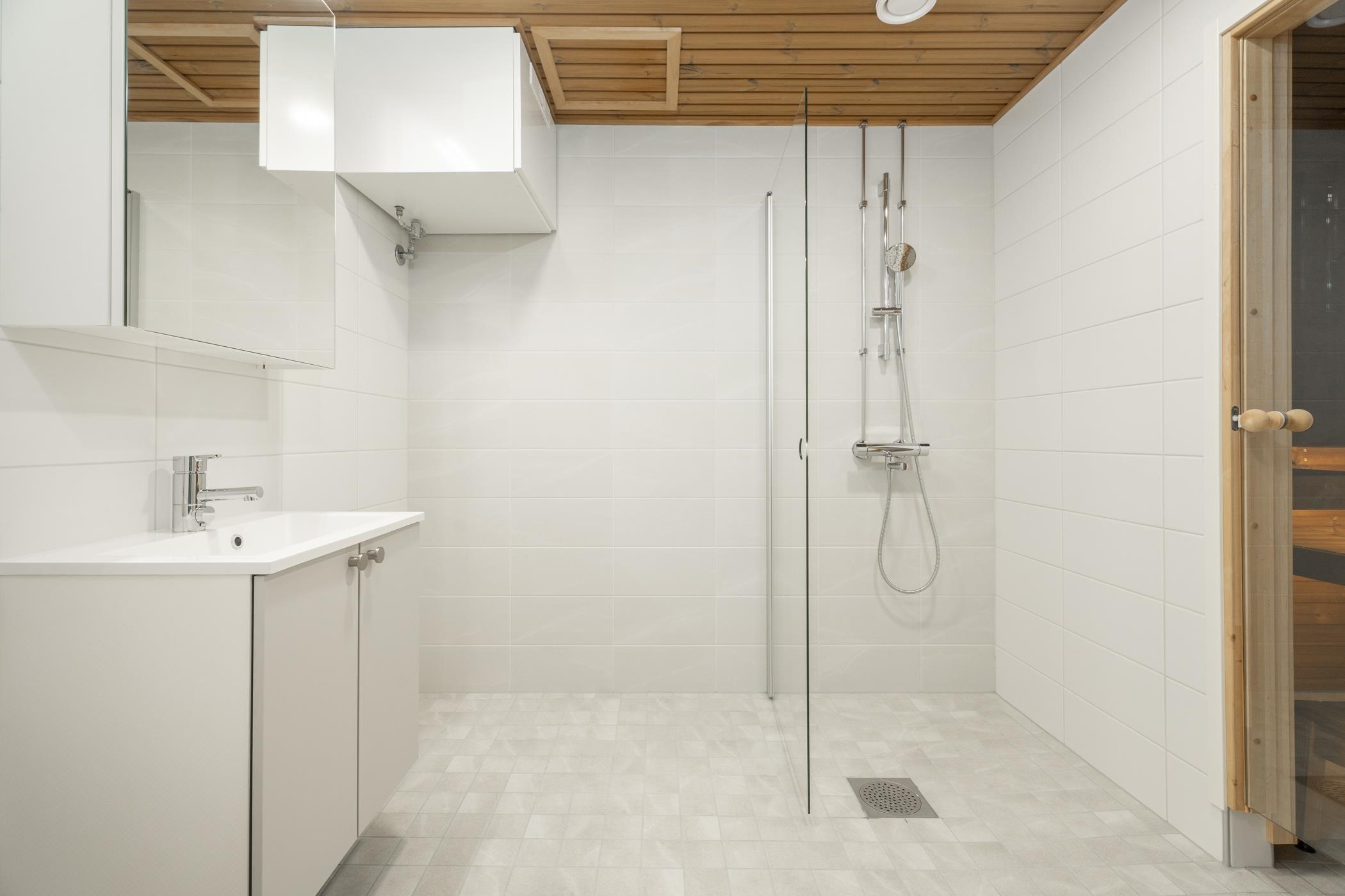 - Kylpyhuoneen lattiat ja seinät ovat laatoitettuja, katto paneloitu. Kylpyhuoneessa on tasoallas ja pesuallaskaappi sekä sen yläpuolella peilikaappi. Erillis-wc:ssä on tasoallas ja pesuallaskaappi. Erillis-wc:n ja kodinhoitohuoneen lattiat ovat laatoitettuja, seinät ovat maalattuja. Saunan lattia on laatoitettu, seinät ja katto paneloituja. Saunan ovi on kokolasinen.