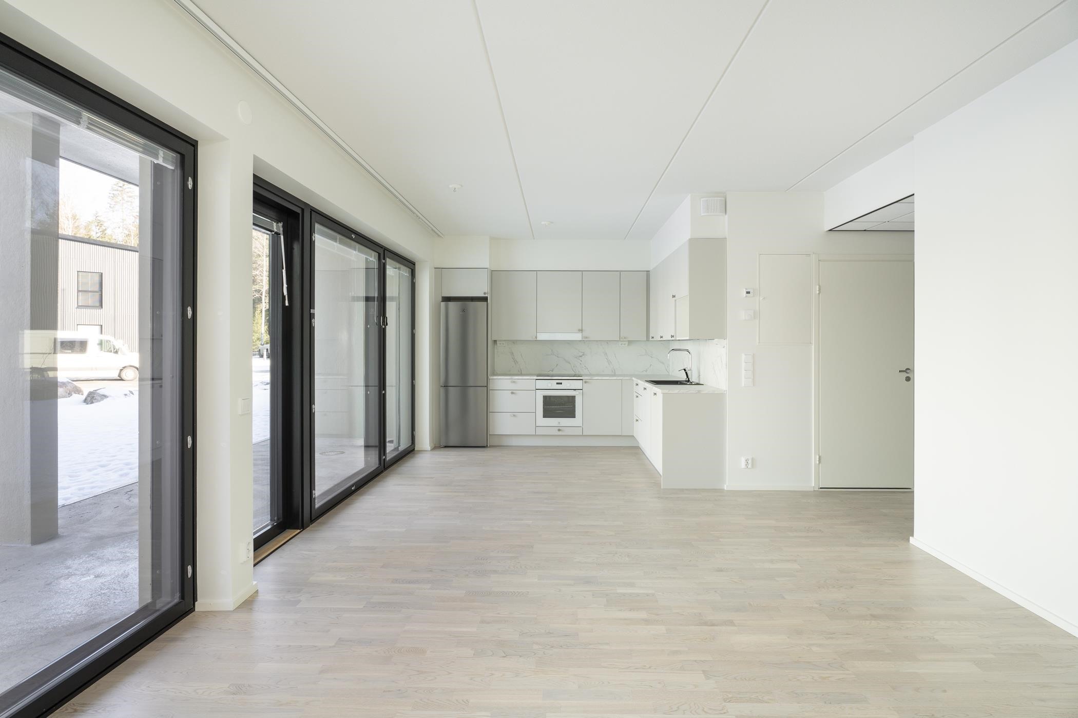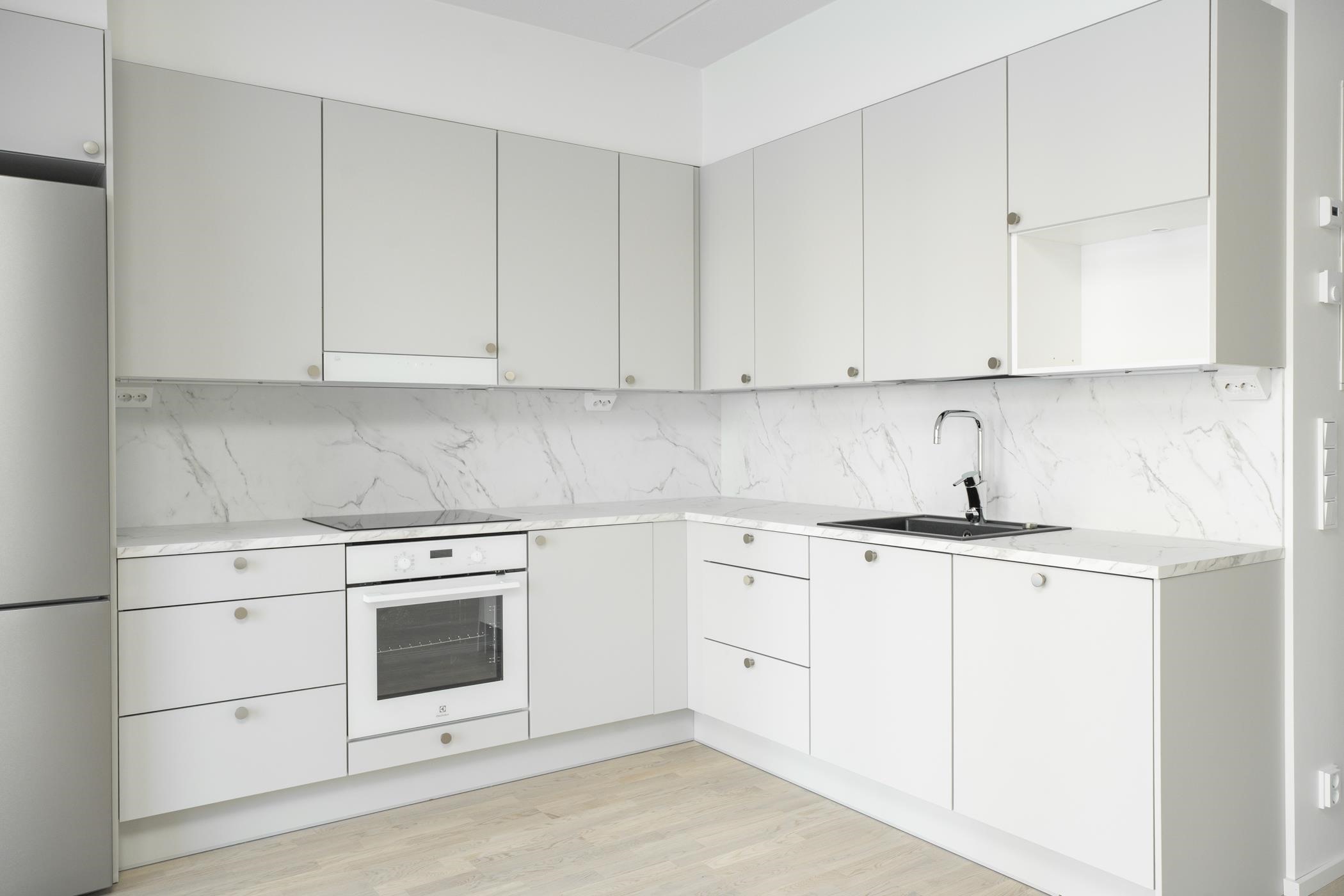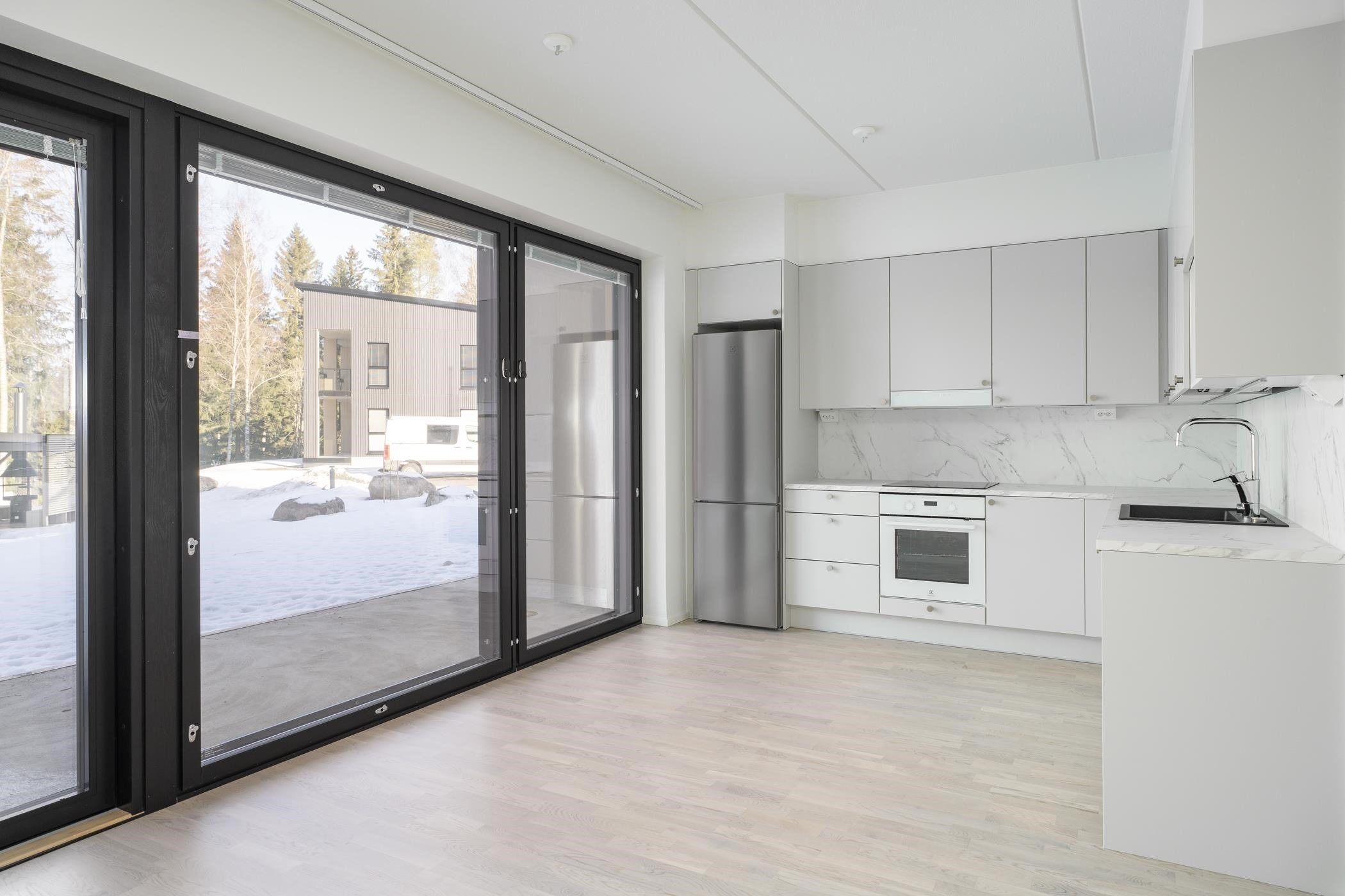 - Keittiöissä on erillisuuni, induktioliesitaso ja astianpesukone. 2h+kt asunnoissa on jää-pakastinkaappi. 3h+kt asunnoissa on erilliset jääkaappi ja pakastinkaappi. Keittiön pöytätaso on laminaattitaso, johon on kiinnitetty valutasollinen 1-altainen rst-allas tai komposiittiallas. Keittiössä on tilavaraus mikroaaltouunille.