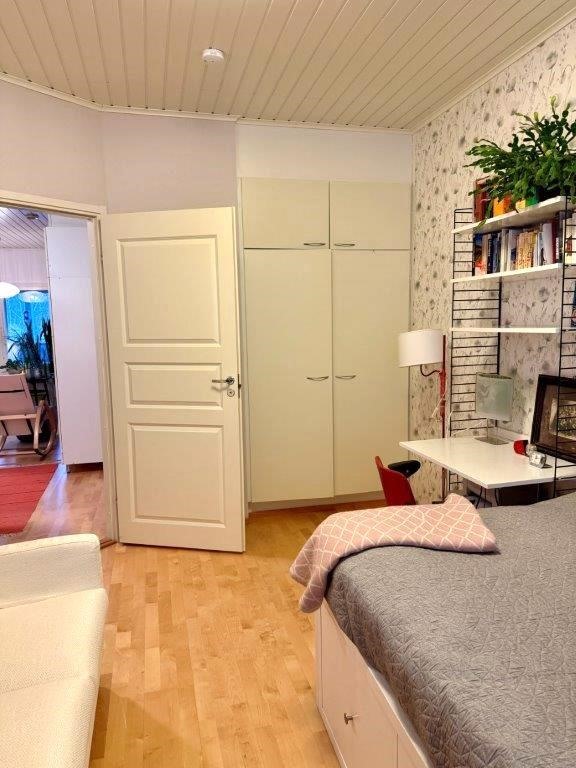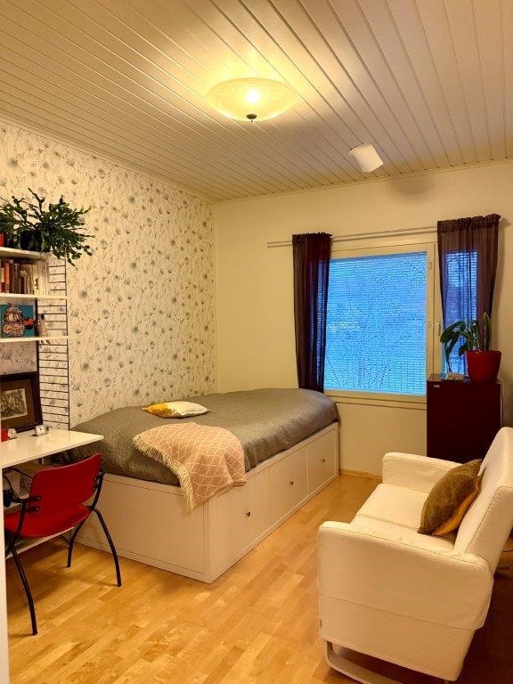 Keittiö: Seinissä maali lattiassa parketti. Olohuone: Seinissä tapetti lattiassa parketti. Makuuhuone 1: Seinissä tapetti lattiassa parketti. Sauna: Seinissä panelit lattiassa laatta. Kylpyhuone: Laatoitettu. Eteinen: Seinissä maali lattiassa parketti.