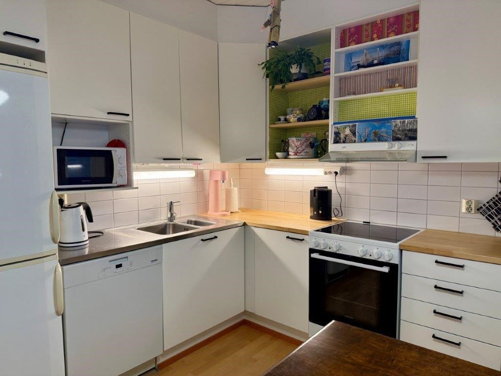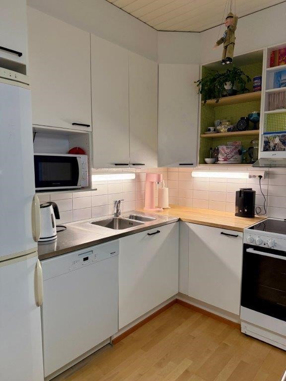 - Jääkaappipakastin, induktioliesi, liesituuletin, astianpesukone 2019, kaapistot, kiinteät valaisimet led. Keittiön kaapinovet on maalattu, koivutasot asennettu ja keittiöön lisätty vetolaatikko, jätejärjestelmä sekä uusittu liesi vuonna 2022