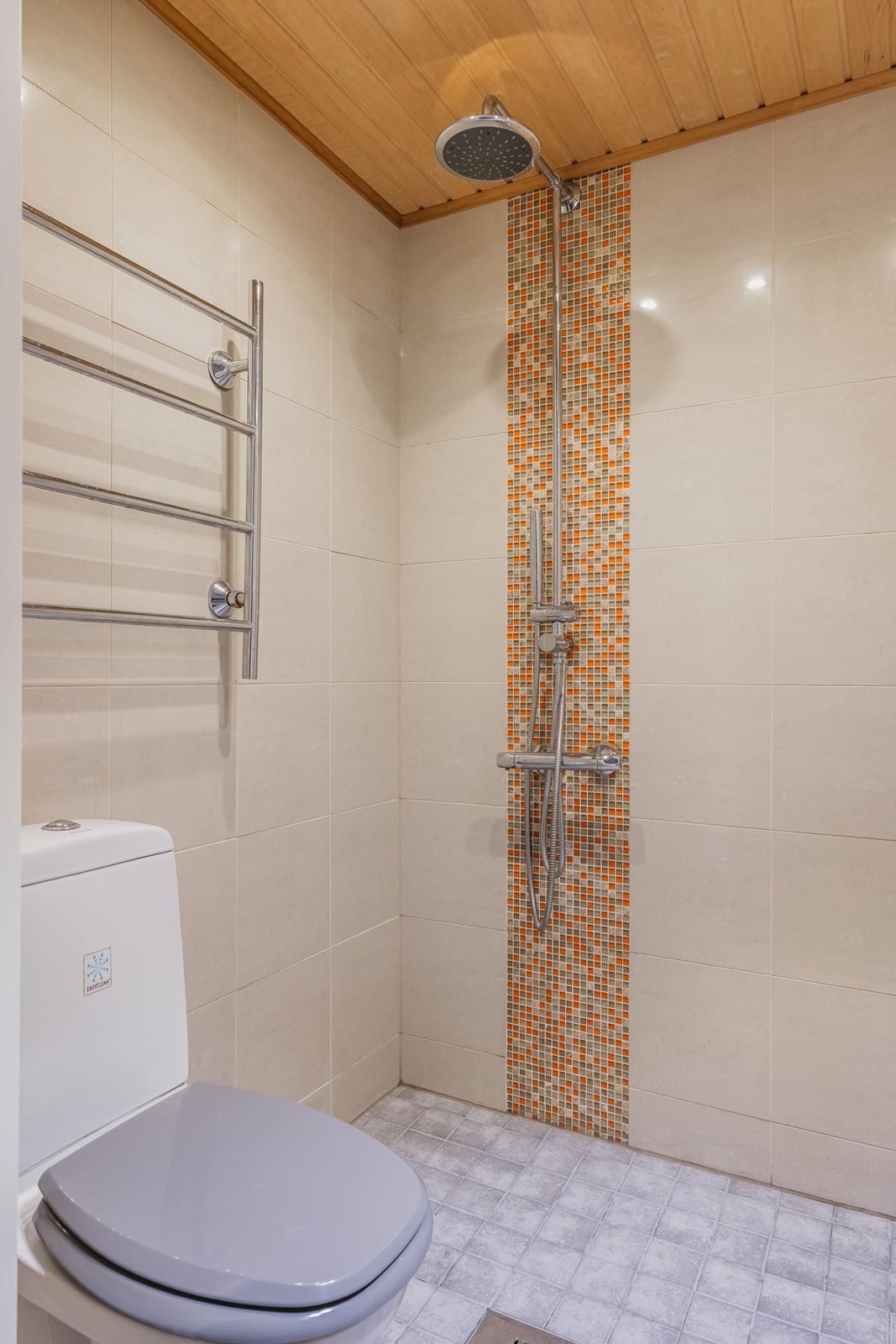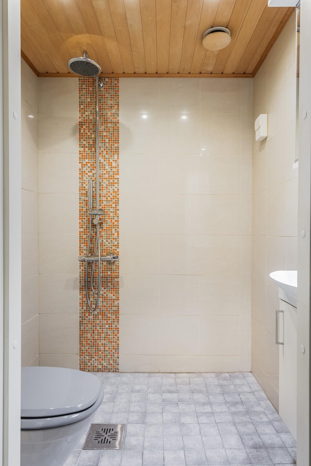 - Kylpyhuone, suihku, peilikaappi, allaskaappi, pesukoneliitäntä, kiinteät valaisimet.