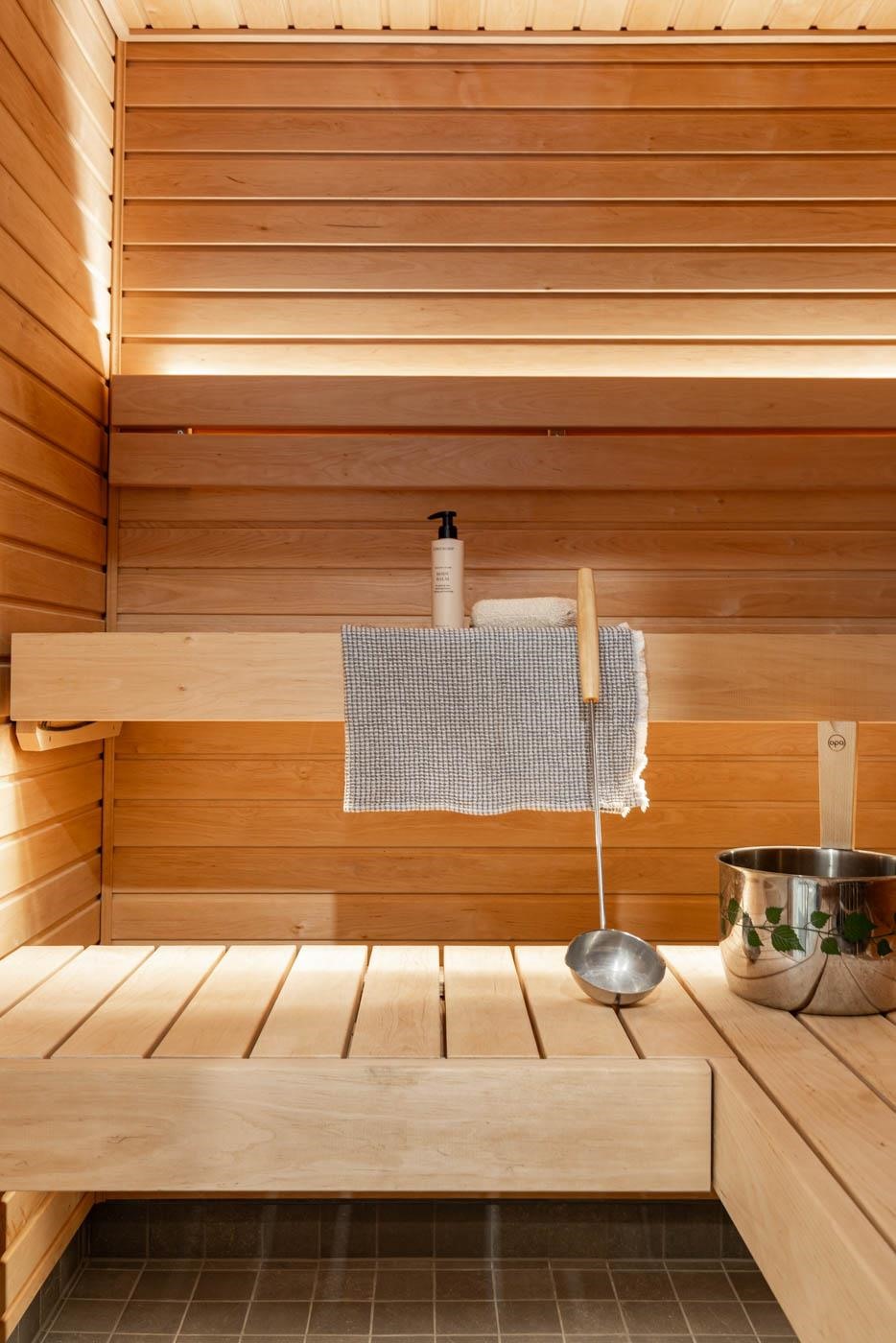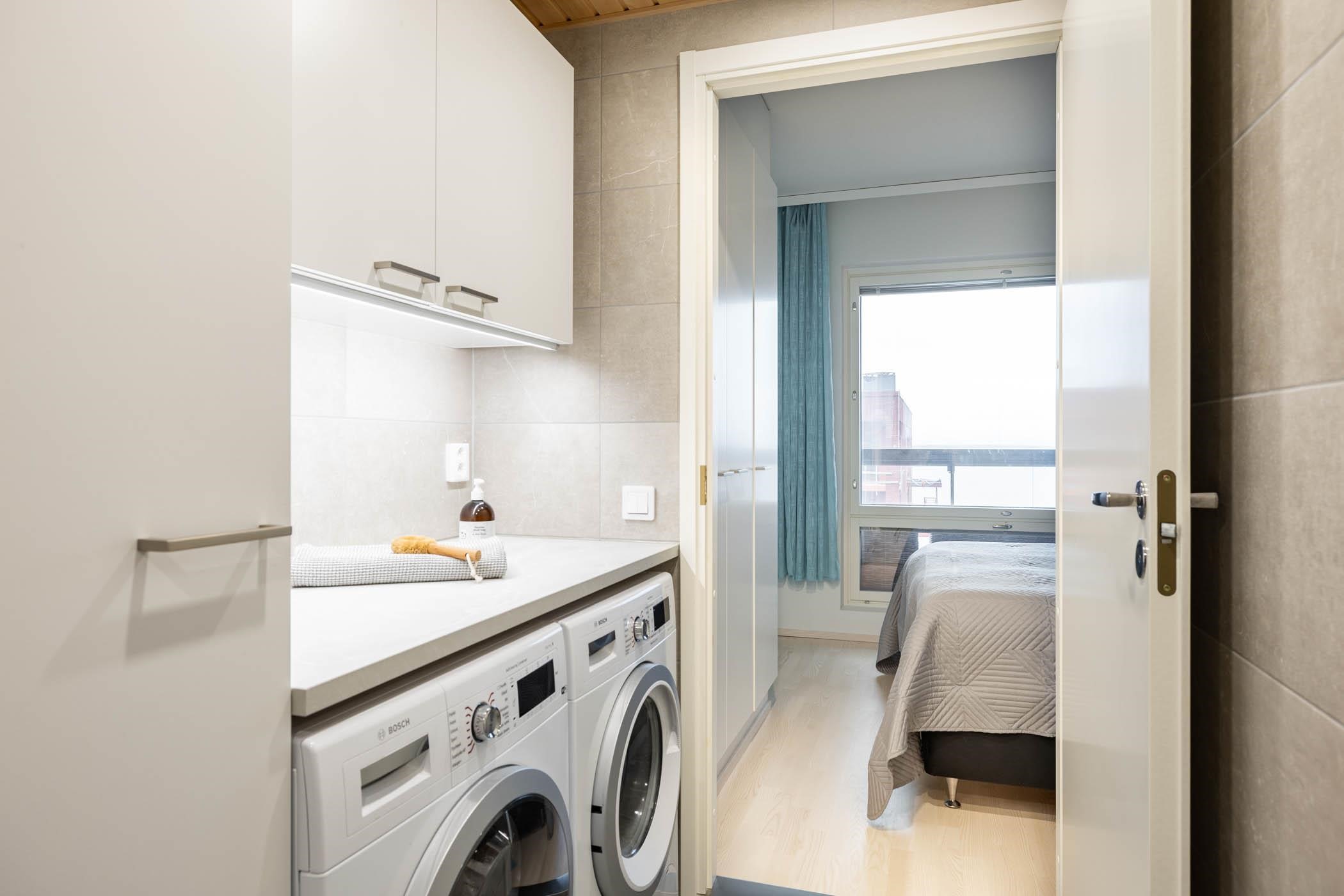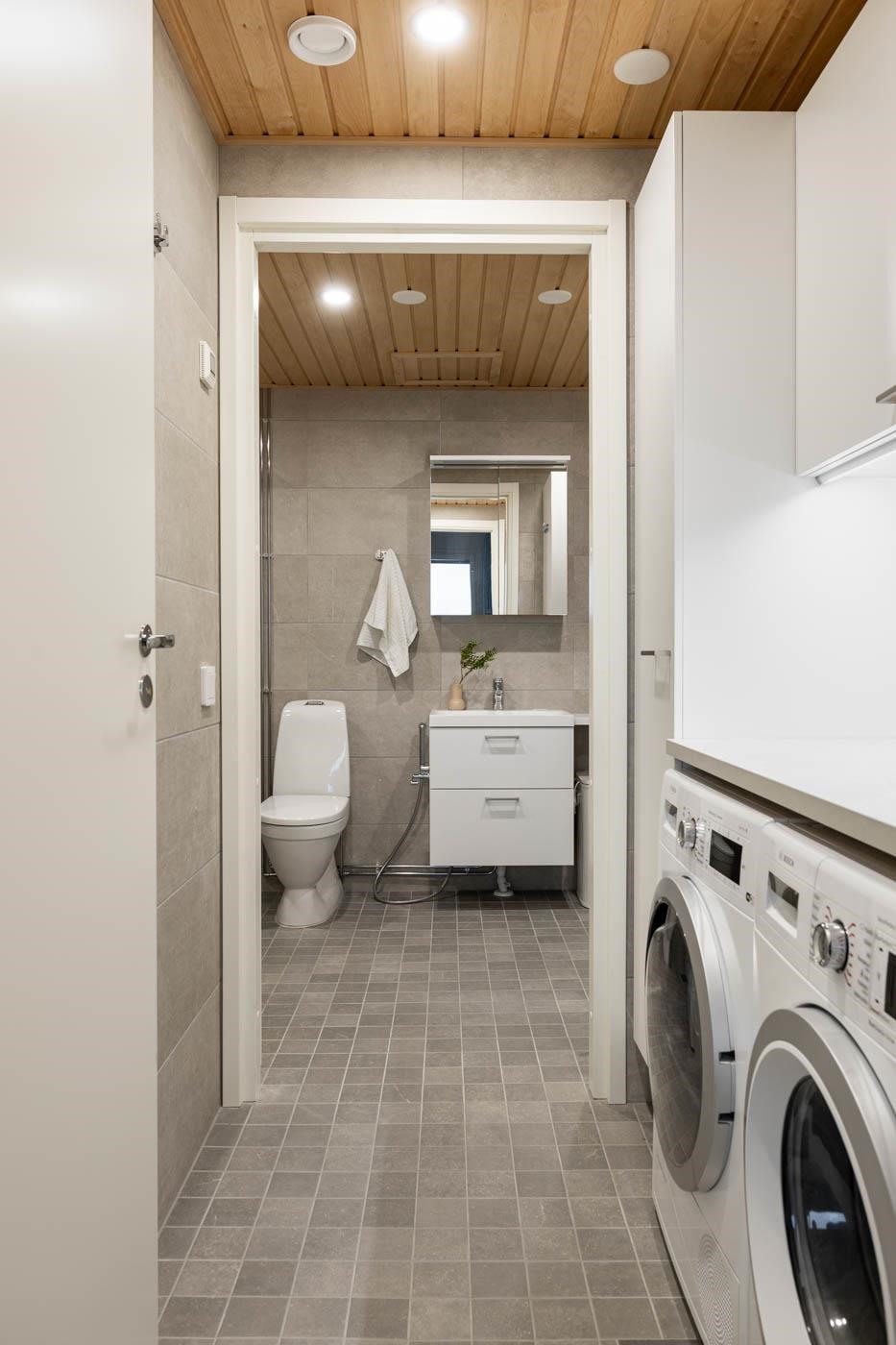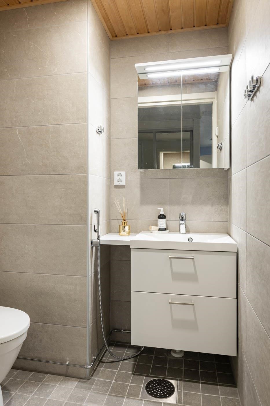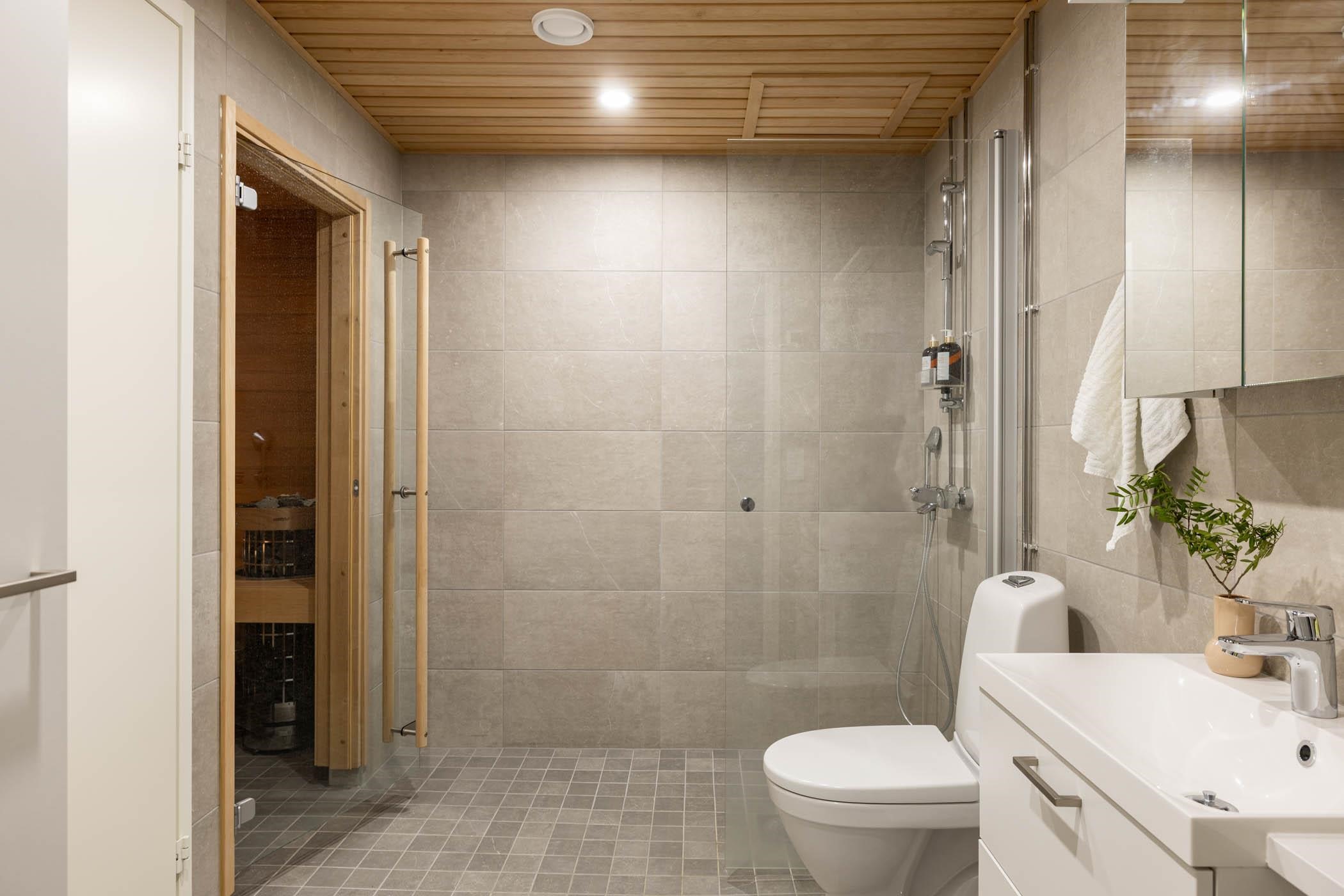 - Kylpyhuoneessa : WC, suihku ja suihkuseinä, sauna sähkökiukaalla, kodinhoitotilaa ja pesukoneliitäntä, kaapistot, peilikaappi, allaskaappi ja kiinteät valaisimet. Erillinen WC : WC, peilikaappi, allaskaappi ja kiinteät valaisimet.