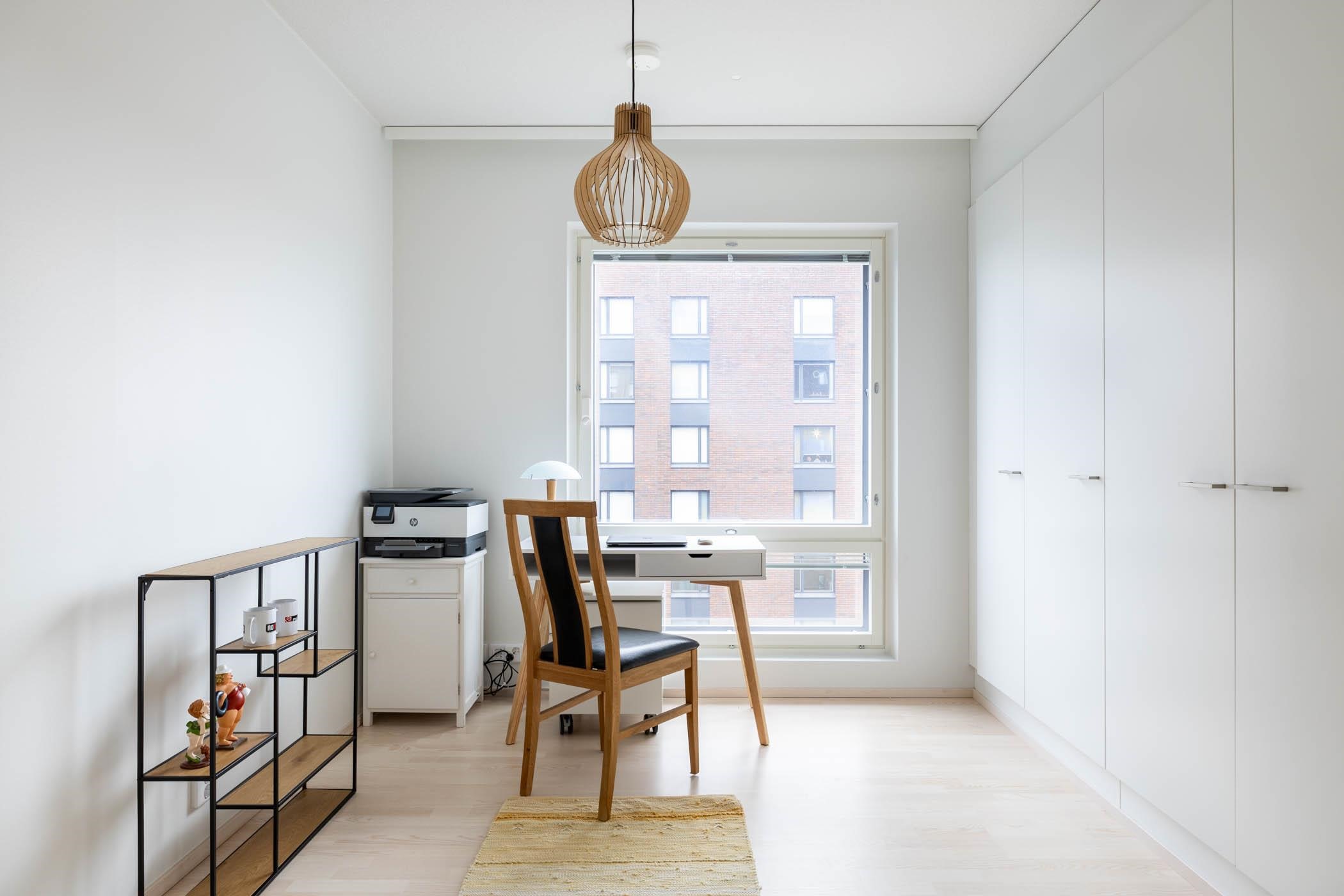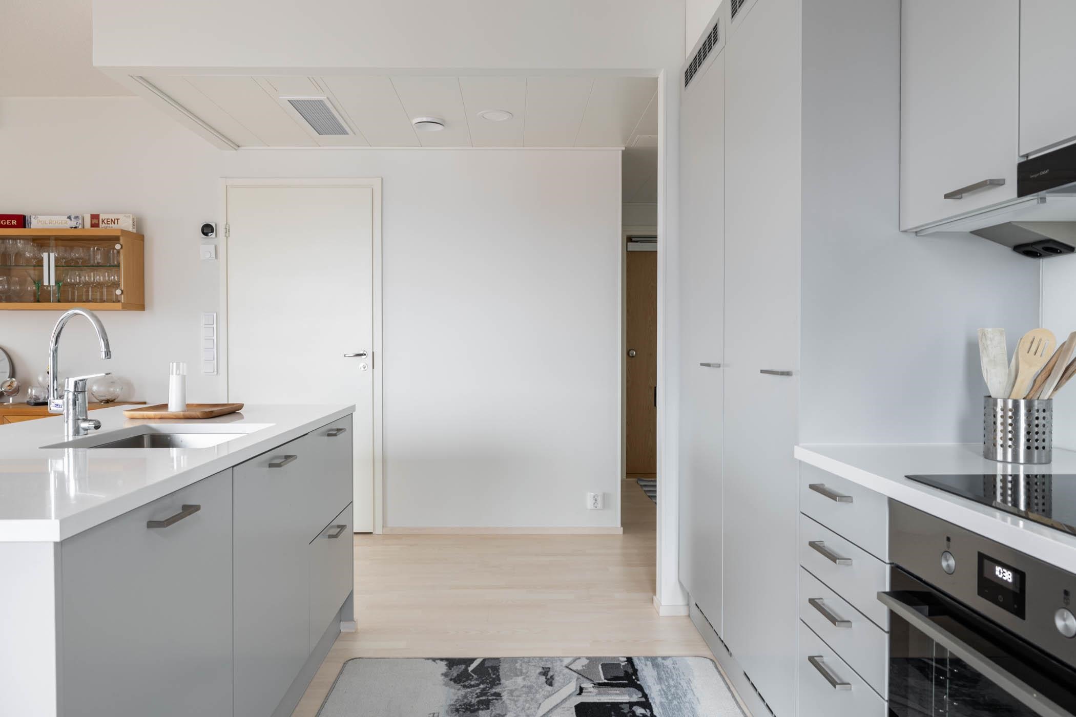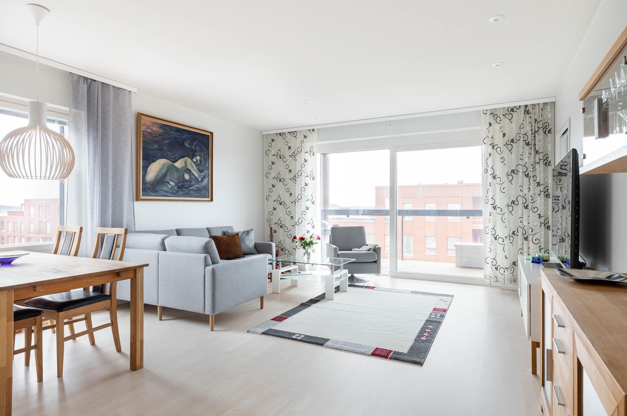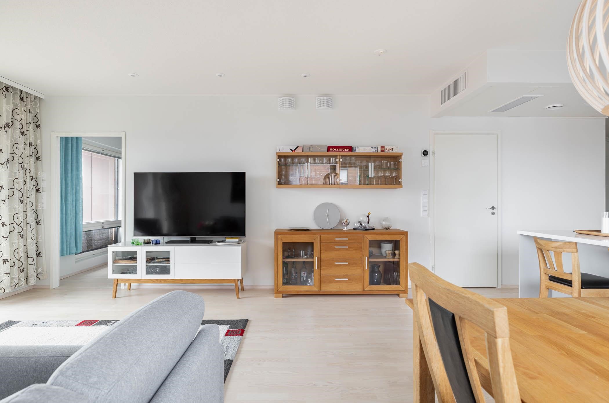 Tämä 84 m²:n kolmio on suunniteltu tyylikkäästi ja käytännöllisesti. Pohjaratkaisu on toimiva, ja taipuukin monenlaiseen eri elämäntilanteeseen. Suuret ikkunat tuovat päivänvaloa asuntoon, ja parvekkeelta on mukava ihastella auringonlaskuja. Asuintilojen lämmönjako on toteutettu miellyttävällä vesikiertoisella lattialämmityksellä, ja kesähelteitä varten löytyy myös viilennys.