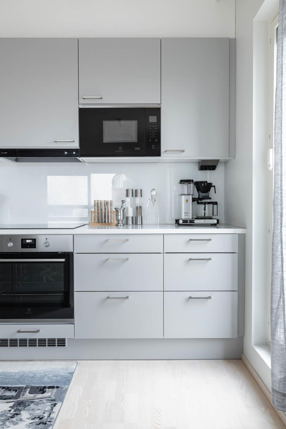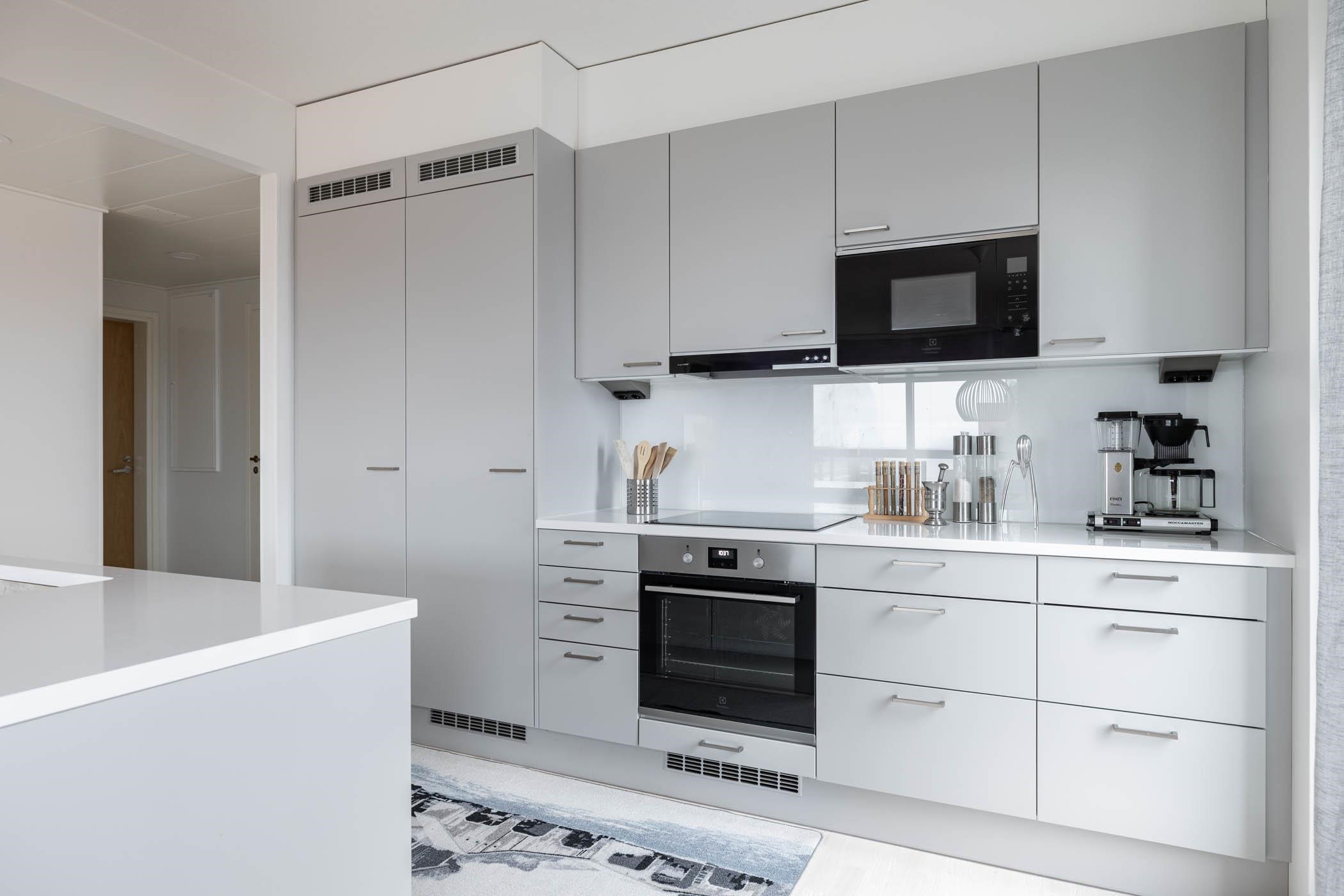 - Keittiössä : Integroidut jää- ja pakastekaappi, integroitu erillisuuni ja liesitaso, liesikupu, integroitu mikroaaltouuni, kaapistot ja saareke, mukavasti kaappi ja laskutilaa sekä kiinteät valaisimet.