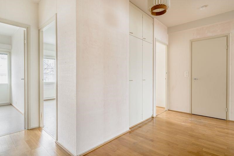 Keittiö: Maalatut seinät ja parkettilattia. Olohuone: Tapettia ja parkettilattia. Makuuhuone 1: Tapettia ja parkettilattia. Makuuhuone 2: Tapettia ja parkettilattia. Makuuhuone 3: Tapettia ja muovimatto (limoleum). Kylpyhuone: Seinät osittain maalattu/kaakeloitu, laattalattia. Eteinen: Tapettia ja parkettilattia. Wc: Tapettia/kaakeloitu, laattalattia.
