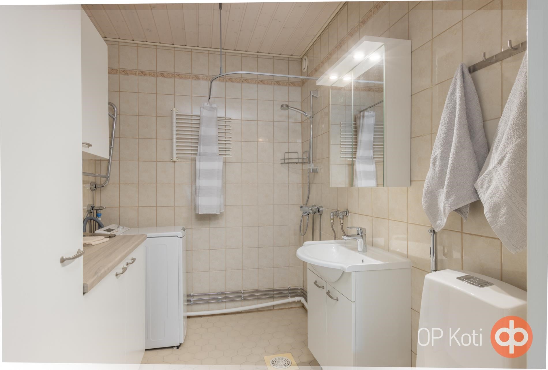 - Kylpyhuone, suihku, peilit, peilikaappi, kaapit kylpyhuoneen kaapistot uusittu 3/2022, allaskaappi, pesukoneliitäntä, kiinteät valaisimet. Rättipatteri