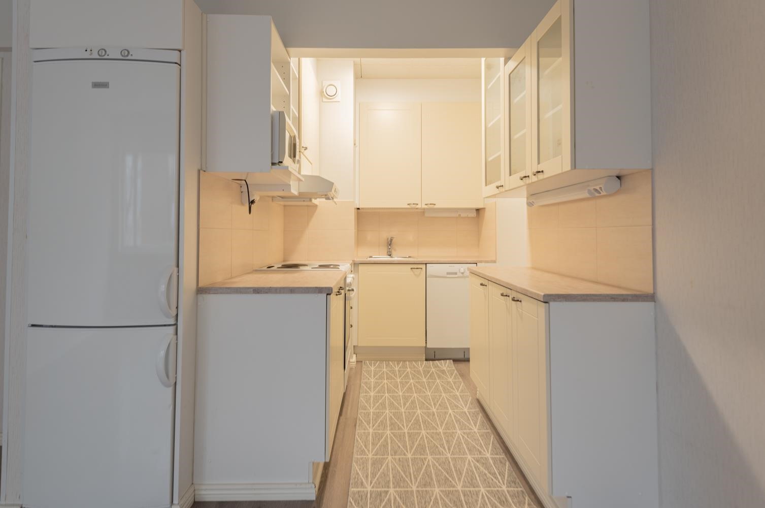 - Jääkaappipakastin, lattialiesi, liesituuletin, mikroaaltouuni, astianpesukone, kaapistot, kiinteät valaisimet.