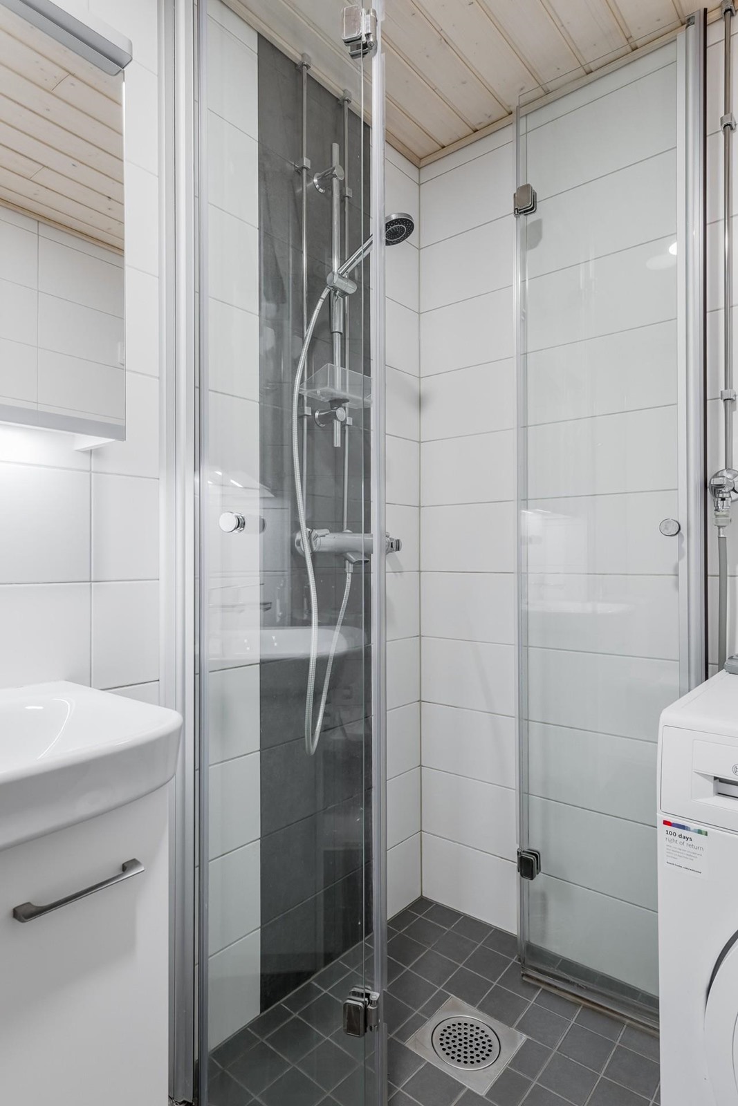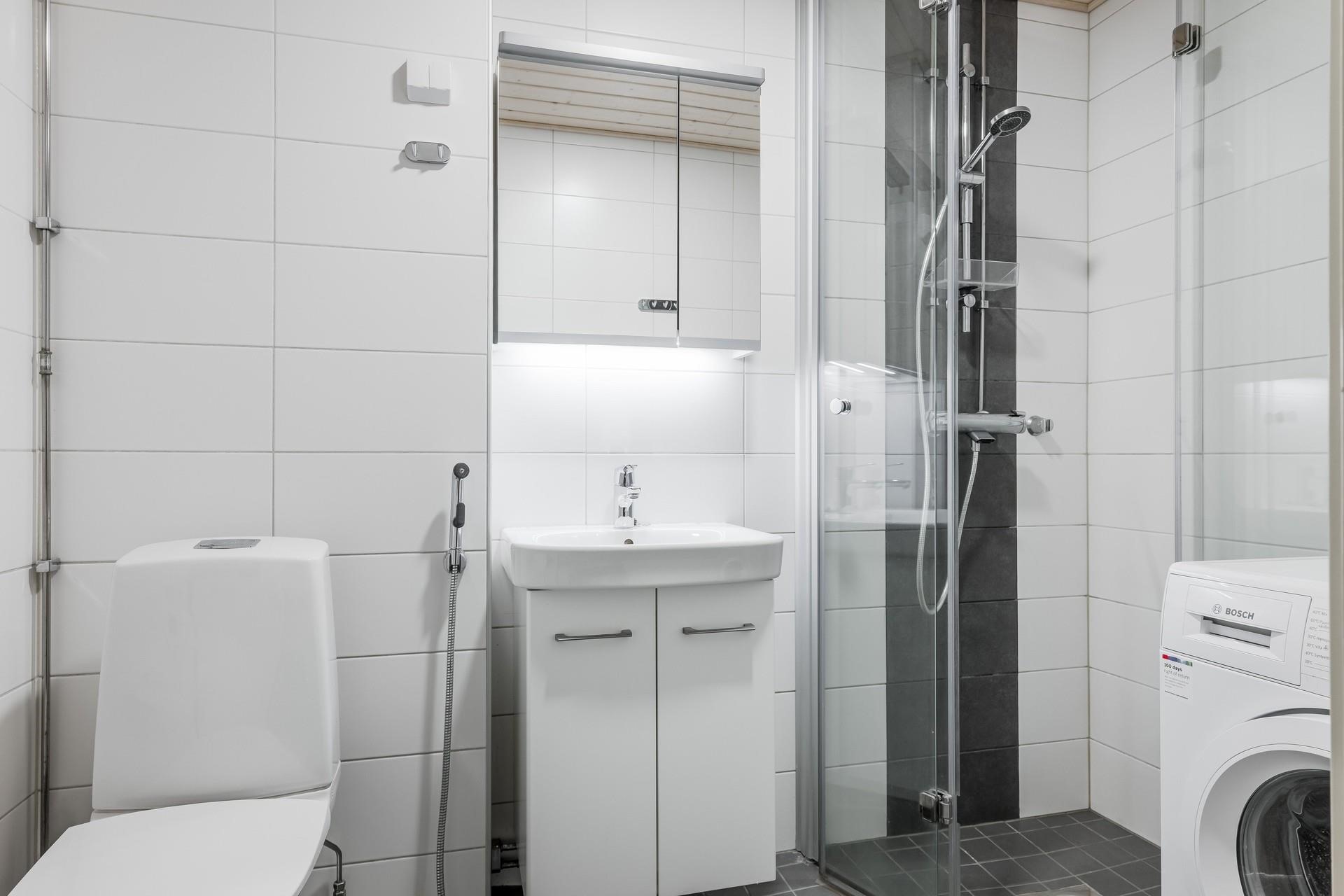 - Kylpyhuone, suihku, suihkuseinä kääntyvät suihkuseinät, peilikaappi, allaskaappi, pesukoneliitäntä, lattialämmitys (mukavuuslattialämmitys sähkö), kiinteät valaisimet.