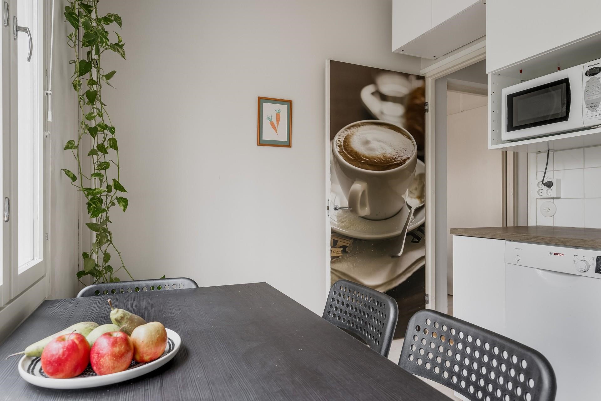 Tässä toisen kerroksen kodissa on kaksi makuuhuonetta, olohuone, erillinen keittiö sekä lasitettu parveke, jolta avautuvat upeat auringonlaskunäkymät. Tilavat huoneet tarjoavat runsaasti sisustusmahdollisuuksia, ja säilytystilaa on poikkeuksellisen hyvin sekä eteisessä että makuuhuoneissa. Kylpyhuone on remontoitu perinteisen linjasaneerauksen yhteydessä, joten se vastaa nykypäivän vaatimuksia.