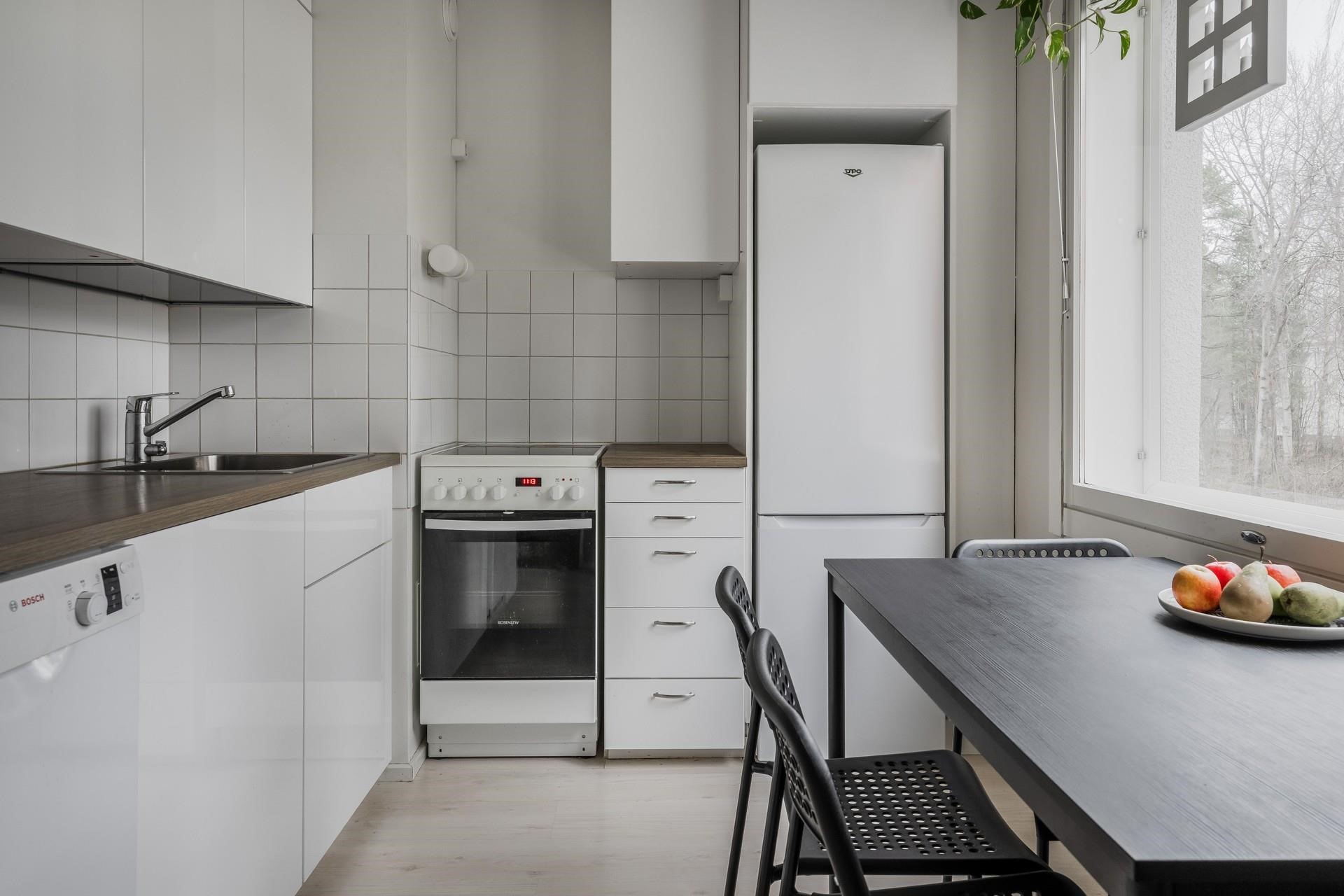 - Jääkaappipakastin, lattialiesi, astianpesukone, kaapistot, kiinteät valaisimet.