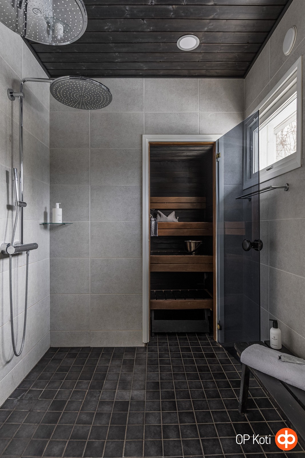 - Sauna sähkökiukaalla. Saunallisen kylpyhuoneen yhteydessä kodinhoitotila, jossa pesukoneliitäntä ja allaskaluste, sekä säilytystilaa. Erillis-wc keskikerroksessa jossa peilikaappi valolla ja wc-istuin. Makuuhuoneiden yhteydessä toinen kylpyhuone sadesuihkulla ja suihkuseinällä sekä Wc-istuimella. Poreallas ulkotiloissa terassilla, johon kulku saunatiloista. Kylpyhuonetiloissa sähköinen lattialämmitys