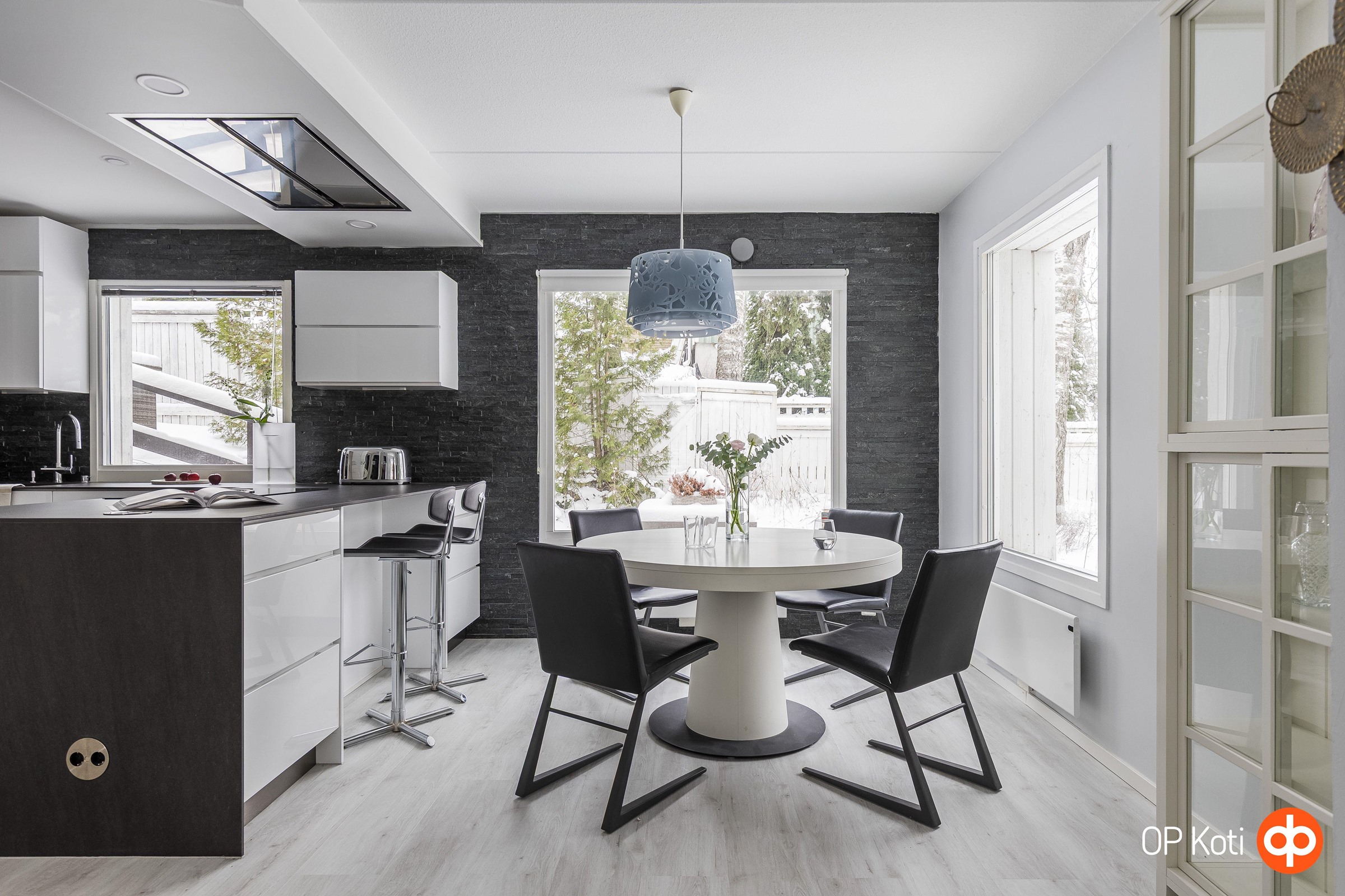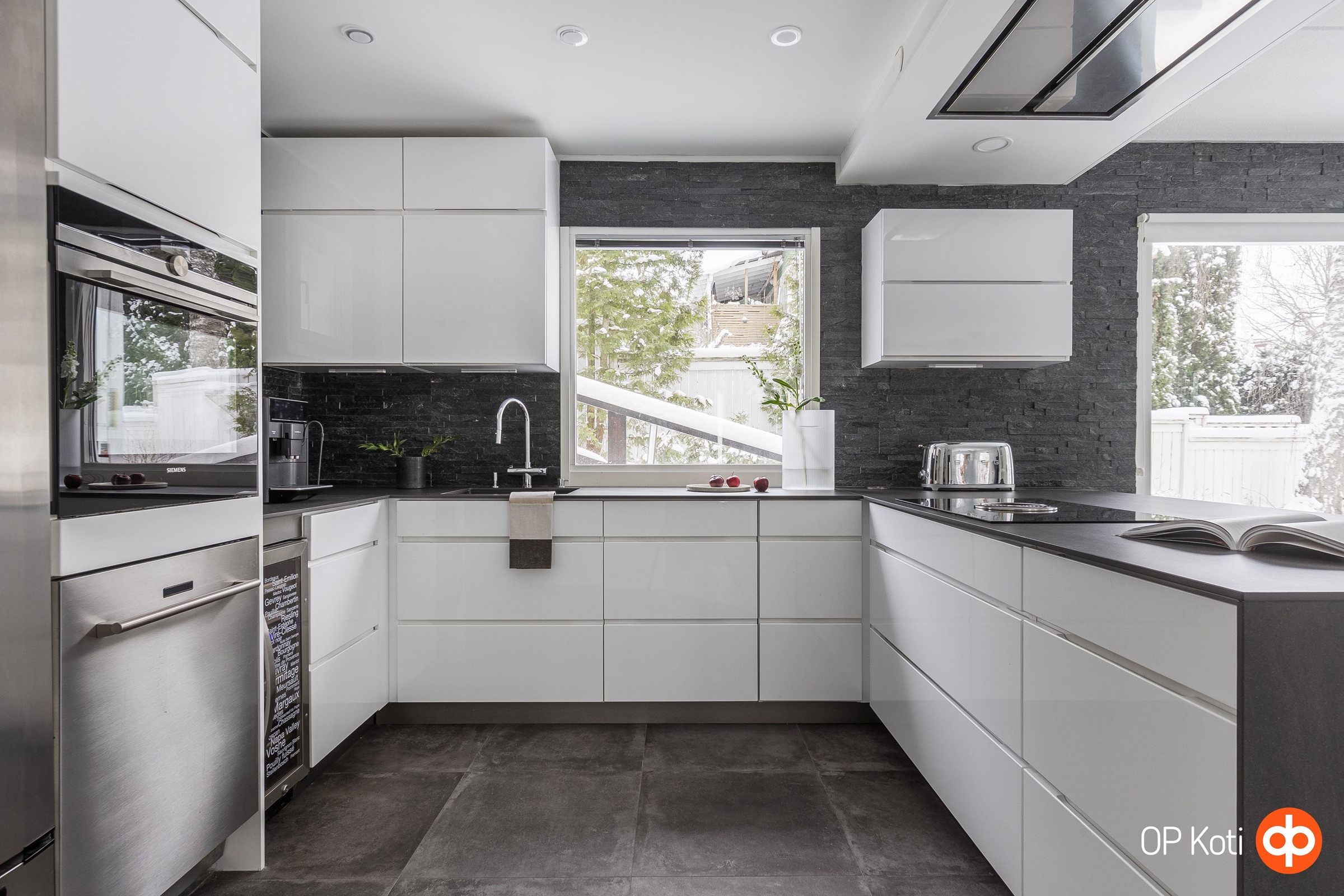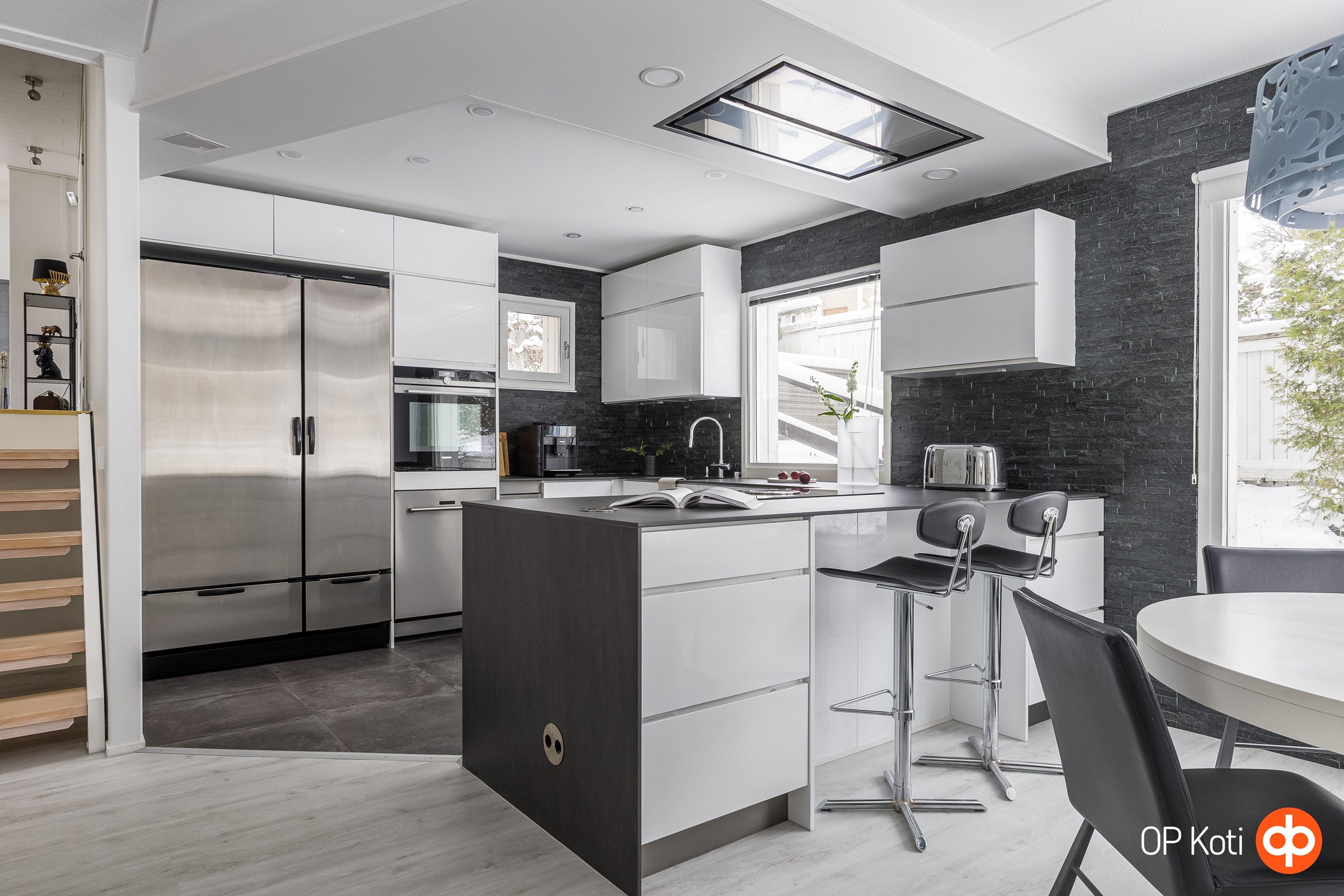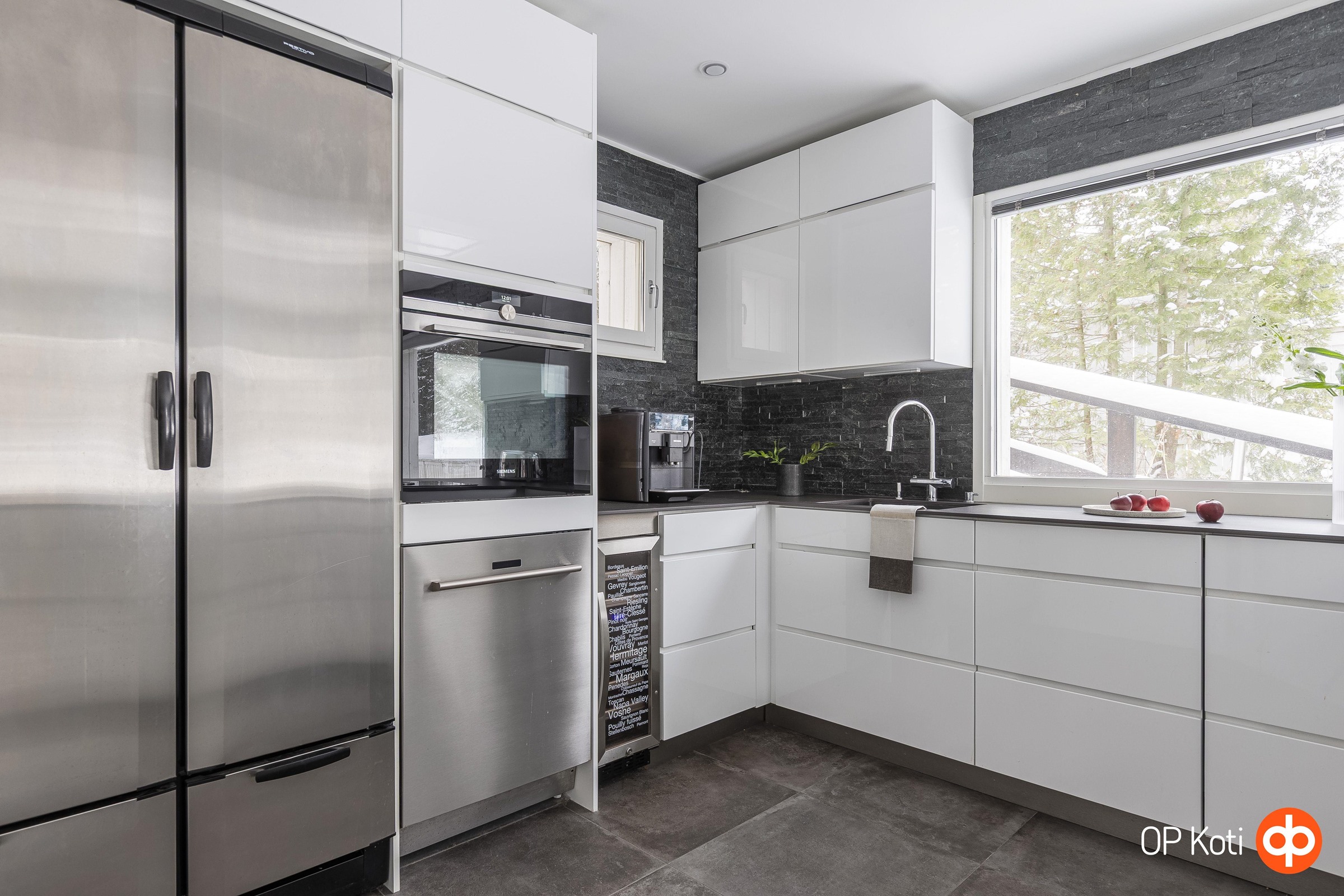- Festivo jääkaappi-pakastin, Miele-kalusteeseen integroitu uuni-mikroyhdistelmä, Savo Bora-tasoon upotettu induktioliesi ja tasotuuletinjärjestelmä, Savo-merkkinen kattoon upotettu tuuletin. Kaksi astianpesukonetta, joista toinen integroitu malli, toinen rst-pintainen tason alle asennettu, viinikaappi tason alle asennettu. Kaapistot Kvik-keittiön vetimetön mallisto kiiltävä valkoinen pinta, keraamiset tasot, välitila verhoilutiili, saareke molemminpuolisilla säilytystiloilla.
