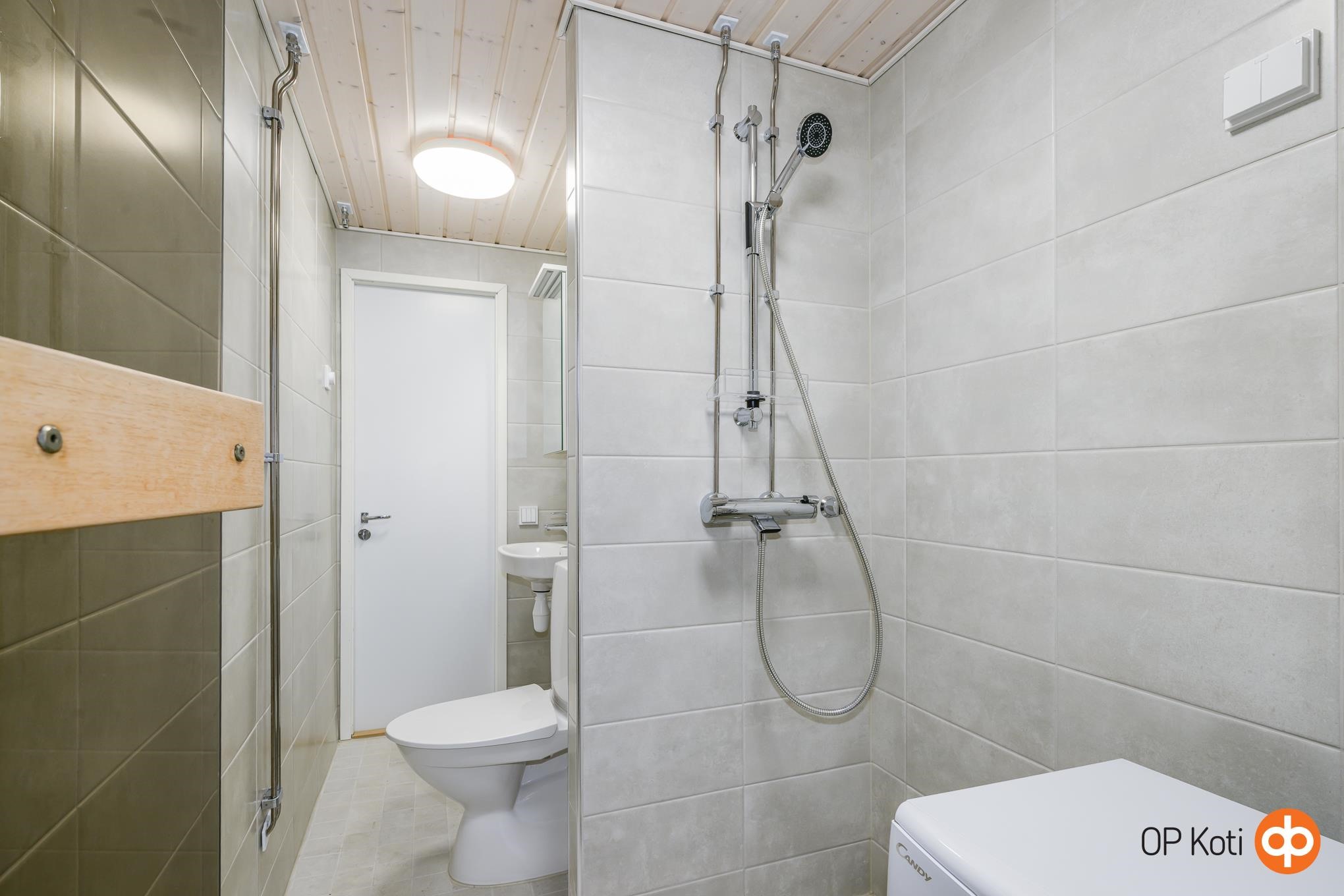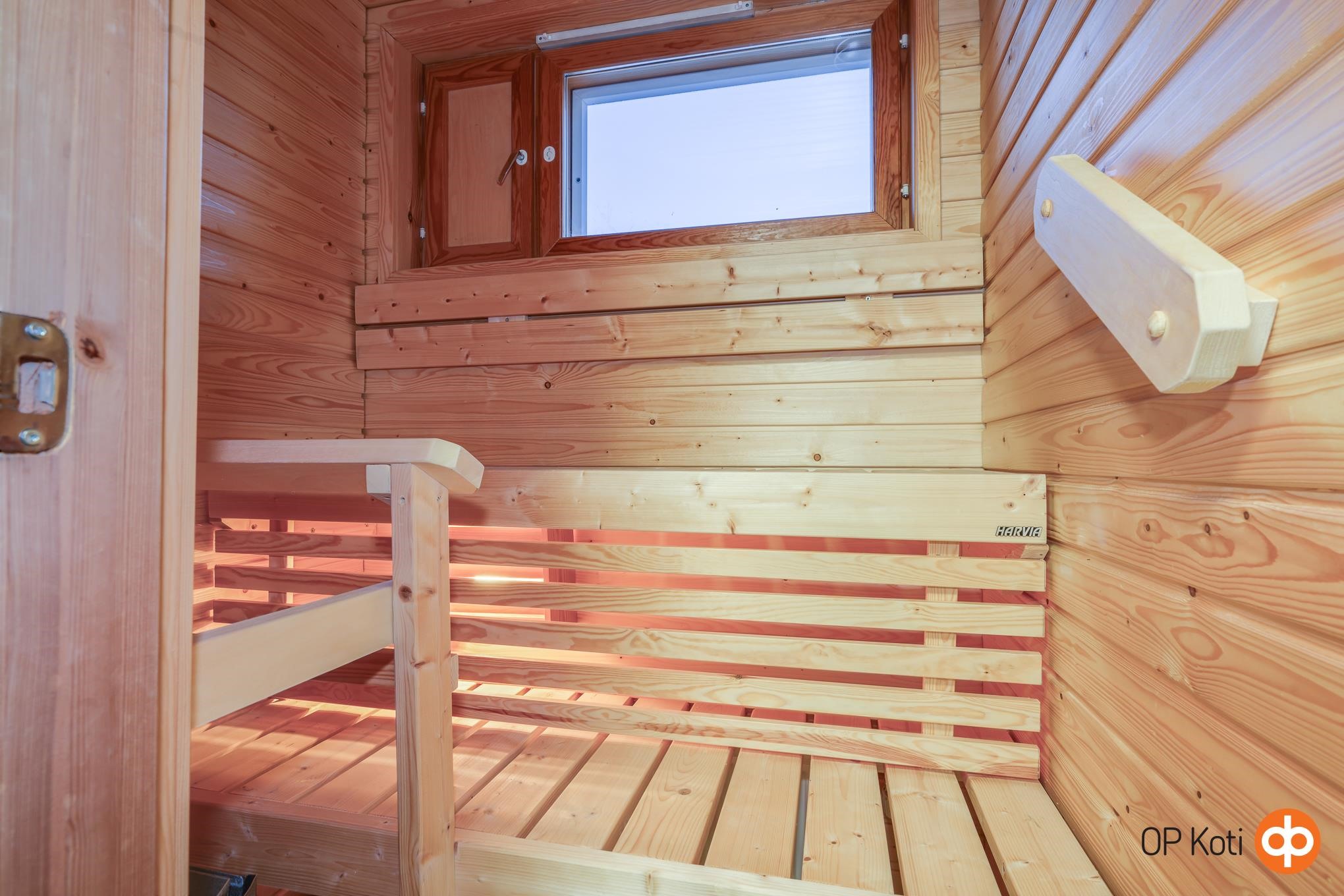 - Sauna, sähkökiuas, kylpyhuone, suihku, peilikaappi, allaskaappi, pesukoneliitäntä, lattialämmitys Sähköinen, kiinteät valaisimet. Sauna ja kylpyhuone täysin remontoitu 2024