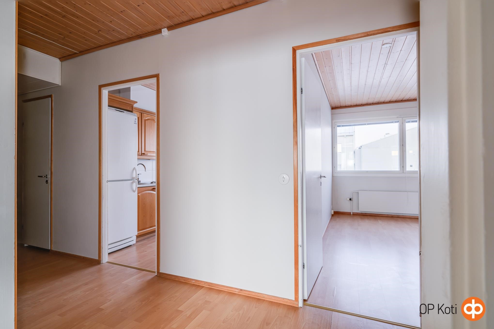 Keittiö: Lattiassa laminaatti, seinät maali / välitilalaatta. Olohuone: Lattiassa laminaatti, seinät maali / tapetti. Makuuhuone: Lattiassa laminaatti, seinät maali. Sauna: Lattiassa laatta, seinät paneeli. Kylpyhuone: Laatoitettu.