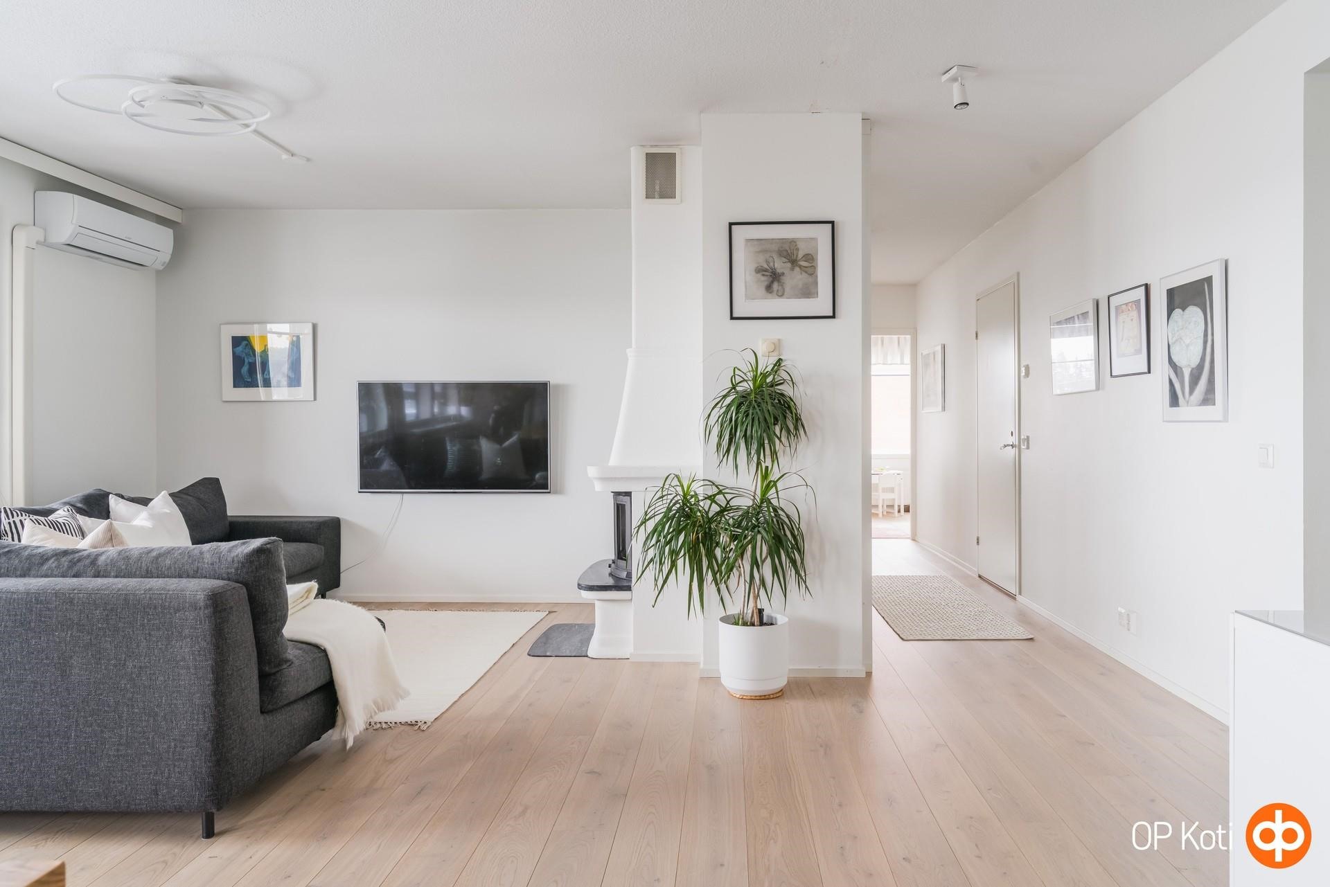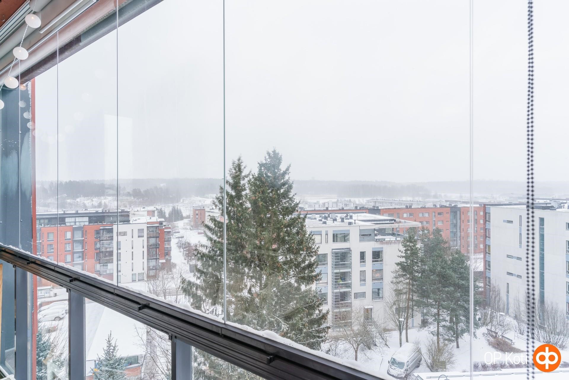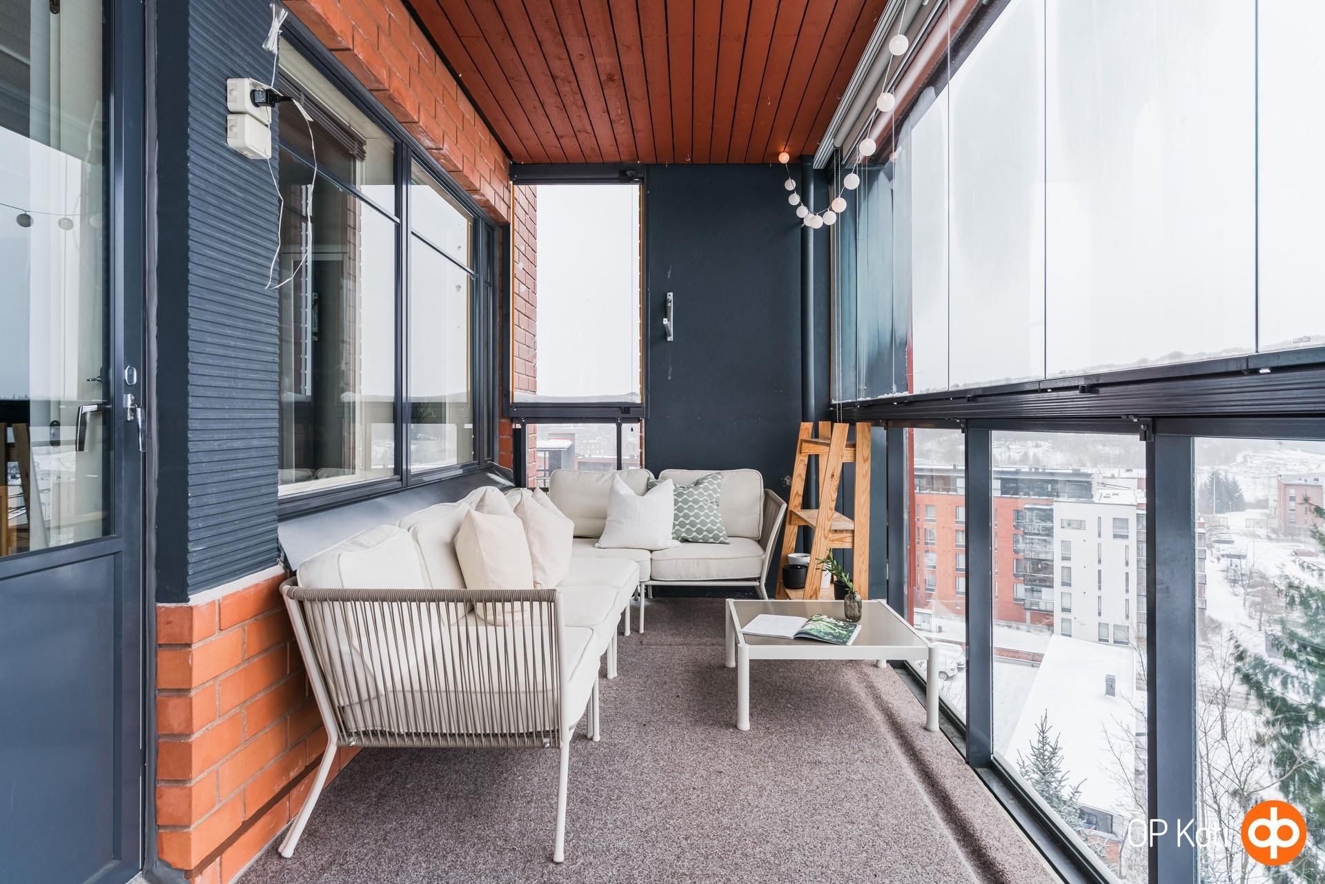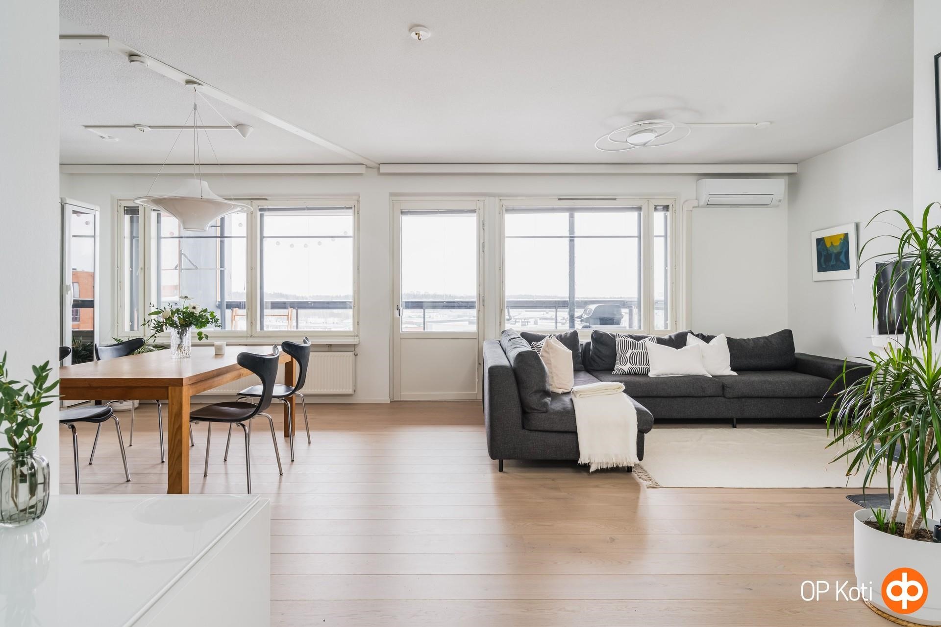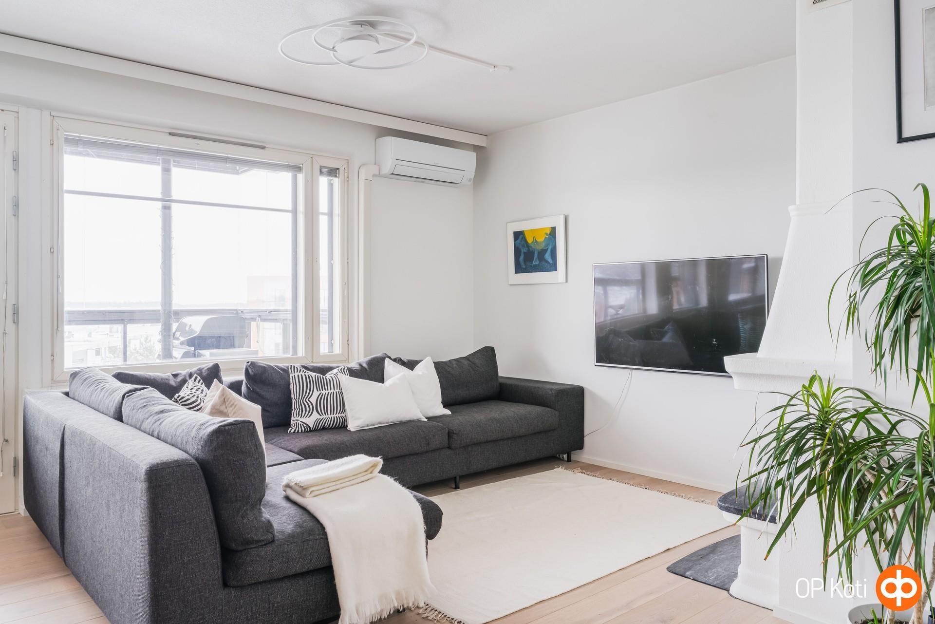 Tilavasta olohuoneesta on käynti suurelle, lasitetulle parvekkeelle, josta aukeaa avarat maisemat yli kattojen yli Viikin pelloille päin. Olohuoneen takan äärellä on mukava lämmitellä ja tunnelmoida talvipakkasilla ja ilmalämpöpumppu puolestaan pitää kodin miellyttävän viileänä kesähelteillä.