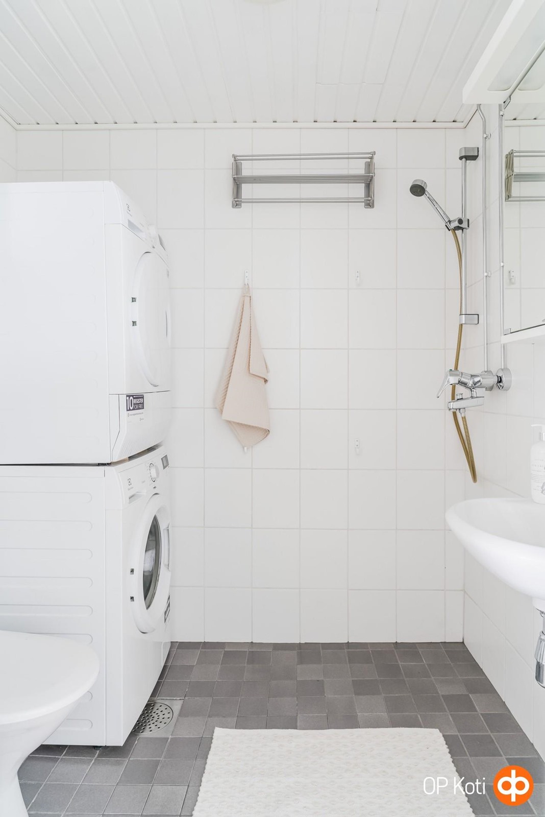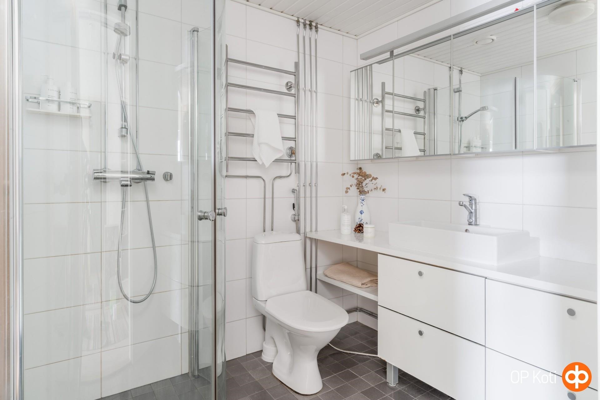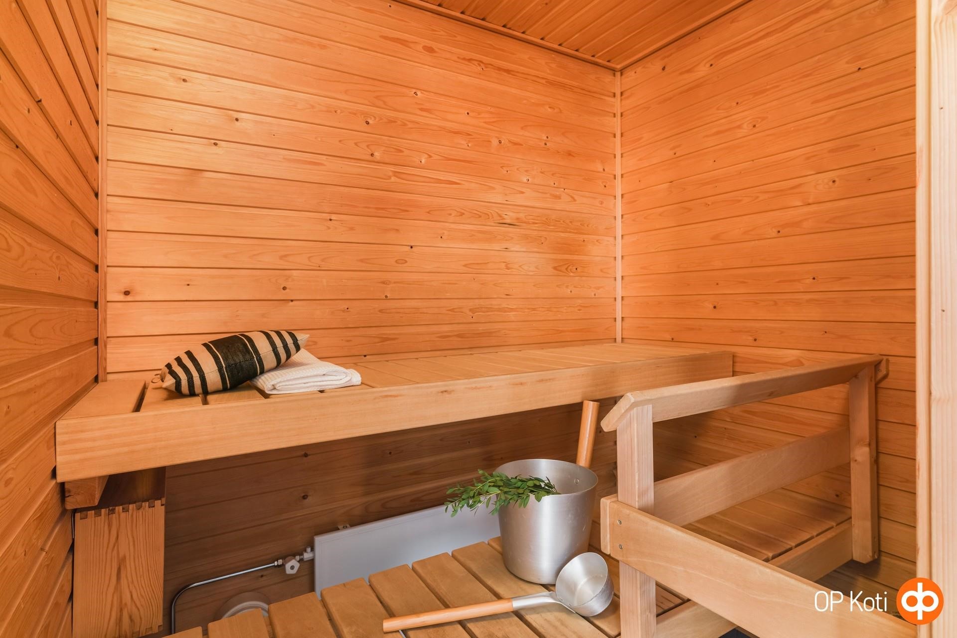 - Sauna, sähkökiuas, kylpyhuone, erillinen wc, suihku, peilikaappi (kph ja wc), kaapit (wc), allaskaappi (kph), pesukoneliitäntä, lattialämmitys (kph), kiinteät valaisimet.