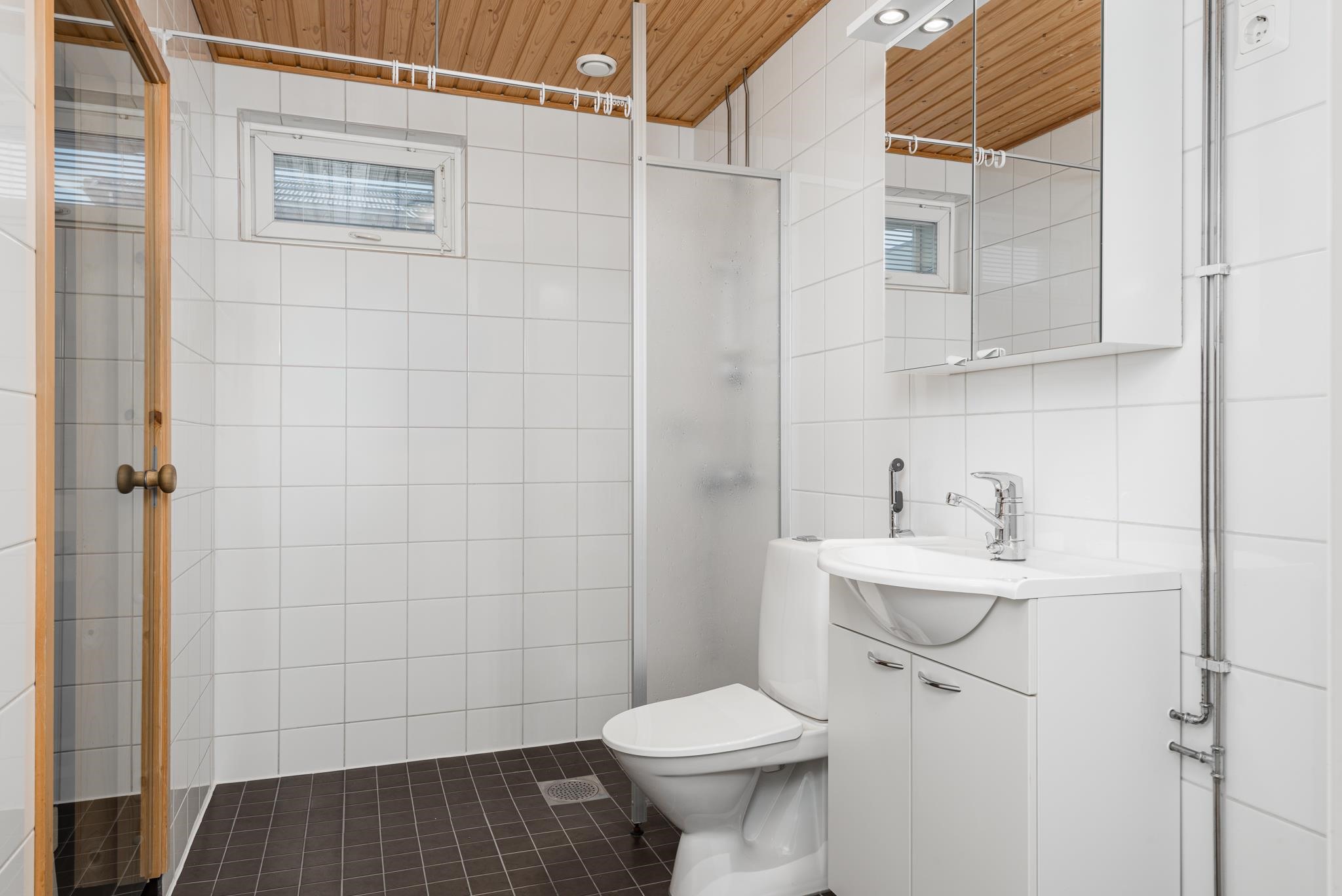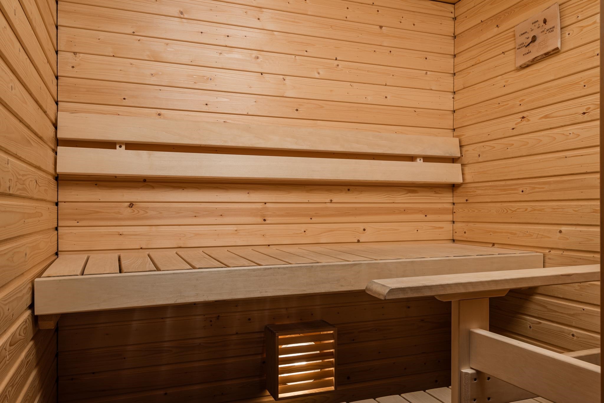 - Sauna, sähkökiuas, suihku, suihkuseinä, peilit, pesukoneliitäntä, lattialämmitys, kiinteät valaisimet.