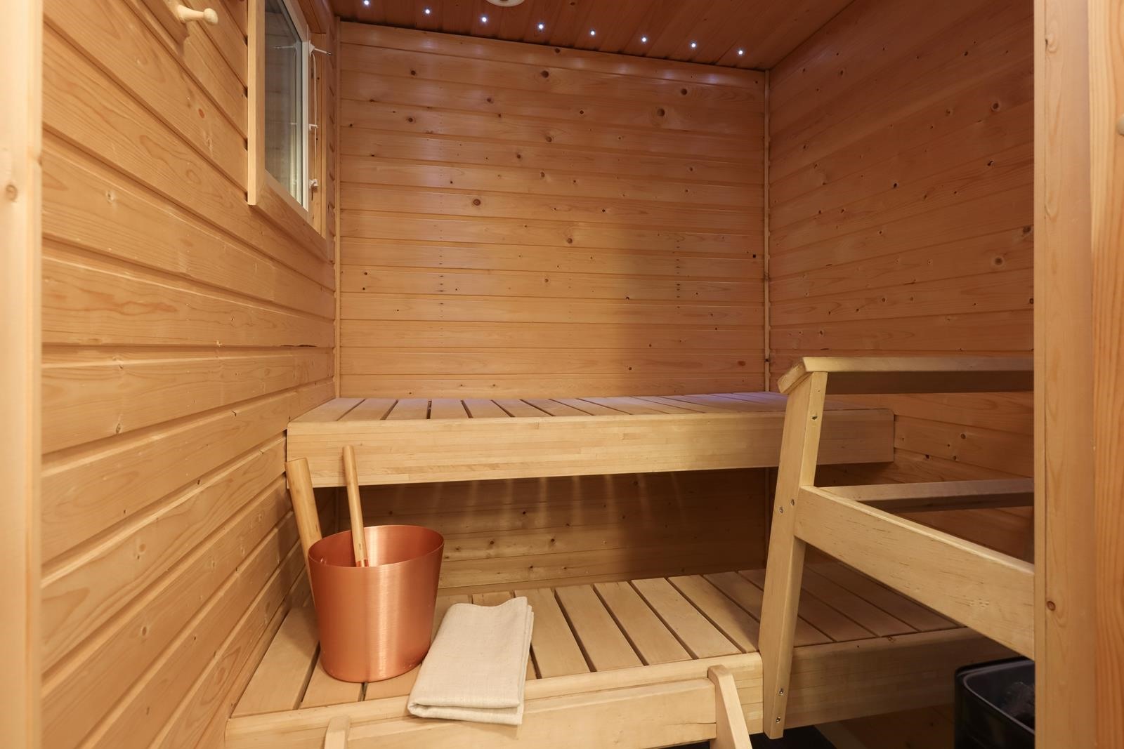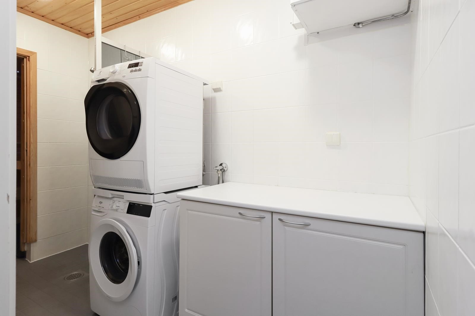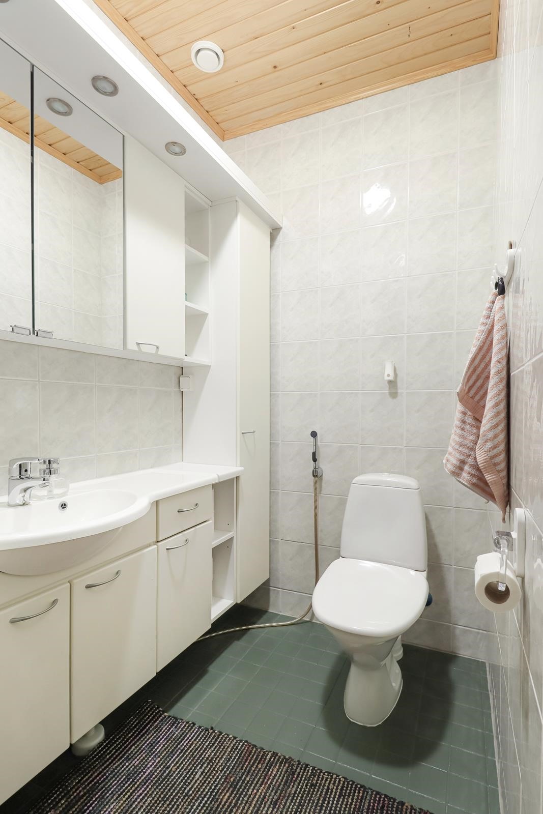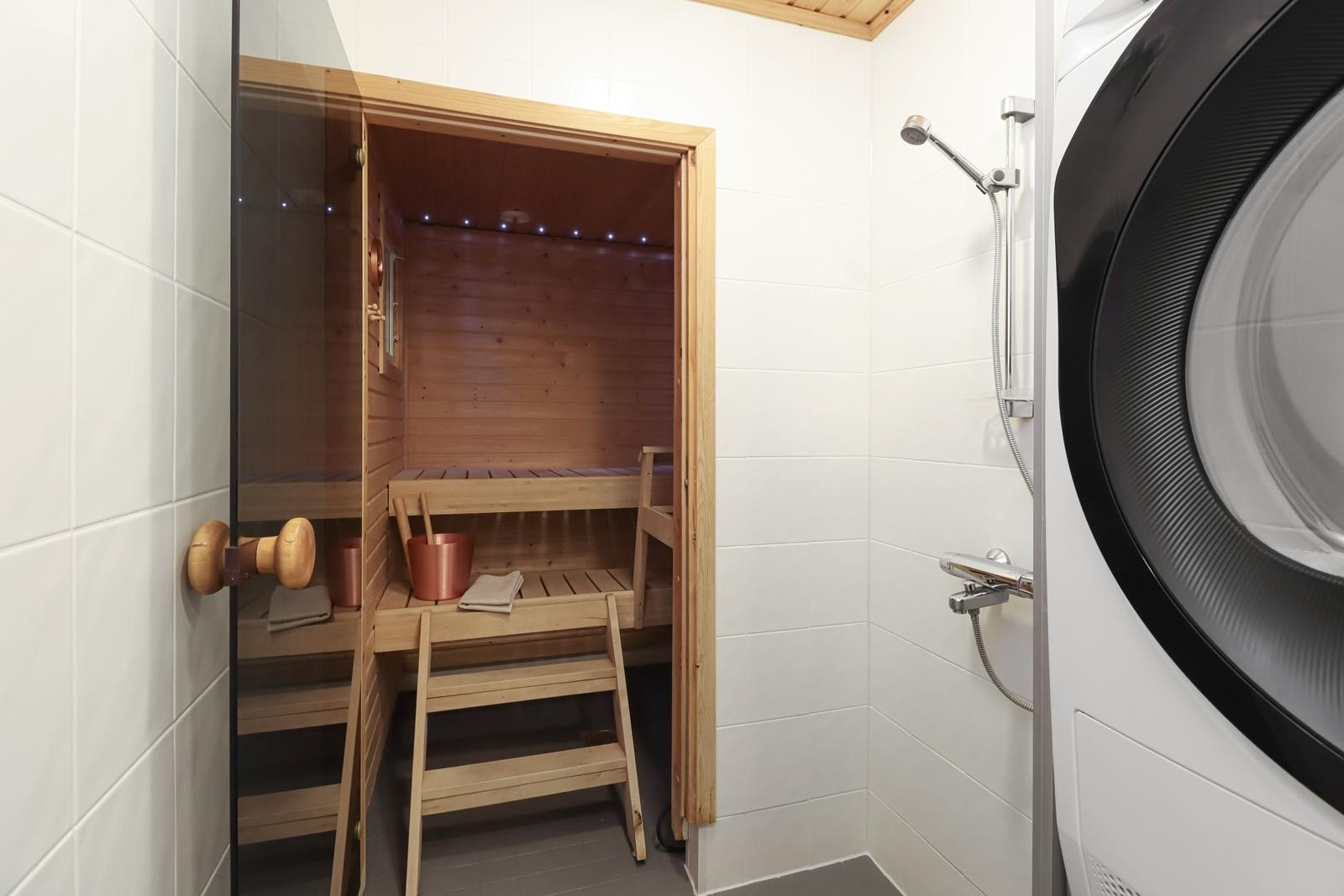 - Sauna, sähkökiuas, kylpyhuone, erillinen wc, suihku, suihkuseinä, pesukoneliitäntä, lattialämmitys vesikiertoinen, kiinteät valaisimet. Kaakelit maalattu