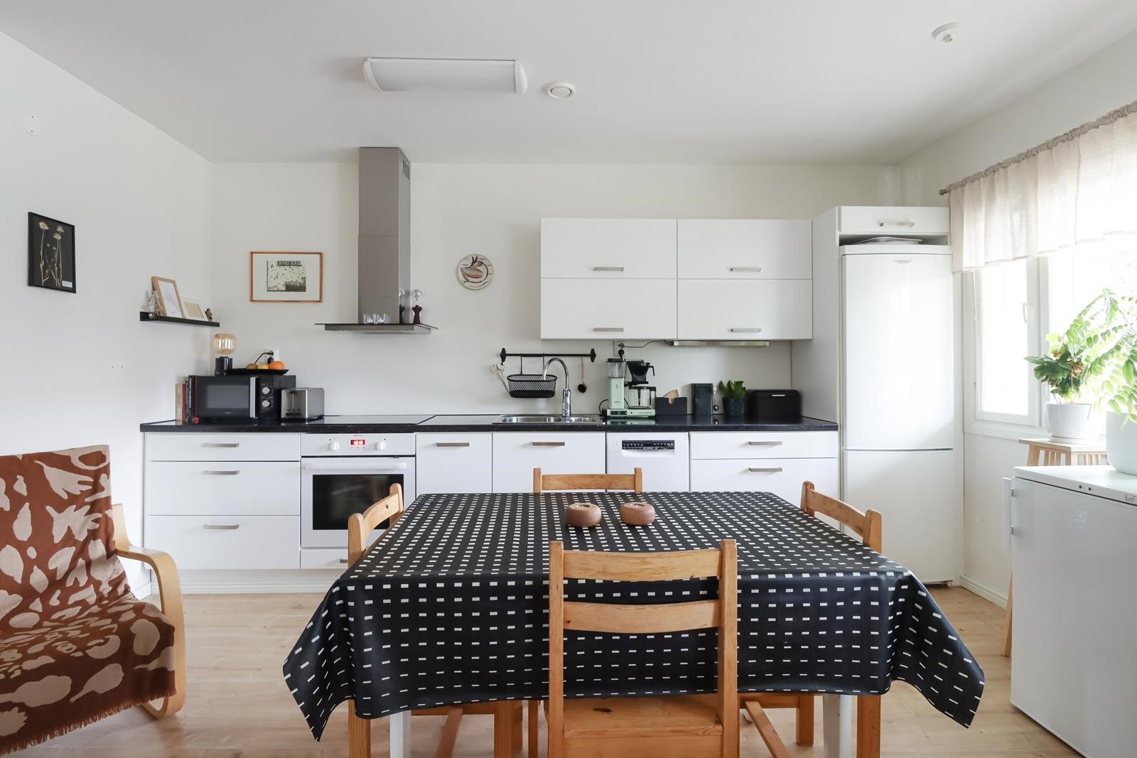 - Jääkaappipakastin, erillisuuni, liesitaso, keraaminen liesi, liesituuletin, astianpesukone, kaapistot, kiinteät valaisimet.