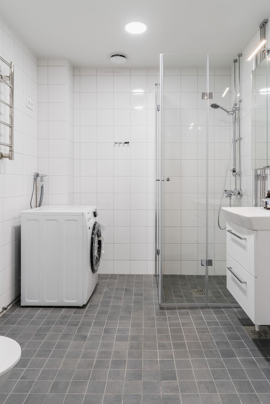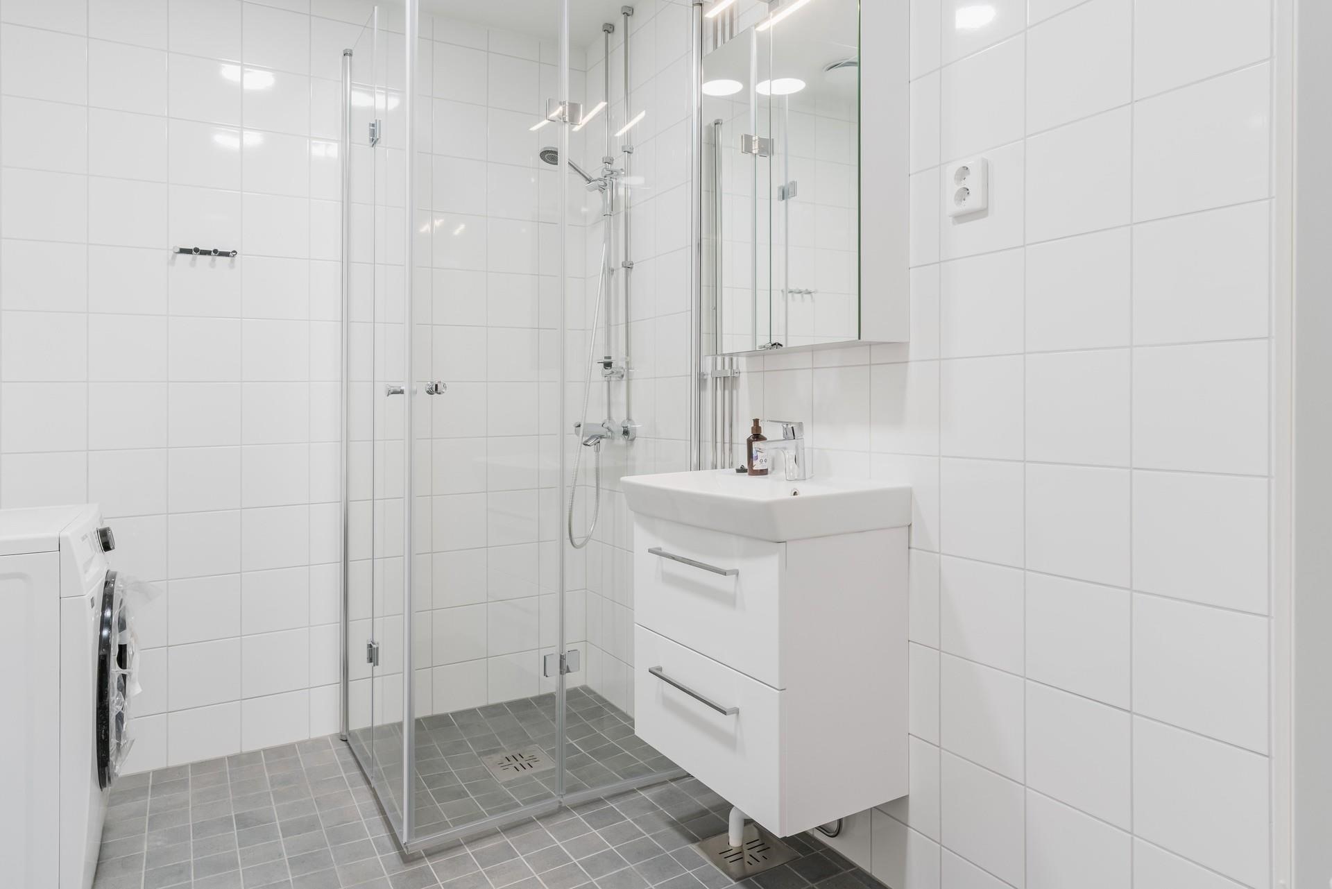 - Kylpyhuoneessa peilikaappi, allaskaappi, pesukoneliitäntä, mukavuuslattialämmitys (huoneiston sähkömittariin), kiinteät valaisimet.
