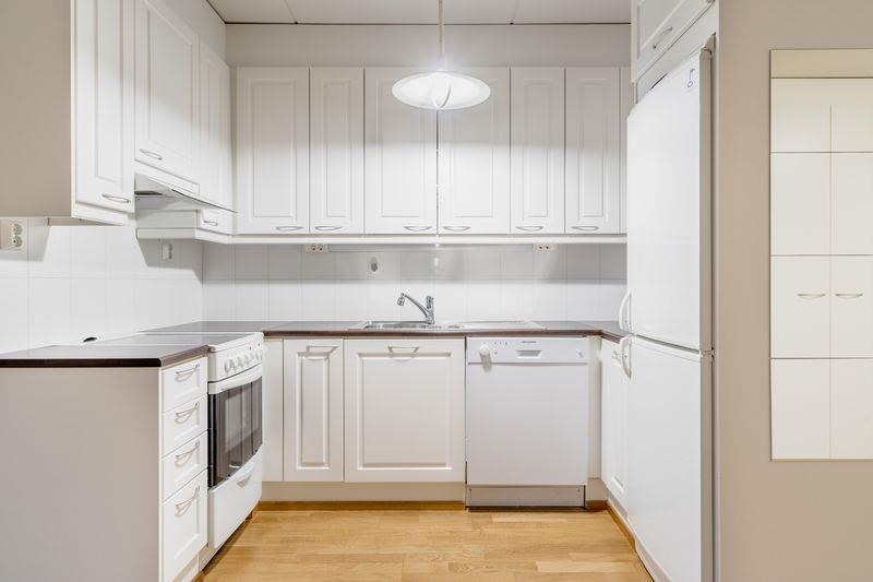 - Jääkaappipakastin, keraaminen liesi, liesituuletin, astianpesukone, kaapistot, kiinteät valaisimet.