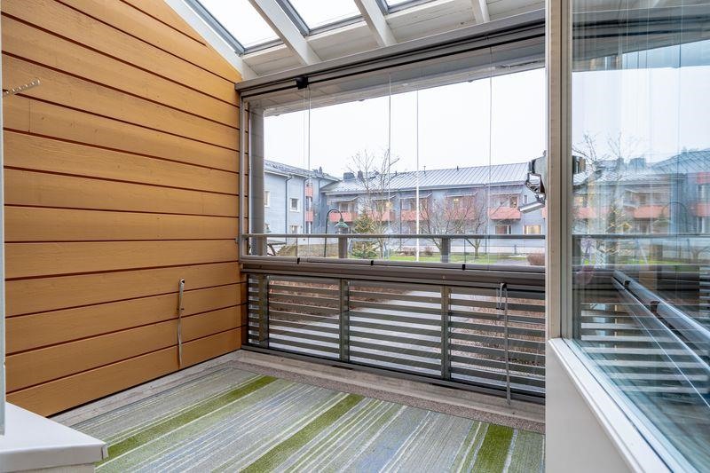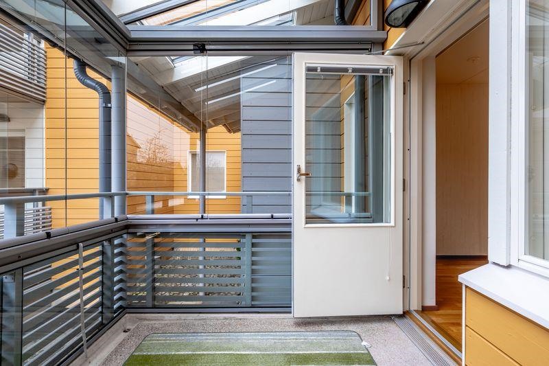 - Lasitettu parveke länteen, vehreälle sisäpihalle päin.