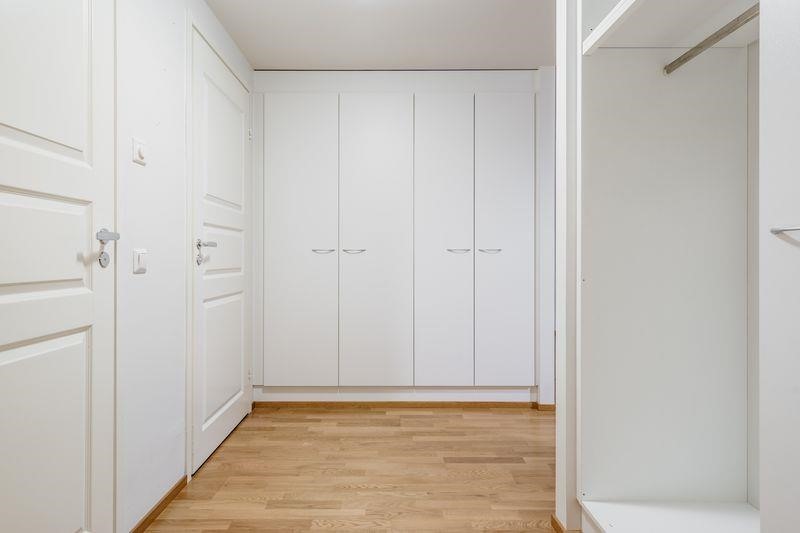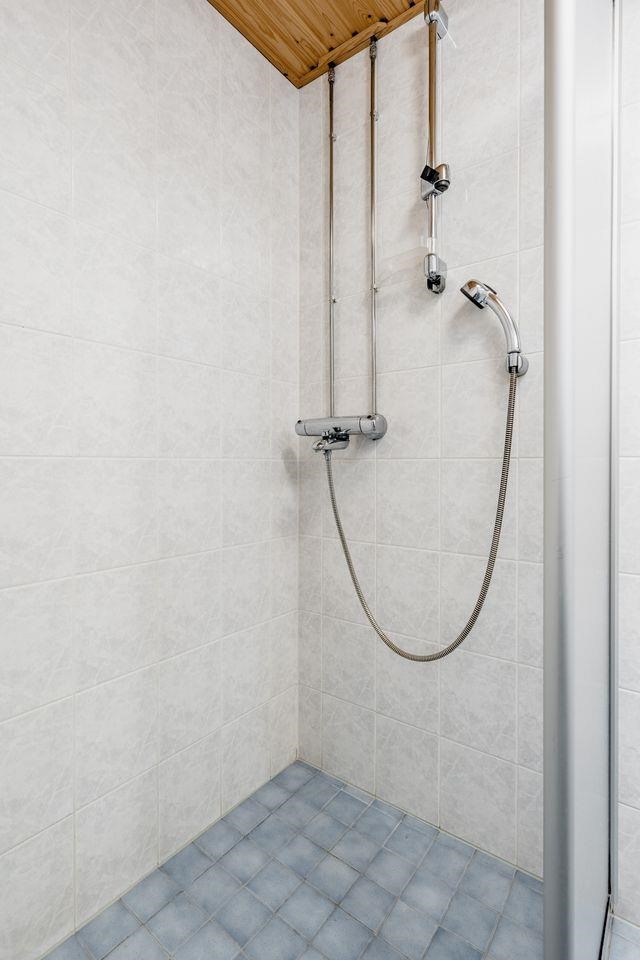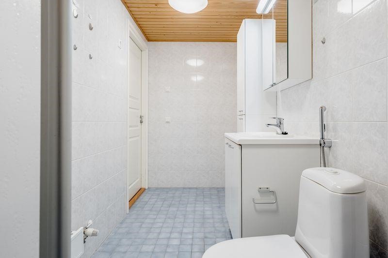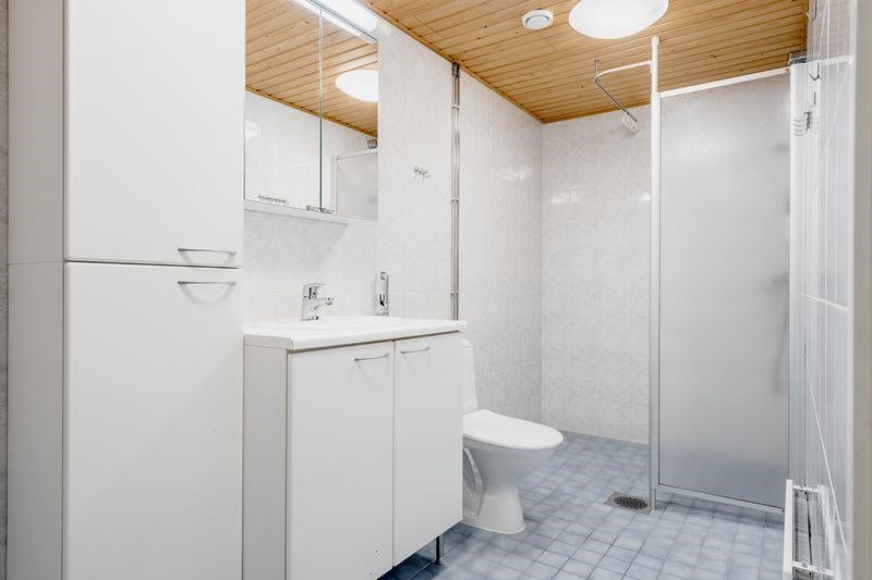 - Kylpyhuone, suihku, suihkuseinä, peilikaappi, kaapit, allaskaappi, pesukoneliitäntä, lattialämmitys, kiinteät valaisimet.