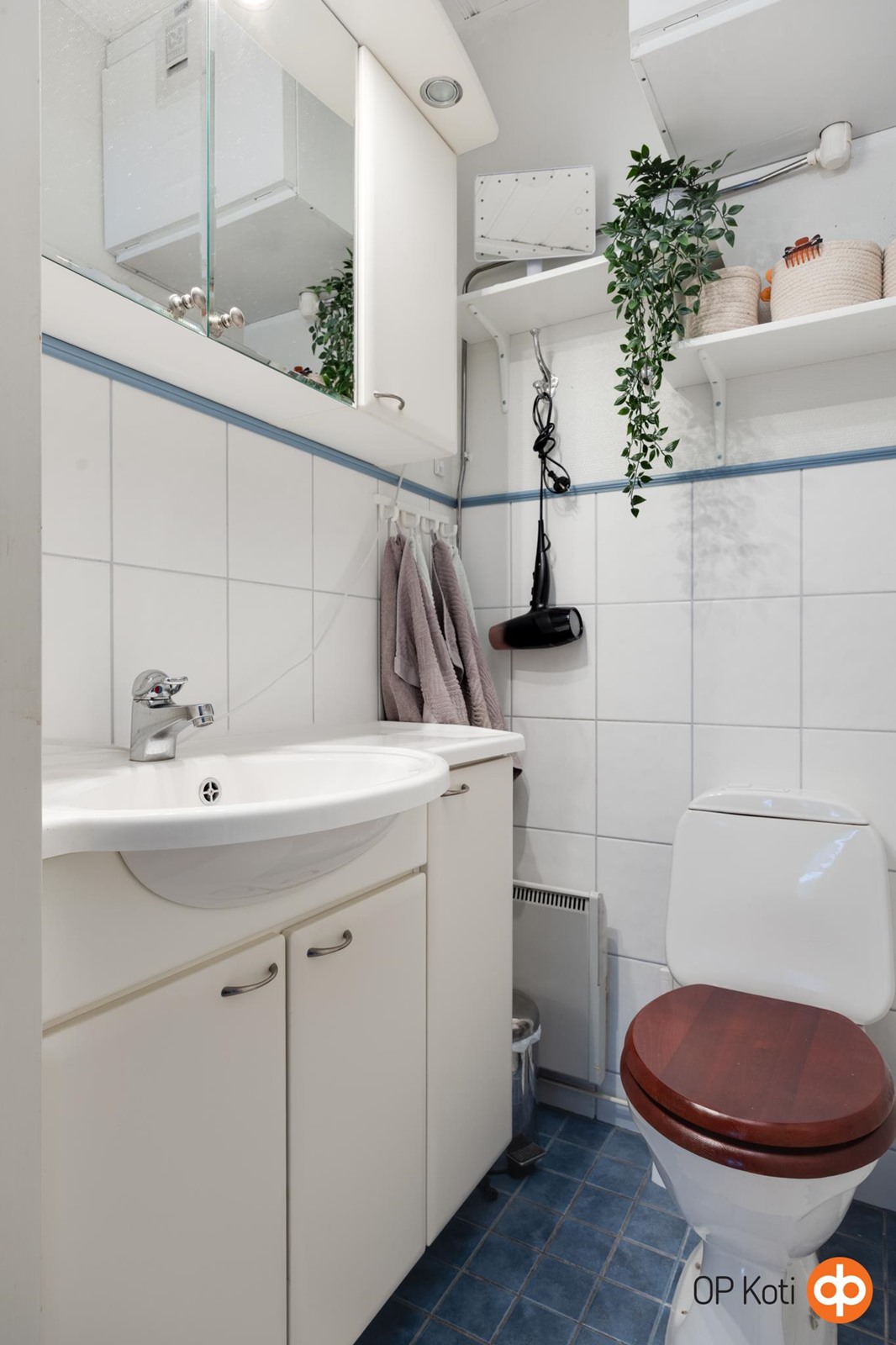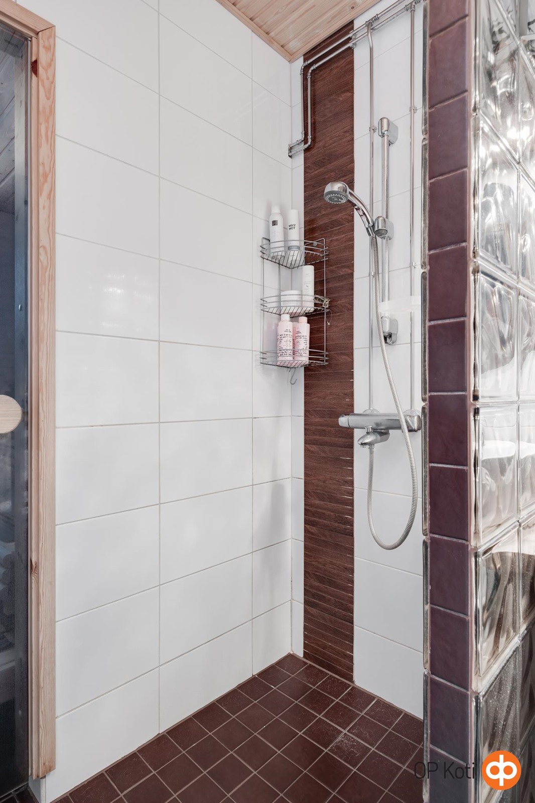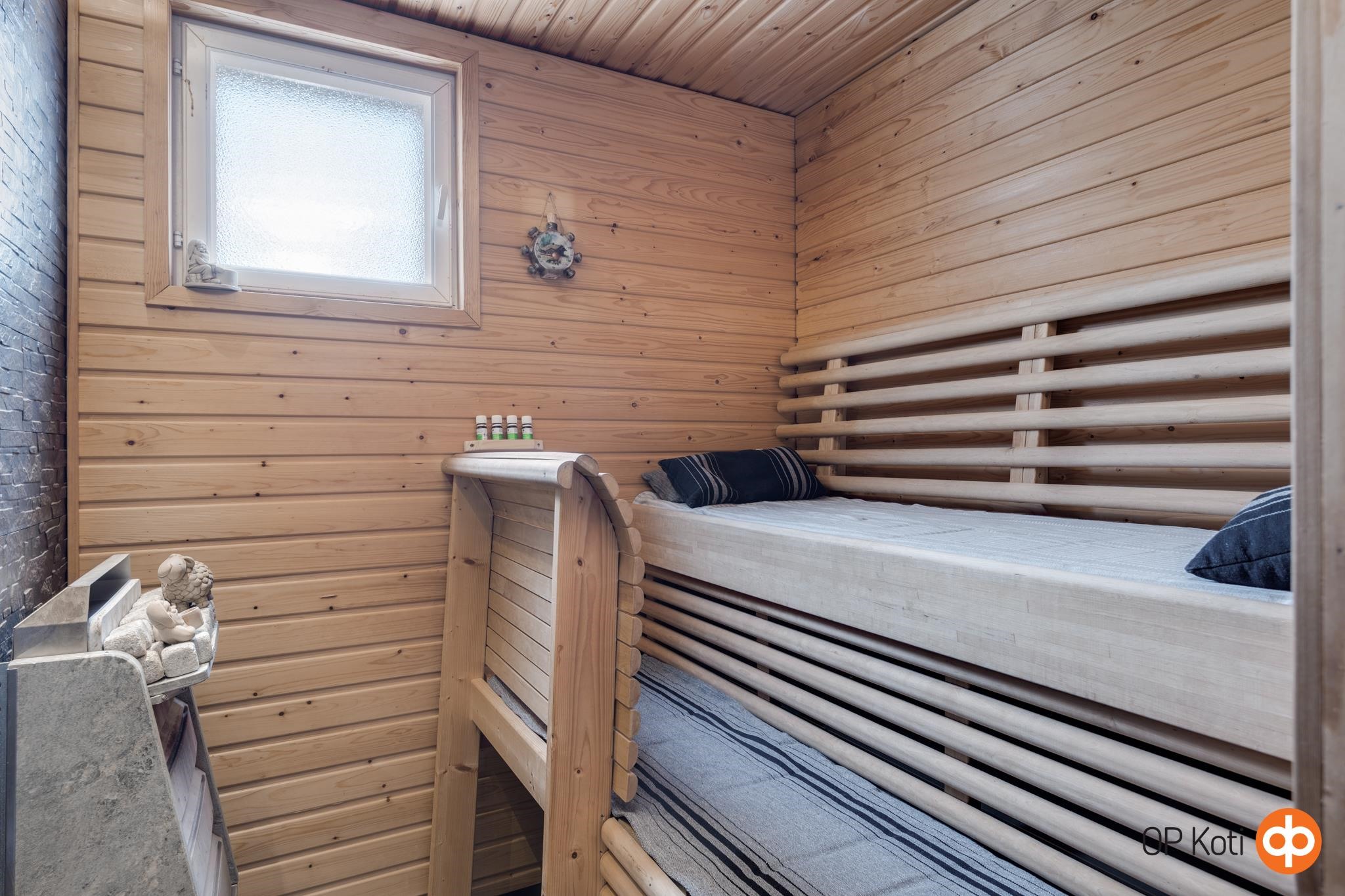- Sauna, sähkökiuas, kylpyhuone, erillinen wc, suihku, suihkuseinä, peilit, kaapit, allaskaappi (erillisessä wc:ssä), lattialämmitys, kiinteät valaisimet.