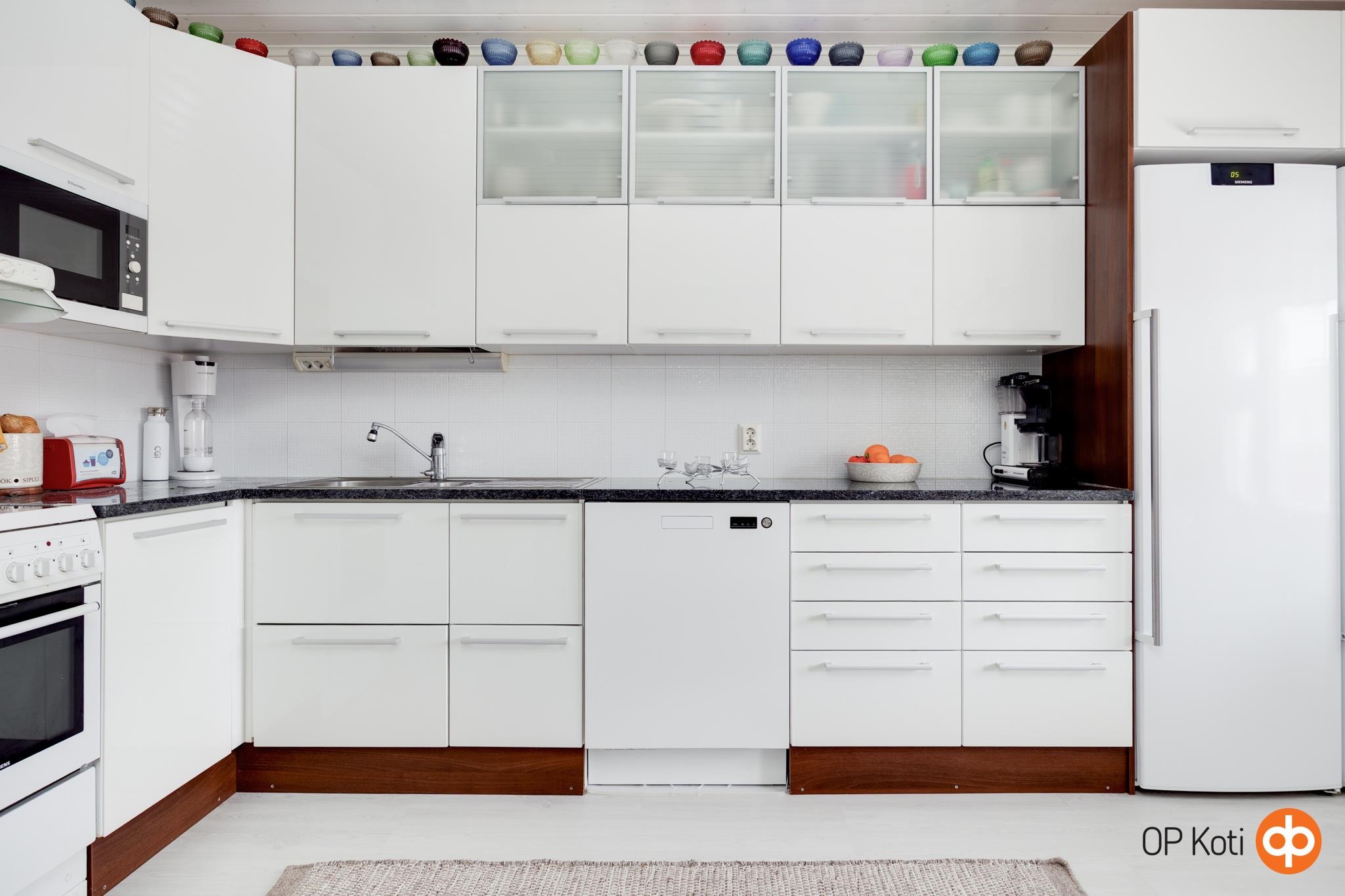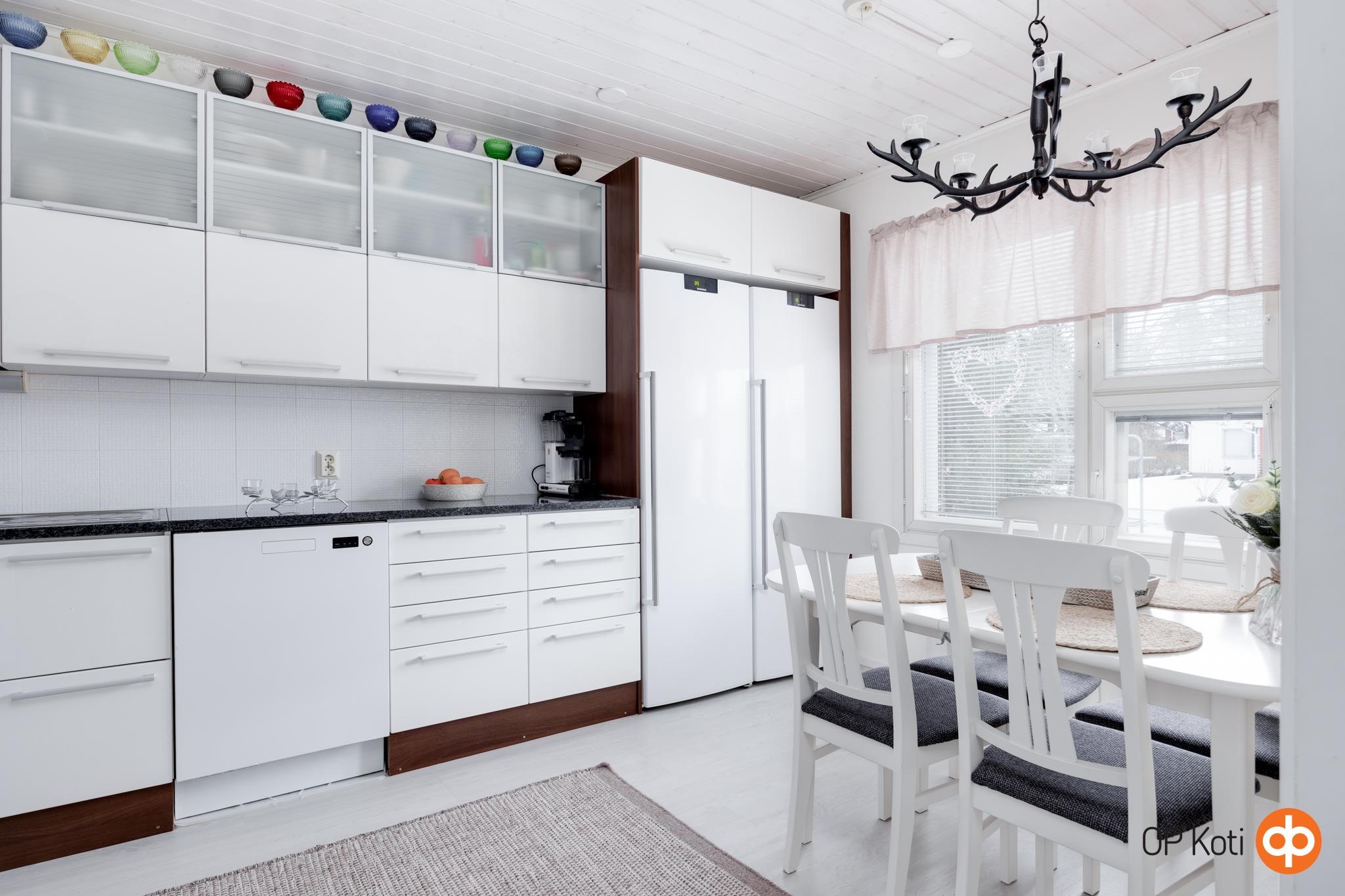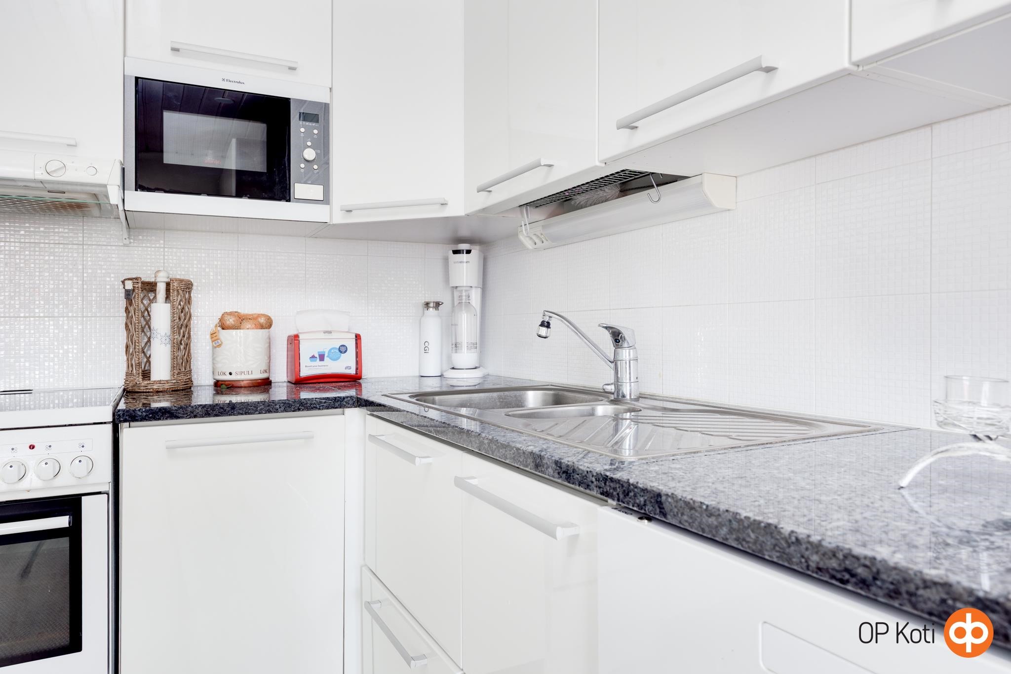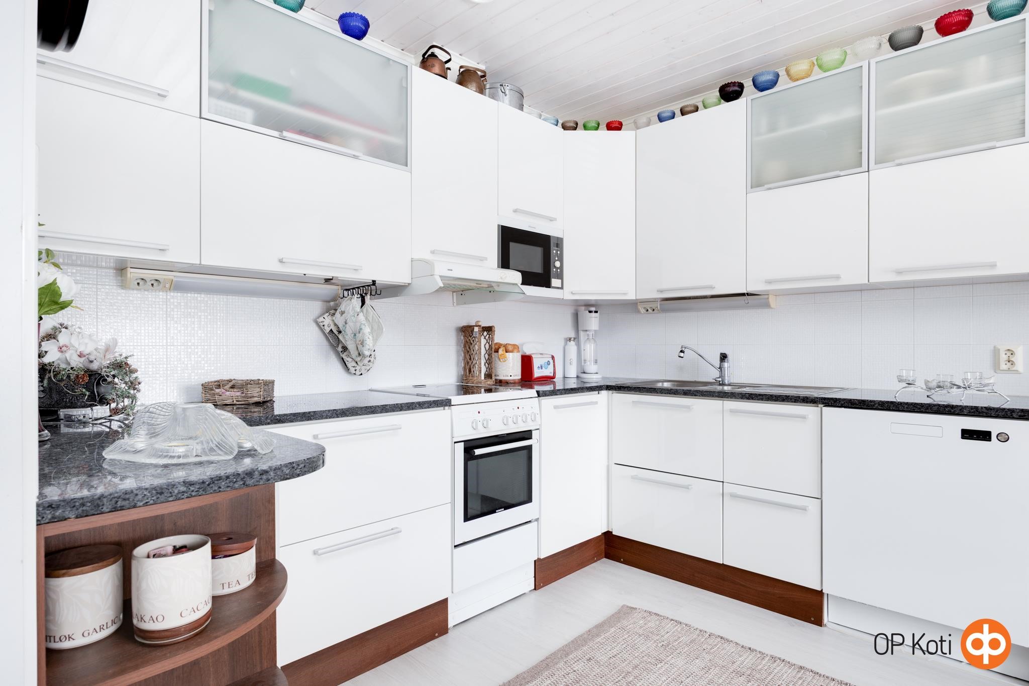 - Jääkaappi, pakastekaappi, lattialiesi, sähköliesi, liesituuletin, astianpesukone (uusittu v. 2024), kaapistot, kiinteät valaisimet.