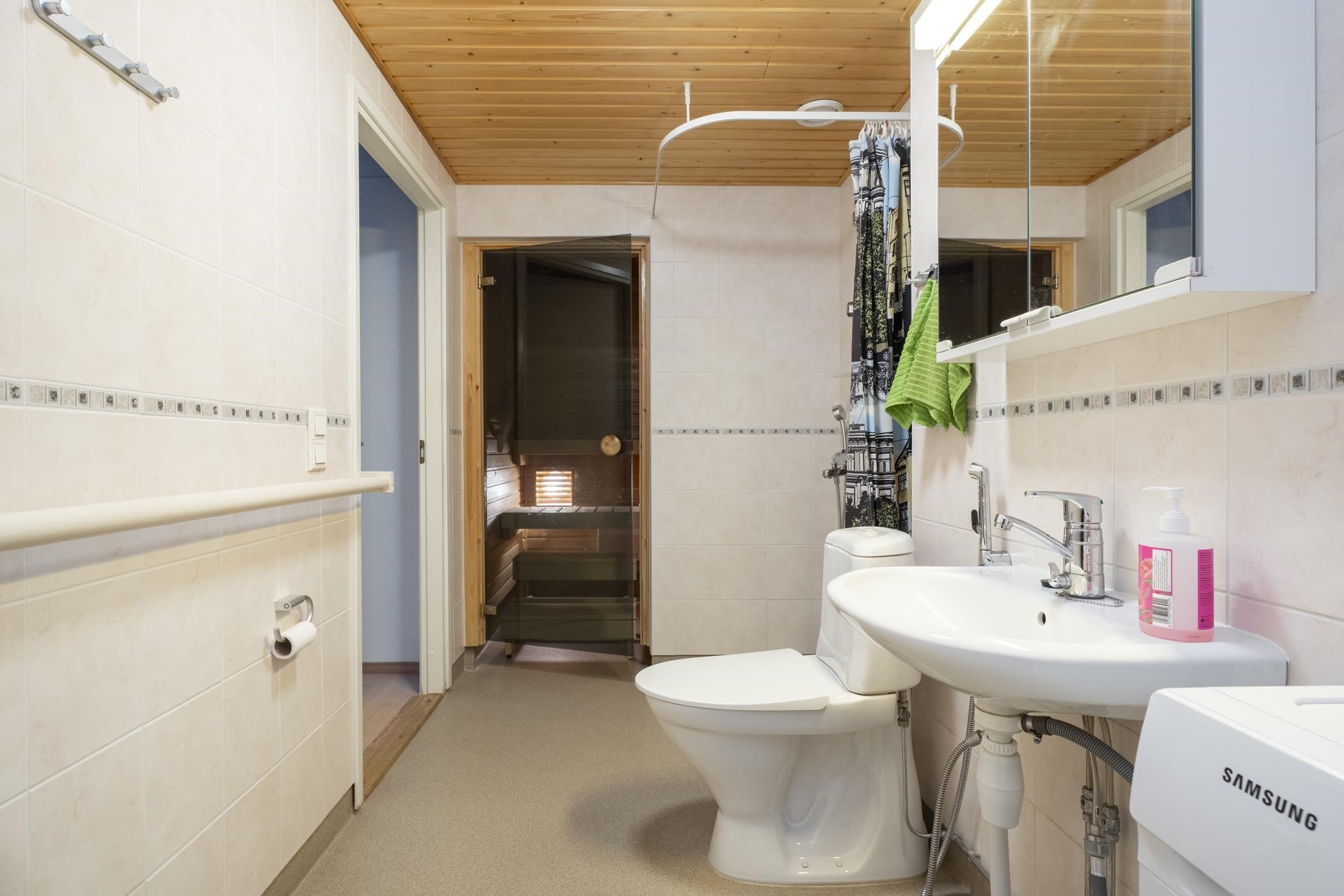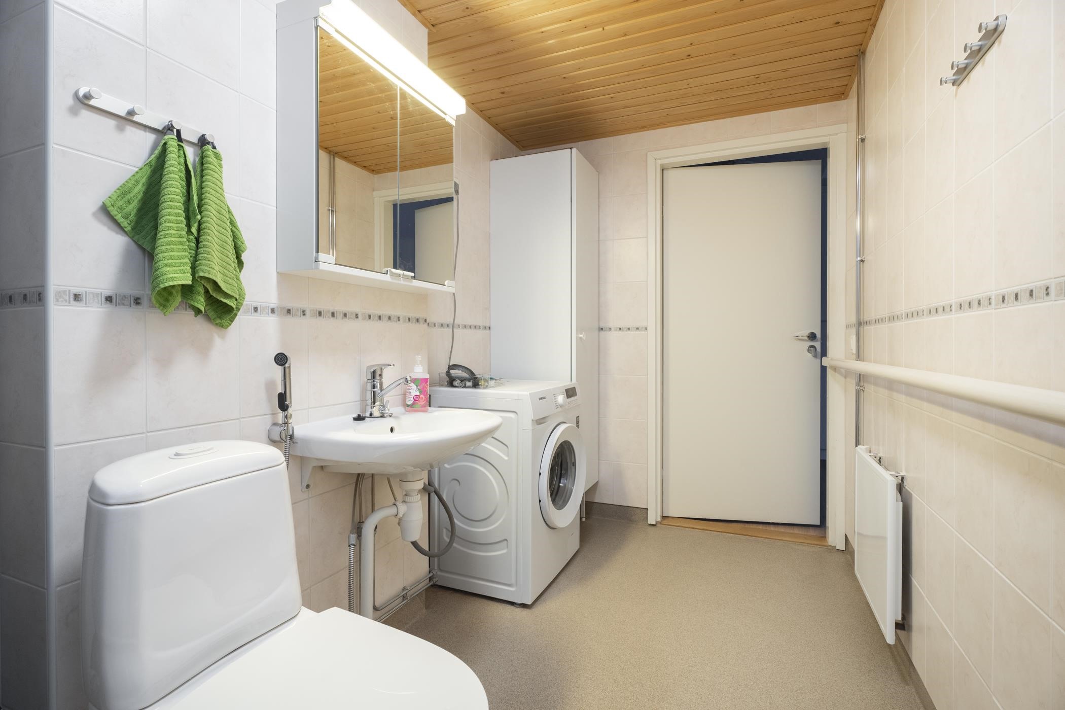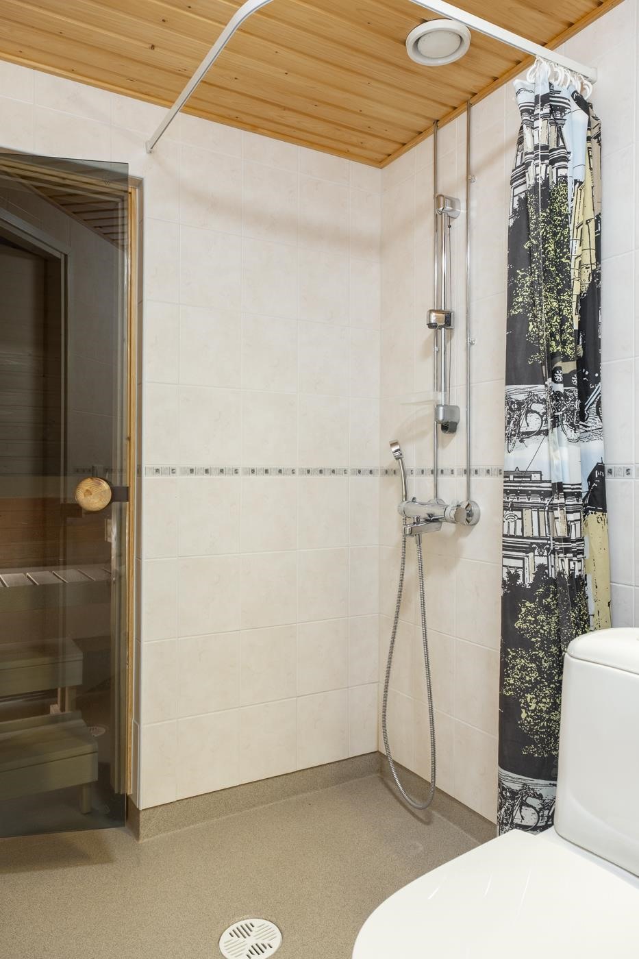 - Saunassa on sähkökiuas, kylpyhuoneessa on suihku, peilikaappi, kiinteät valaisimet, pesukoneliitäntä sekä pesukone (kuuluu kauppaan ostajan halutessa).
