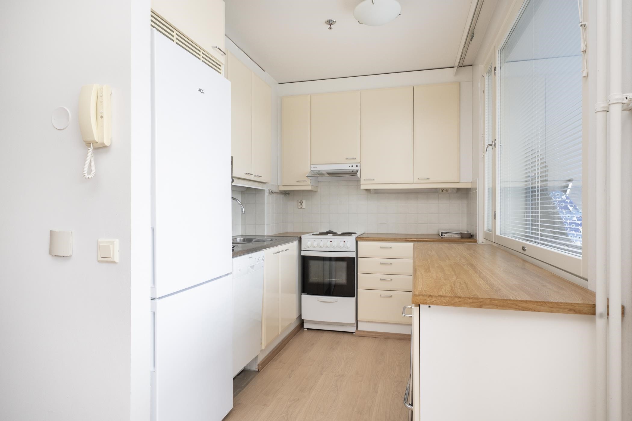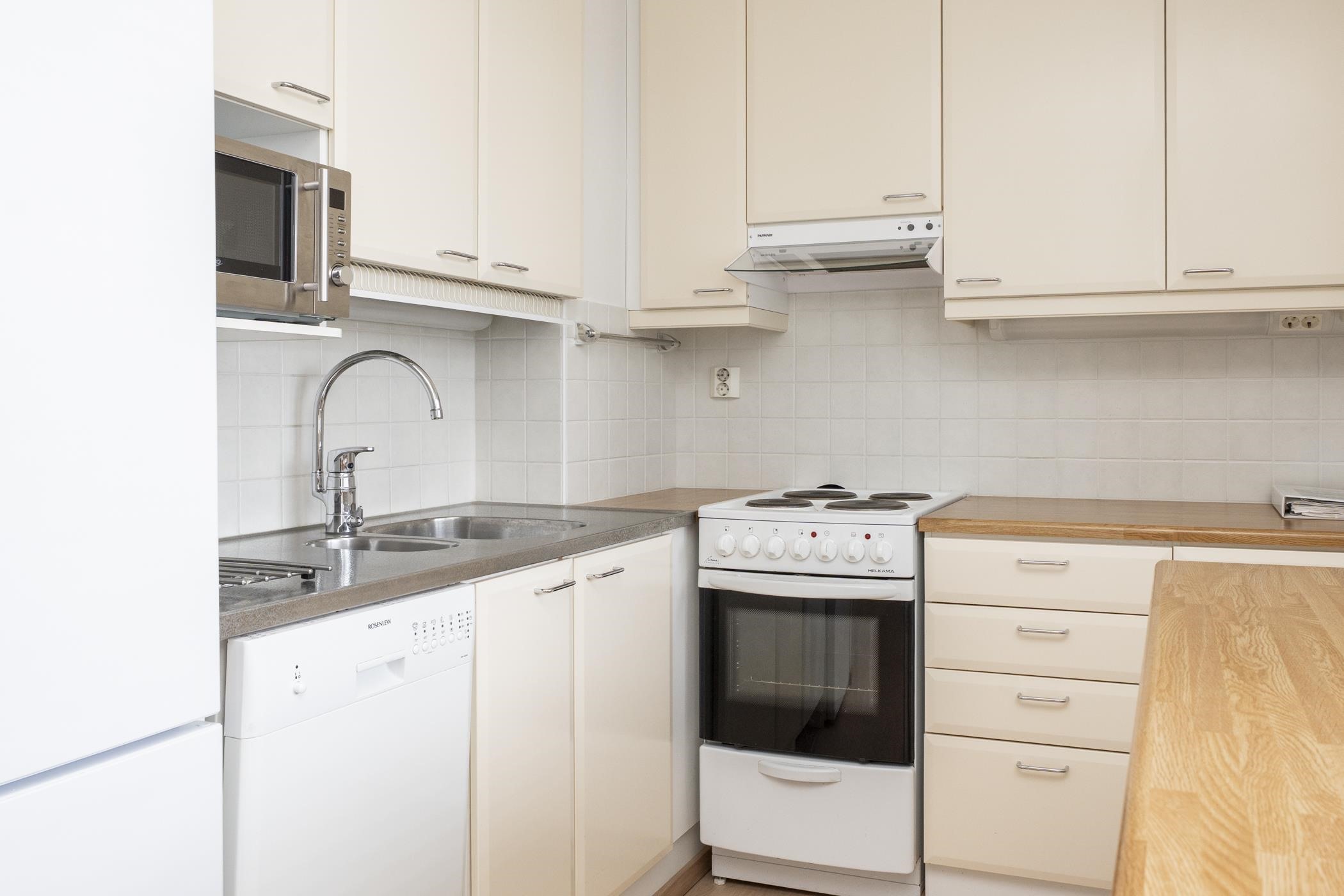 - Keittiössä on jääkaappipakastin (uusittu vuonna 2025), lattialiesi, liesituuletin, astianpesukone, kaapistot sekä kiinteät valaisimet.
