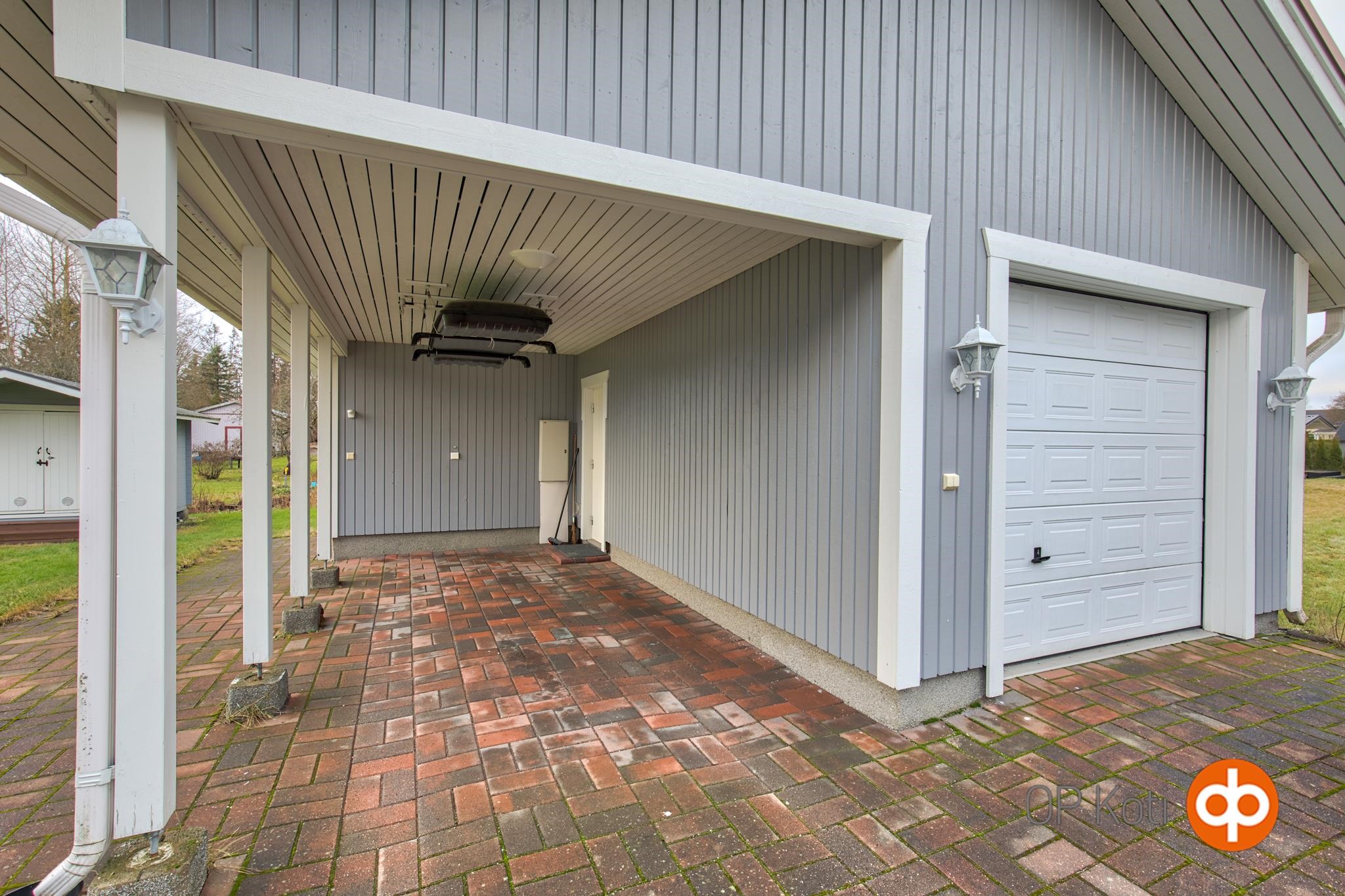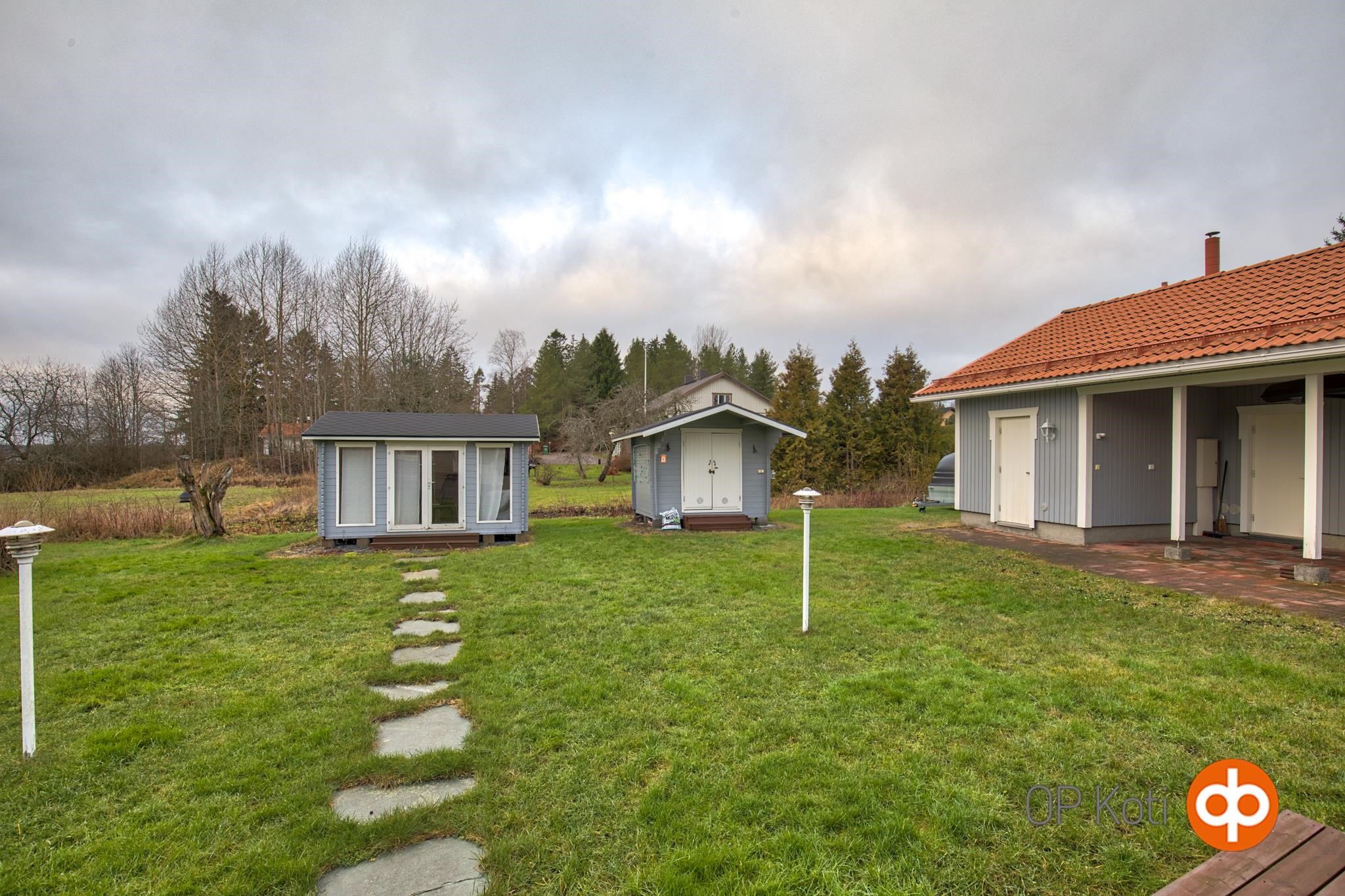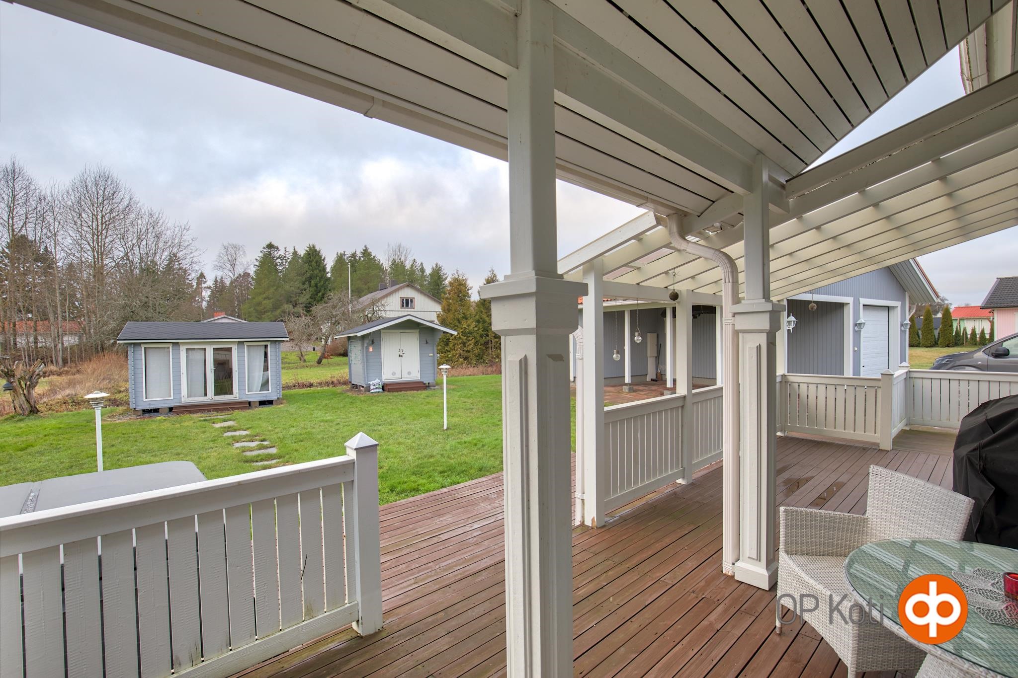 Pihalta löytyy myös monien mahdollisuuksien piharakennus, jossa on autotalli, autokatos ja varastotilaa. Pihamaalla on myös kesäkeittö ja puuvarasto.