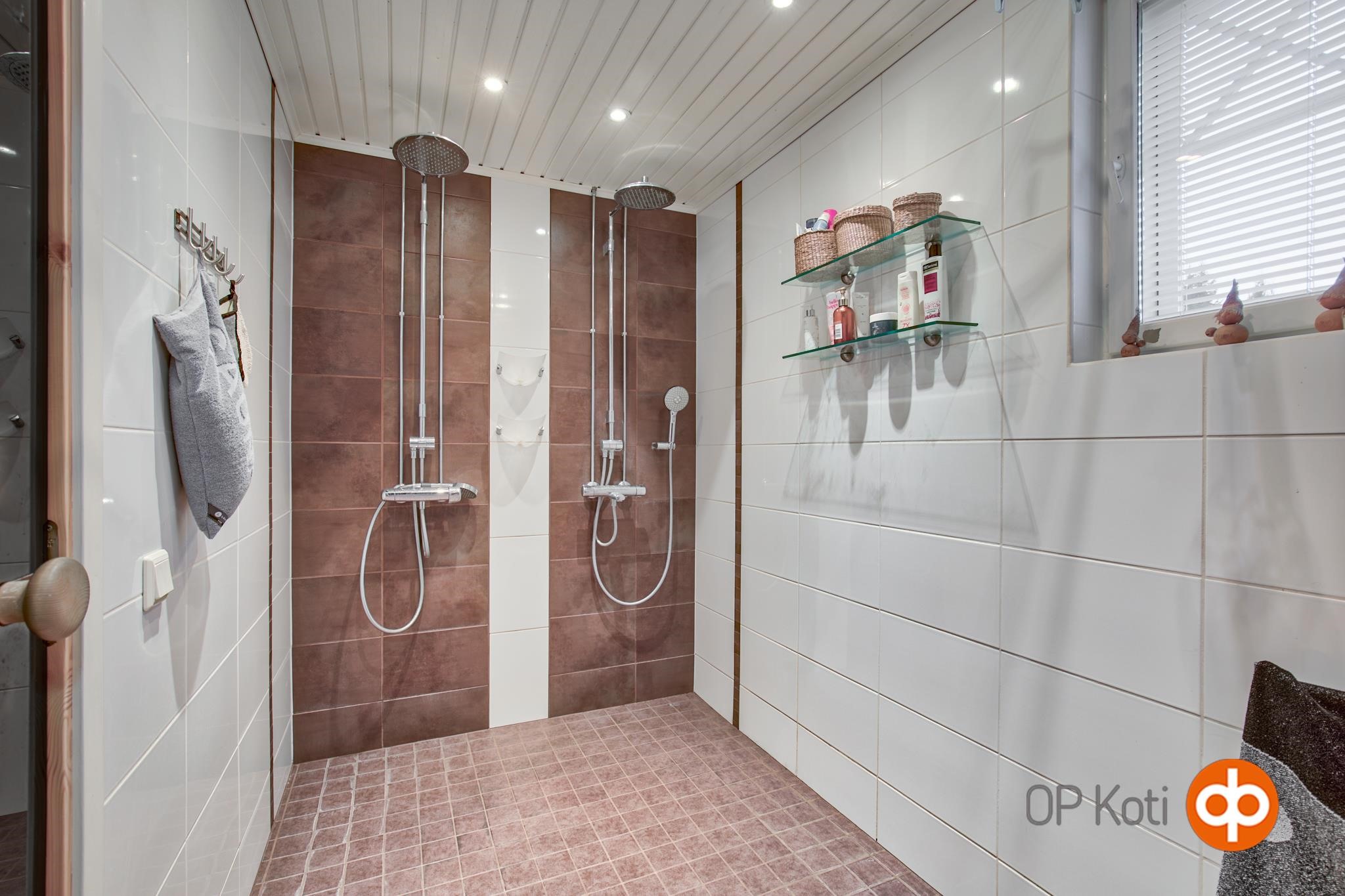 Saunatilat ovat käytönnölliset. Saunan lauteita riittää koko perheelle ja hetivalmiin-kiukaan lempeissä löylyissä mieli lepää. Kylpyhuoneessa on suihkuja kaksin kappalein. Kodinhoitohuoneessa löytyy hyvin säilytystilaa ja pyykkihuolto toimii erinomaisesti. Tilasta on myös kulku ulos.