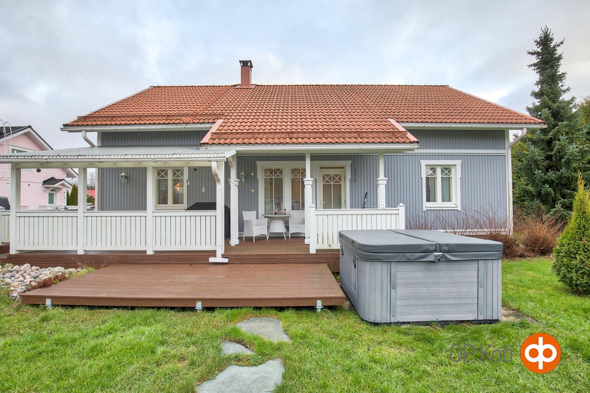 Takapihan terassille on käynti olohuoneesta ja siellä on mukava istahtaa tai vaikka vilvoittelemaan löylyjen välissä. Vai haluatko mieluummin hektisen päivän päätteeksi pulahtaa porealtaaseen?