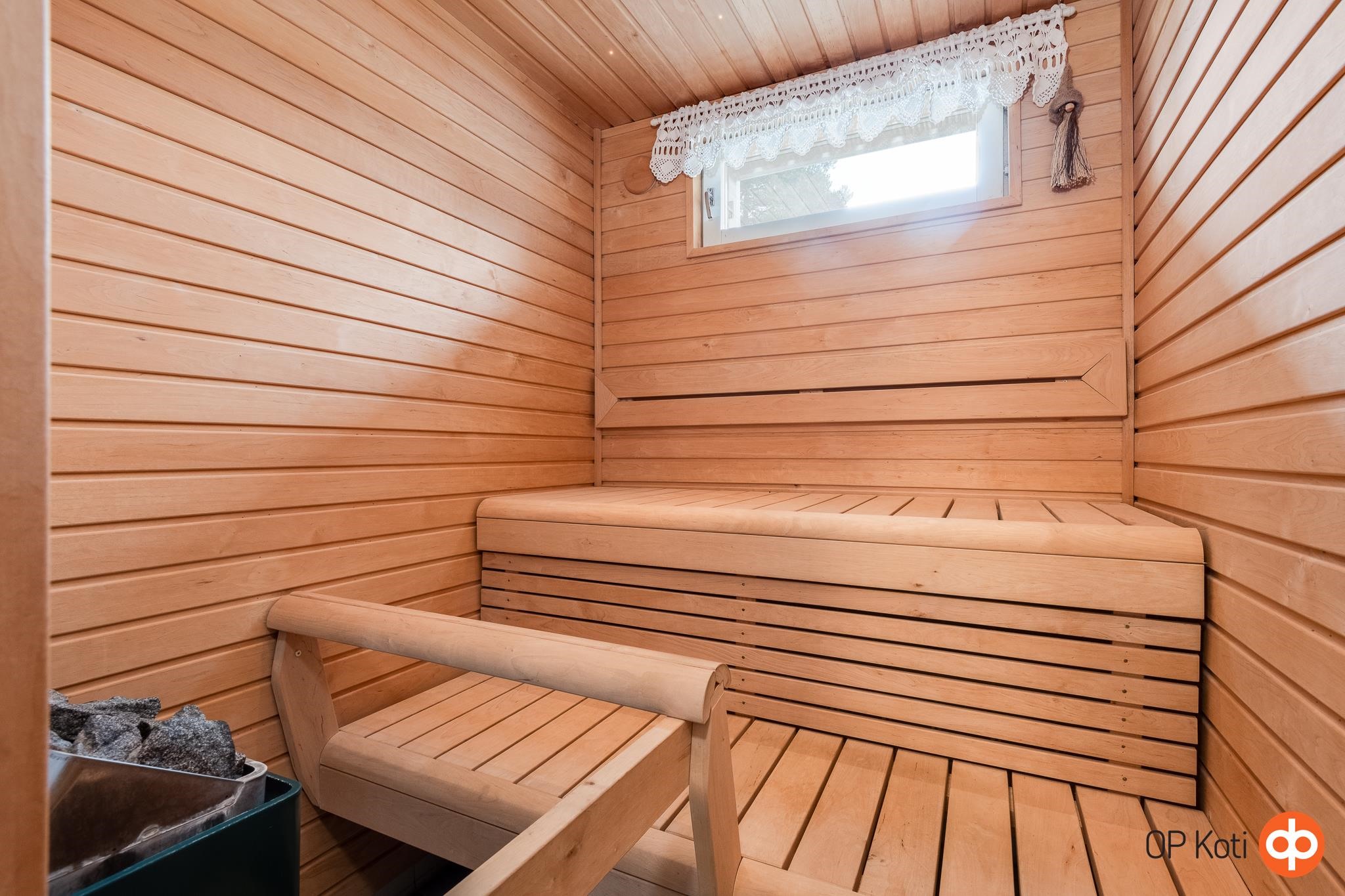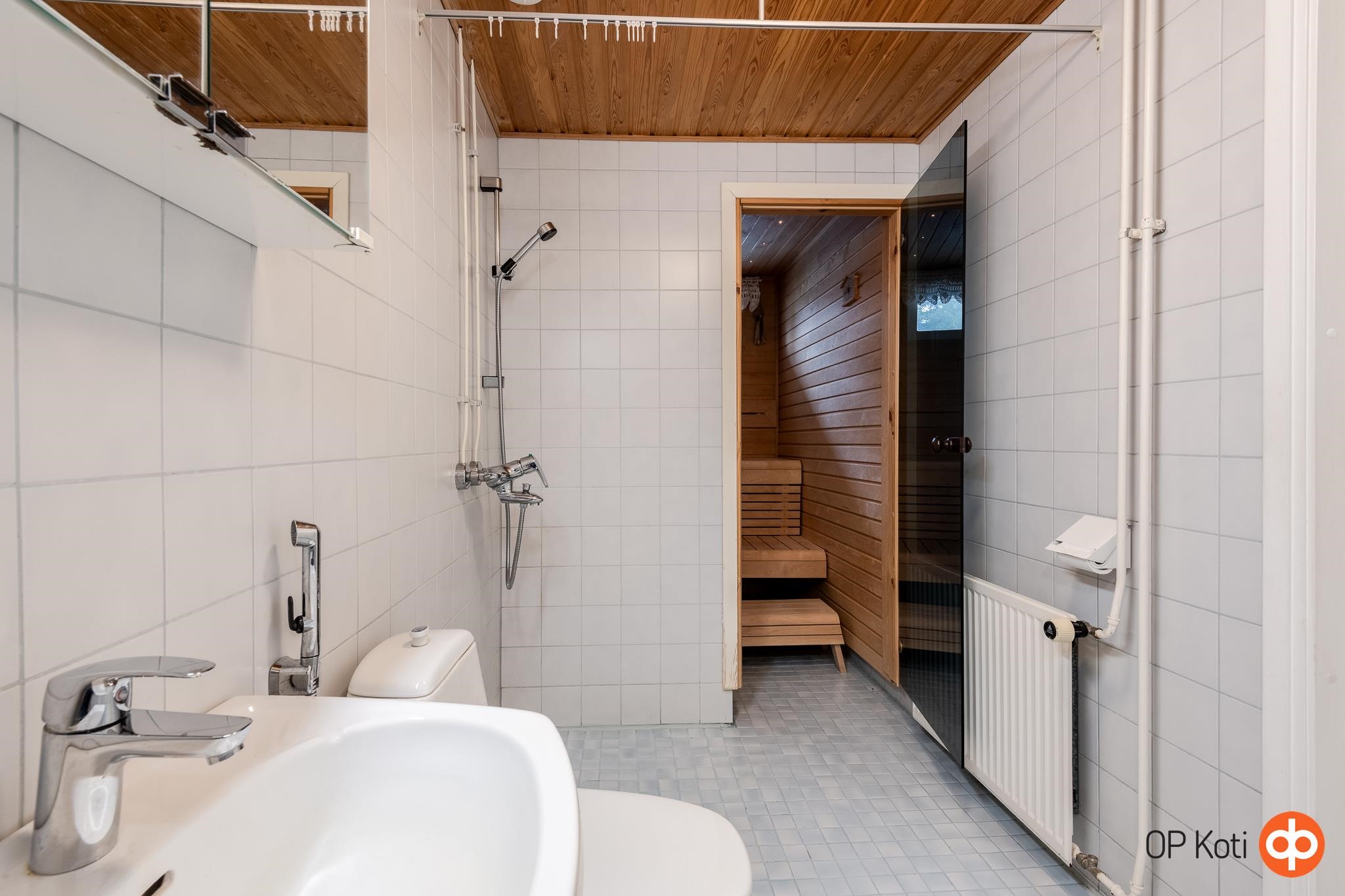 - Sauna, sähkökiuas, kylpyhuone, suihku, peilikaappi, kaapit, pesukoneliitäntä, lattialämmitys, kiinteät valaisimet. Saunan lauteet uusittu n. 2015