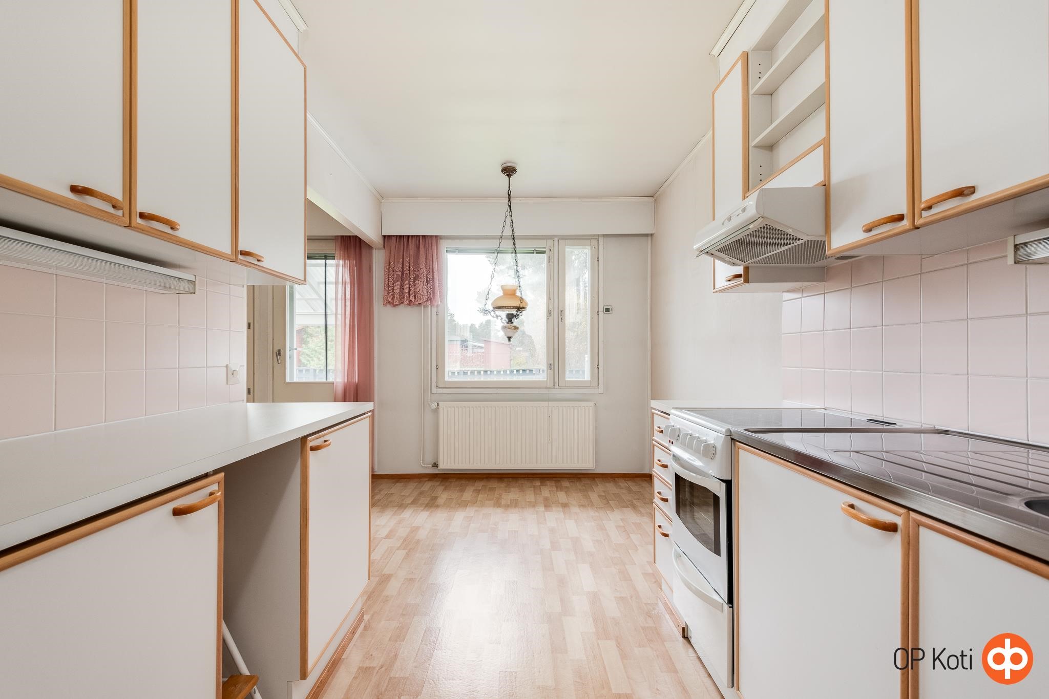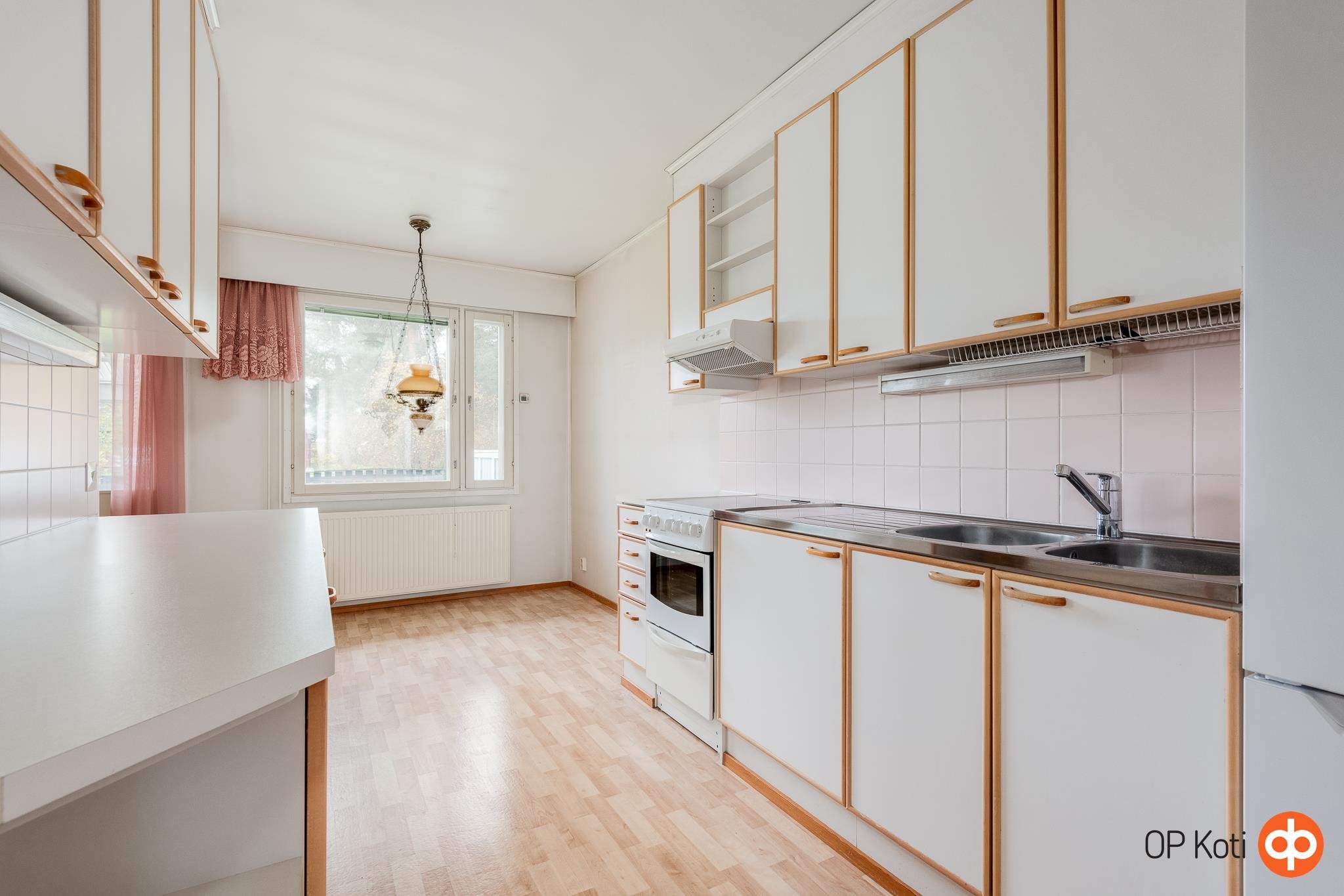 Avara olohuone ja isot ikkunat tuovat päivänvalon sisään lämpimästi ja luoden tilaan avaruutta. Tilava keittiö, jossa runsaasti työ- ja kaapistotilaa.