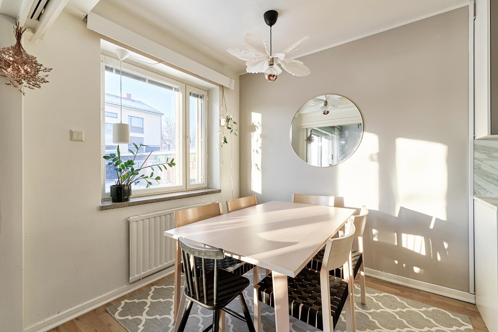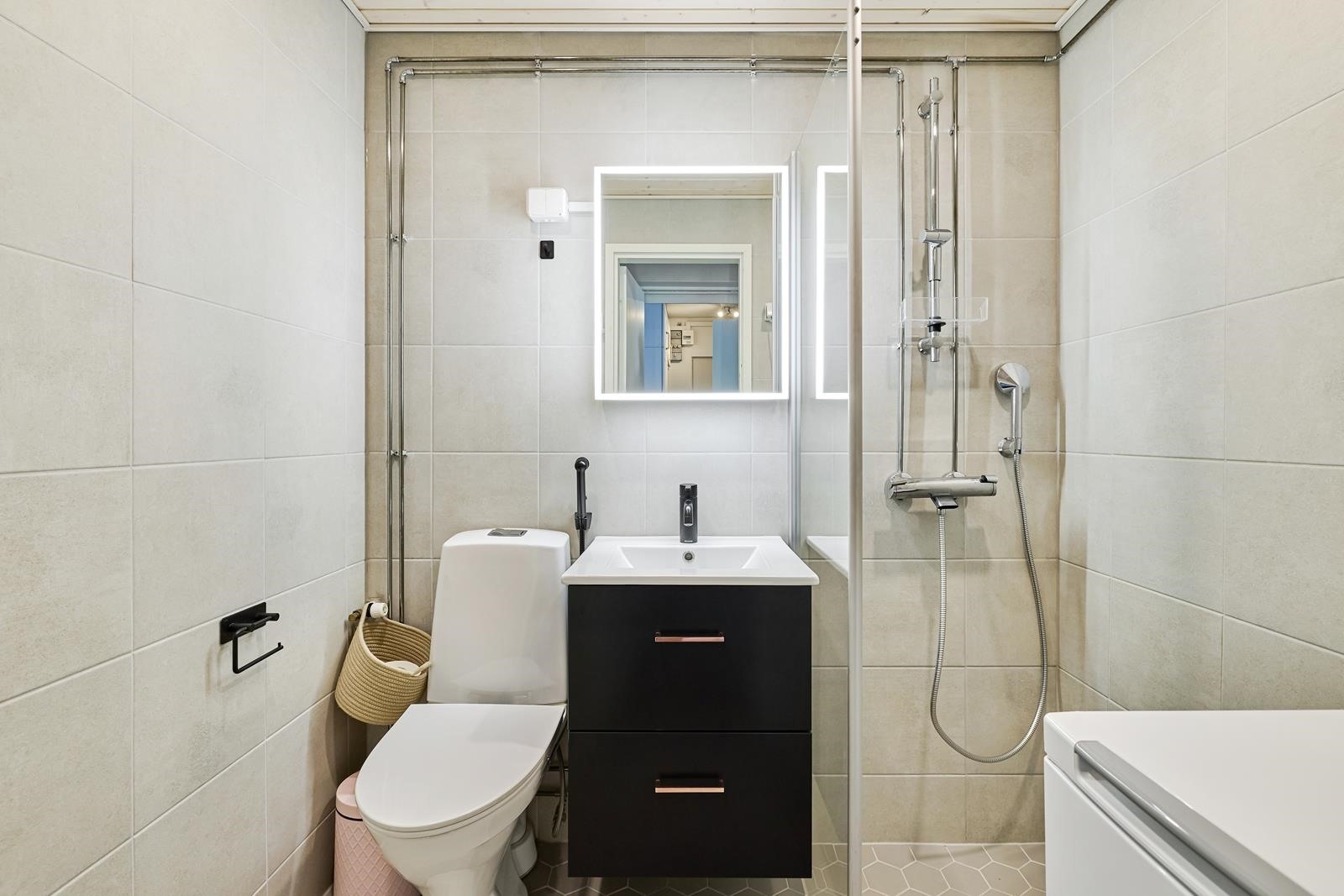 - Kylpyhuone, suihku, peilikaappi, allaskaappi, pesukoneliitäntä, lattialämmitys kylpyhuone, kiinteät valaisimet.