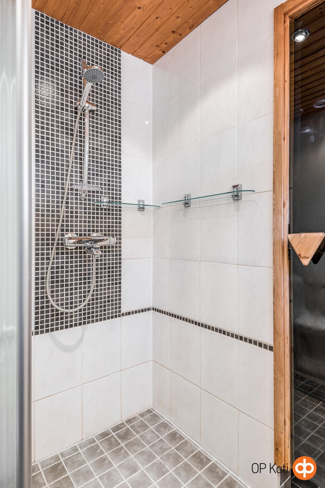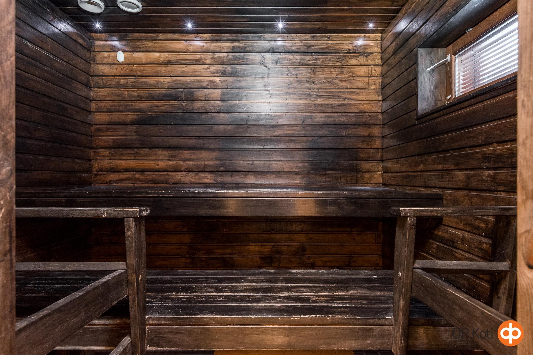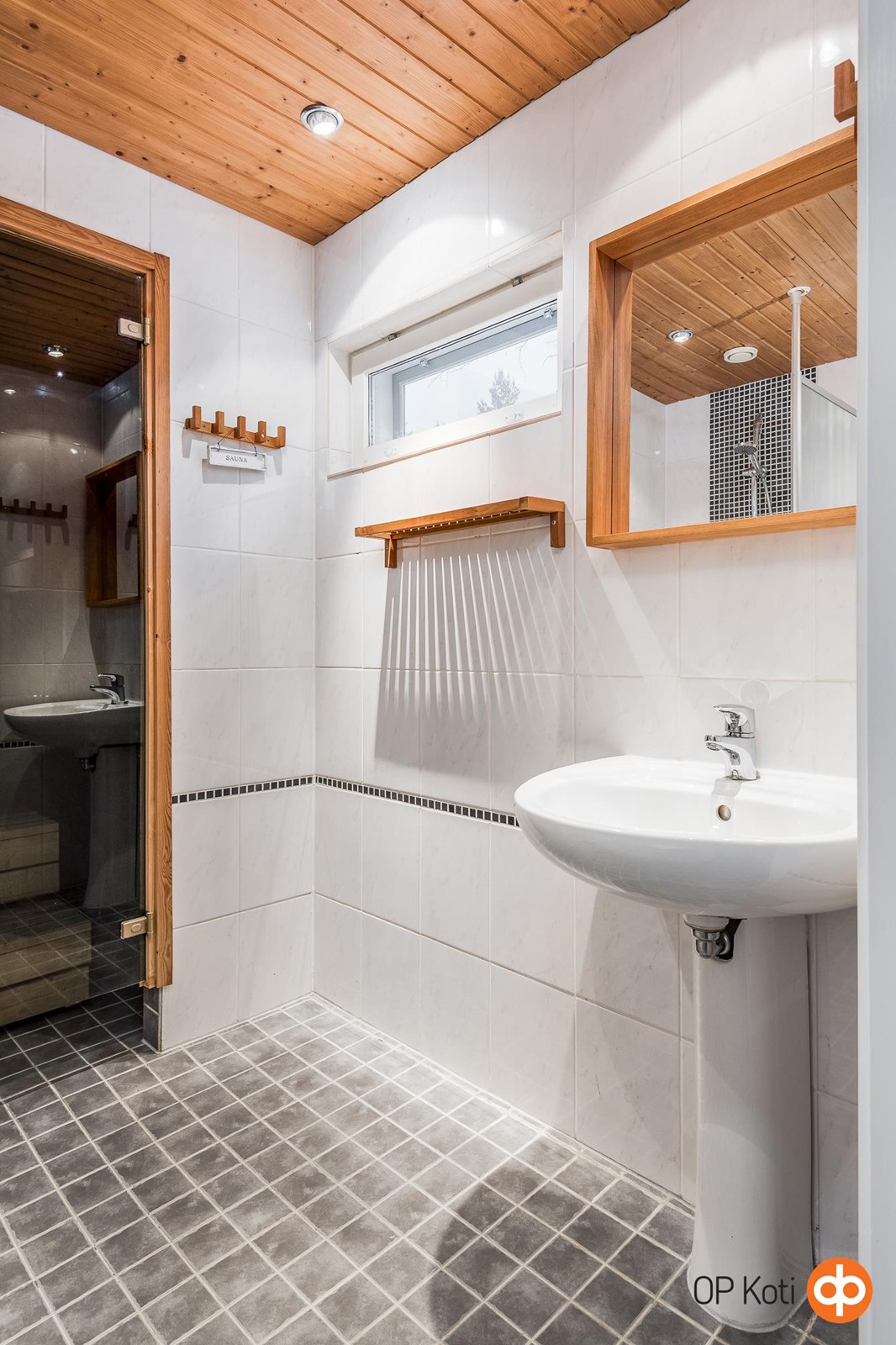 - Sauna, sähkökiuas, kylpyhuone, erillinen wc, suihku, suihkuseinä, peilit, pesukoneliitäntä, lattialämmitys, kiinteät valaisimet. Alkuperäinen siiti kylpyhuone.