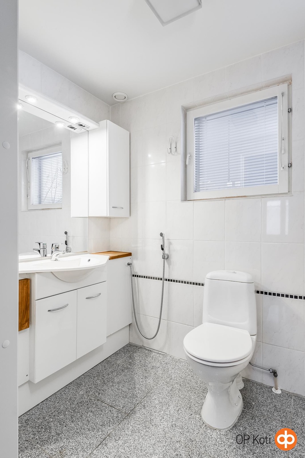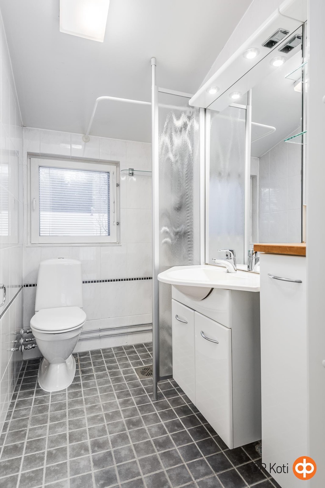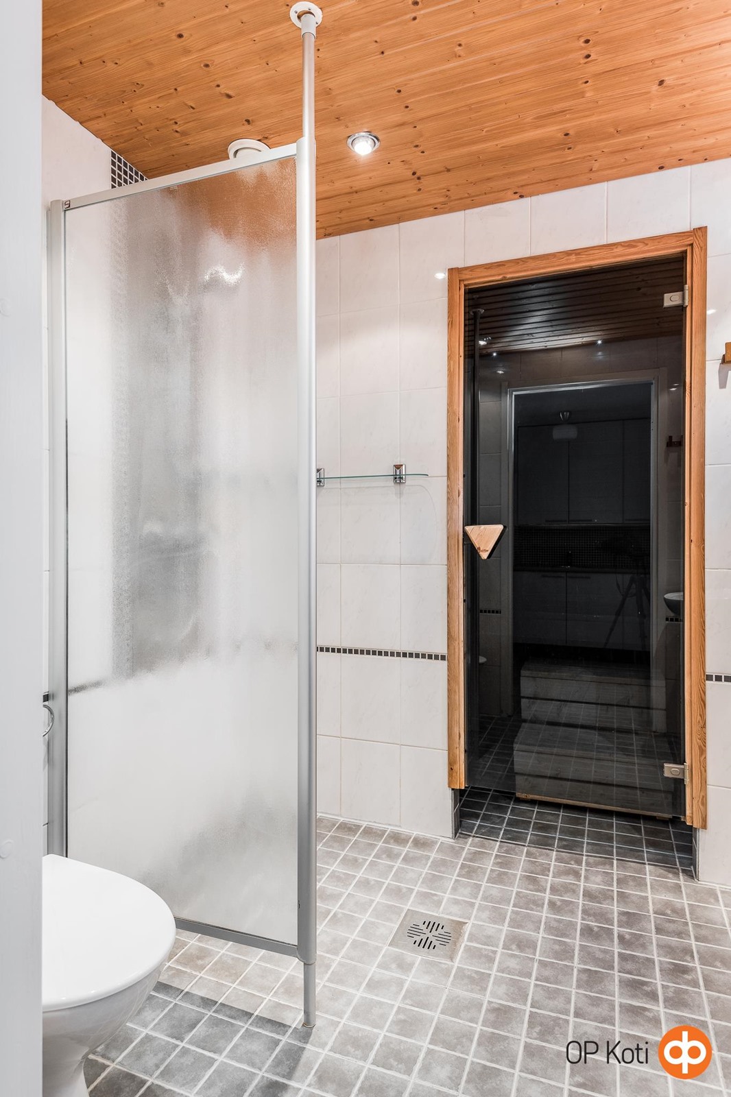 - Sauna, sähkökiuas, kylpyhuone, erillinen wc, suihku, suihkuseinä, peilit, pesukoneliitäntä, lattialämmitys, kiinteät valaisimet. Alkuperäinen siiti kylpyhuone.