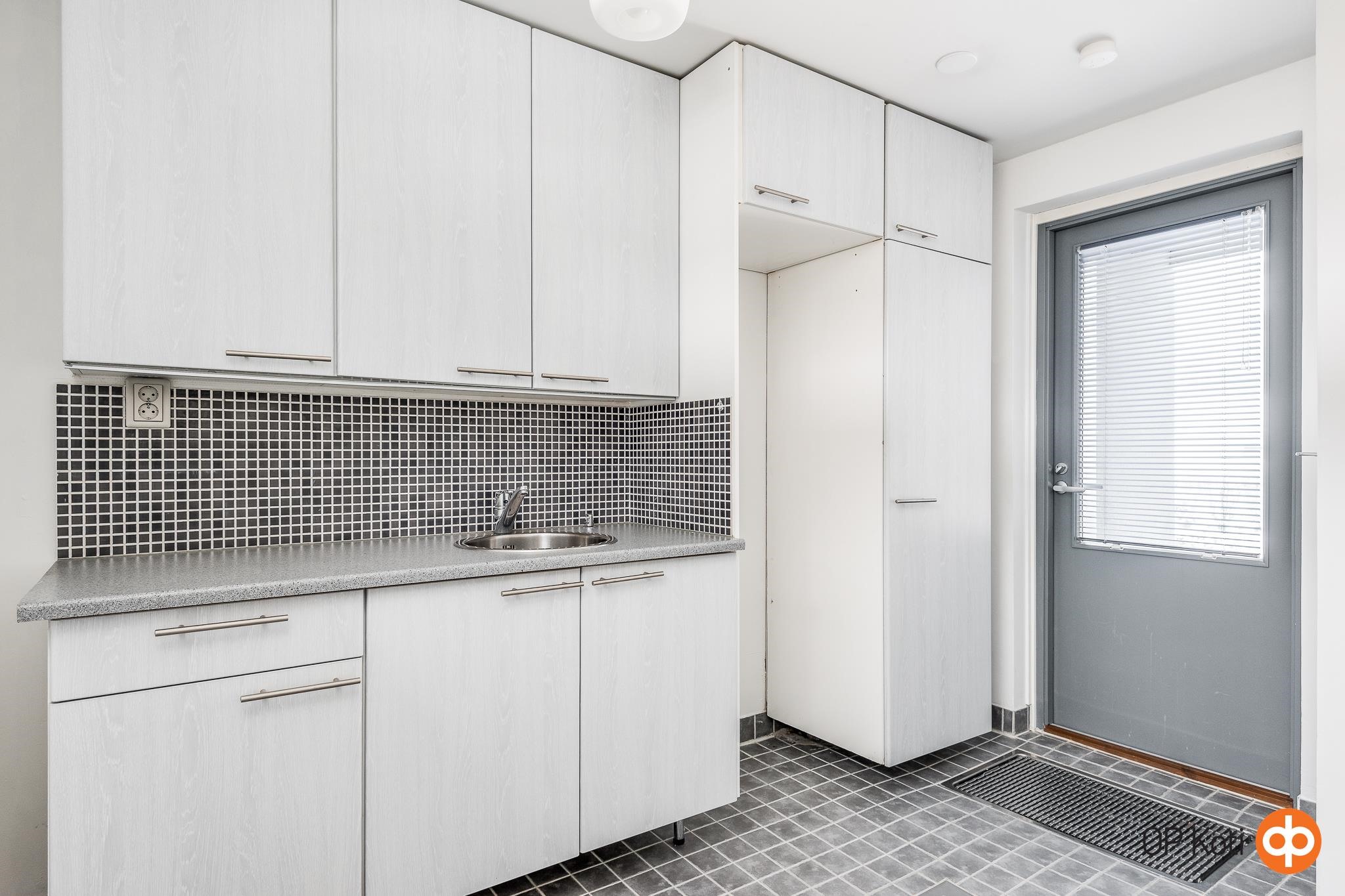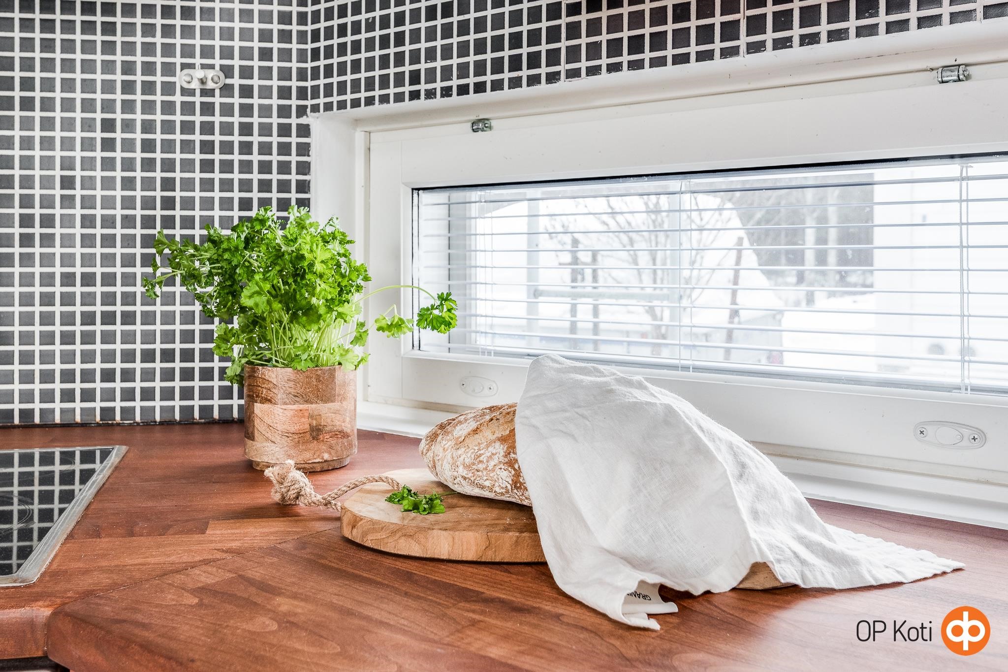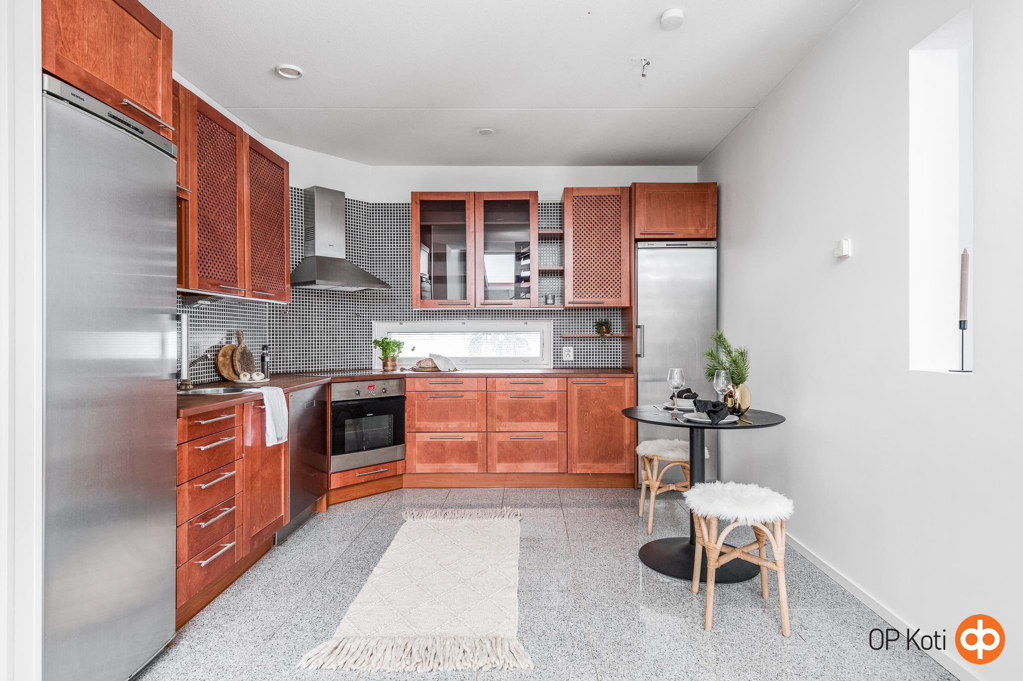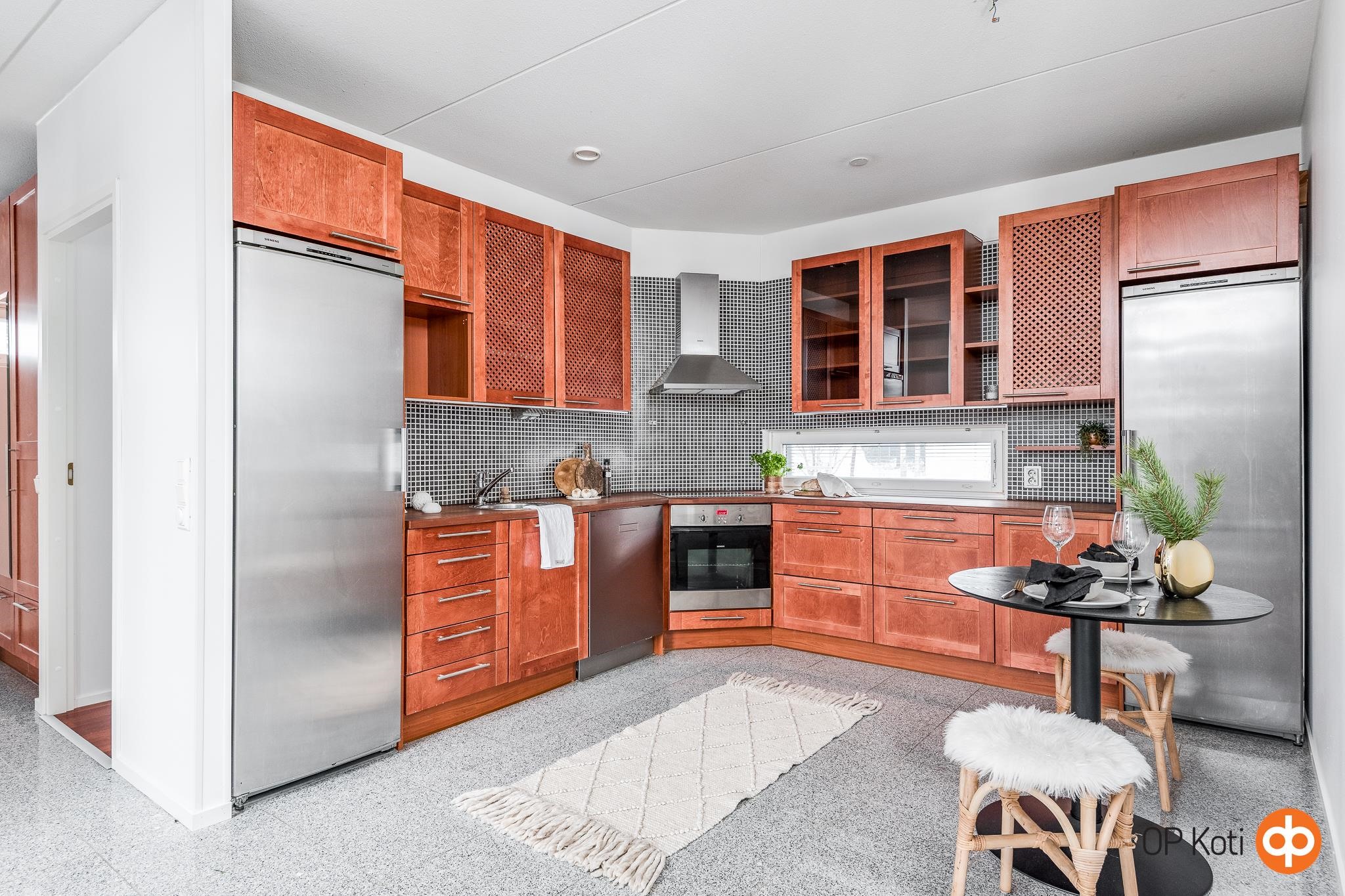 - Jääkaappi, pakastekaappi, erillisuuni, liesitaso, keraaminen liesi, liesituuletin, mikroaaltouuni, astianpesukone, kaapistot, kiinteät valaisimet, pöytätasojen materiaali Laminaatti. Puustelli kiintokalusteet
