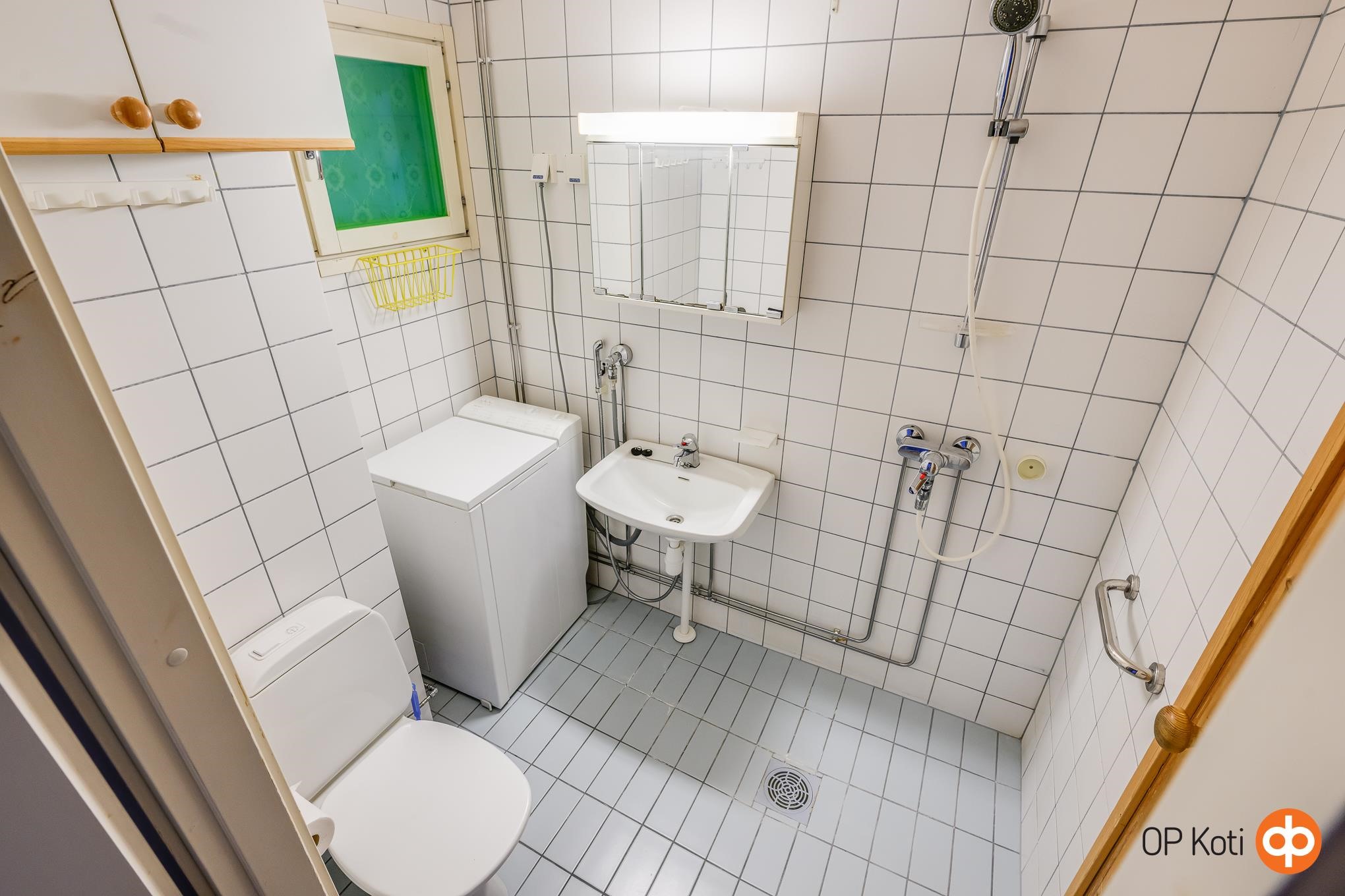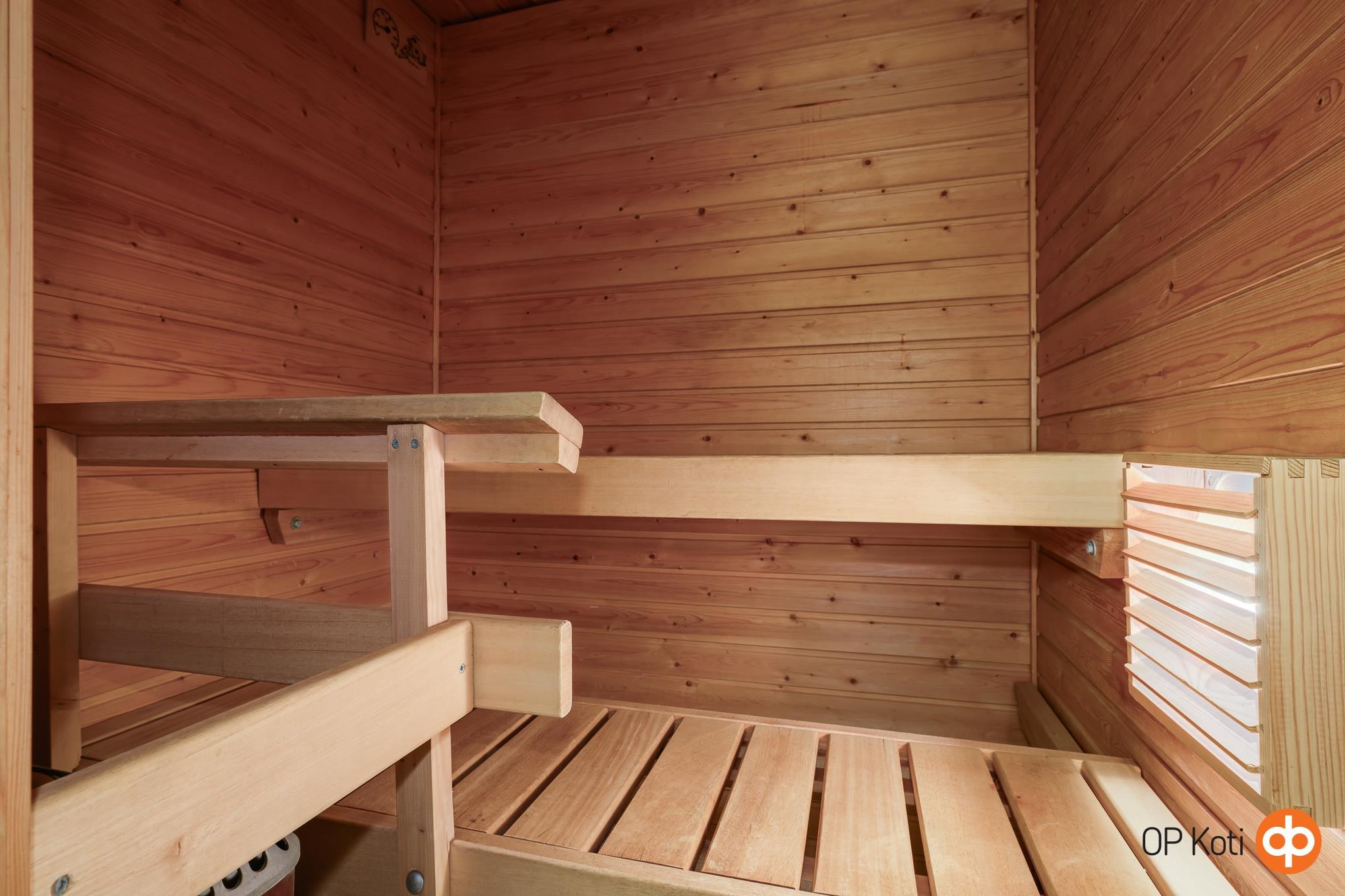 - Sauna, sähkökiuas, kylpyhuone, suihku, peilikaappi, kaapit, pesukoneliitäntä, lattialämmitys, kiinteät valaisimet.