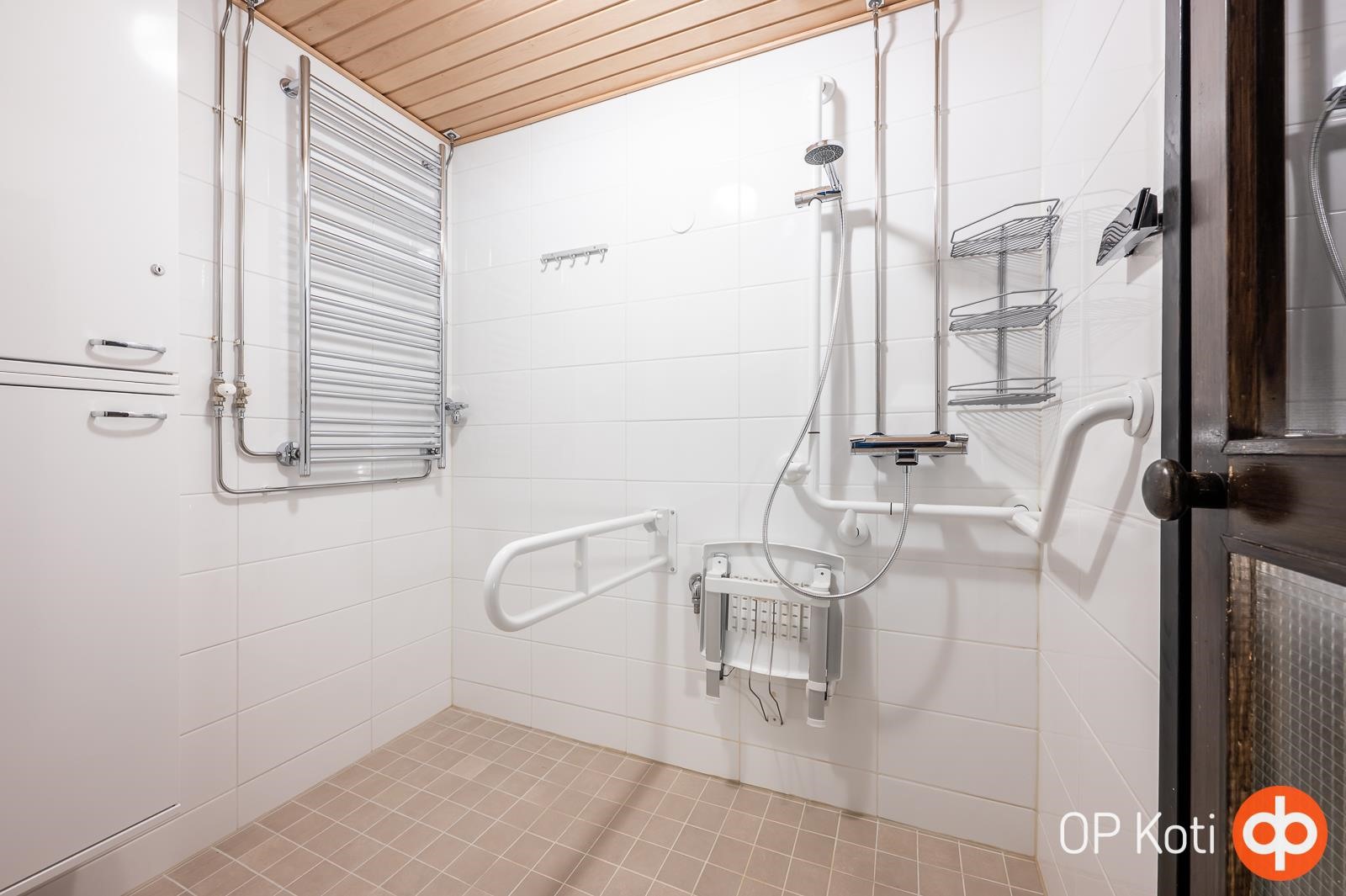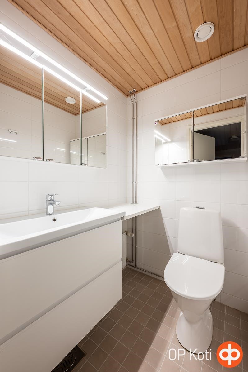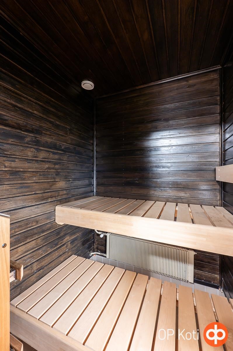 - Sauna, sähkökiuas, suihku, peilikaappi, allaskaappi, pesukoneliitäntä, kiinteät valaisimet.