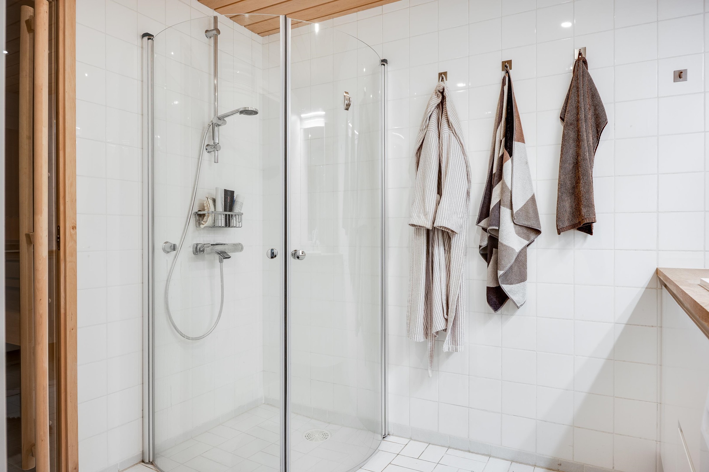 - Kylpyhuoneessa on suihku, suihkuseinä, kaapistot, paikka ja liitännät pyykinpesukoneelle sekä peilikaappi. Kylpyhuoneesta on käynti asunnon saunaan, jossa on sähkökiuas. Erillinen wc-tila: Tilassa on wc-istuin, käsienpesuallas, allaskaappi ja peili. Kylpyhuonetta ja pientä wc-tilaa on remontoitu vuonna 2017.