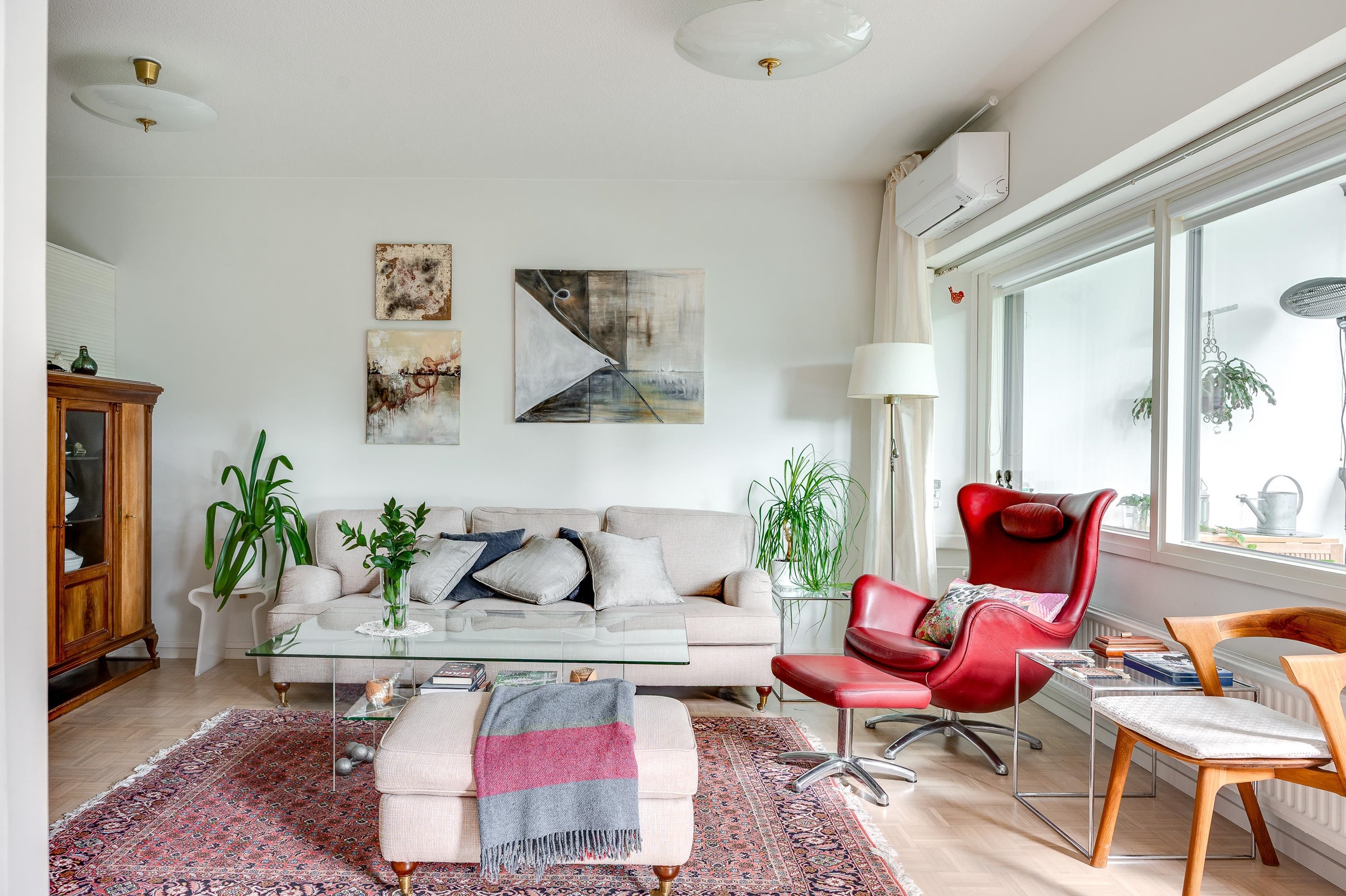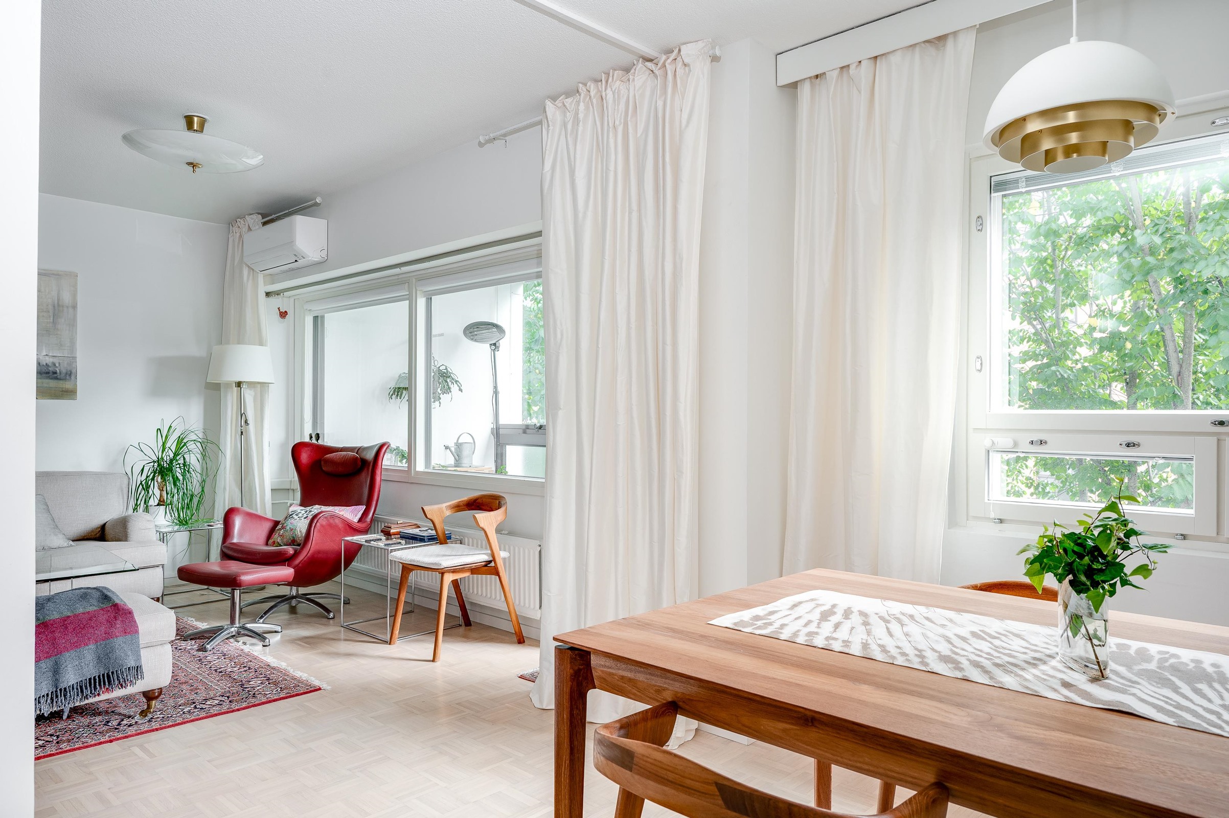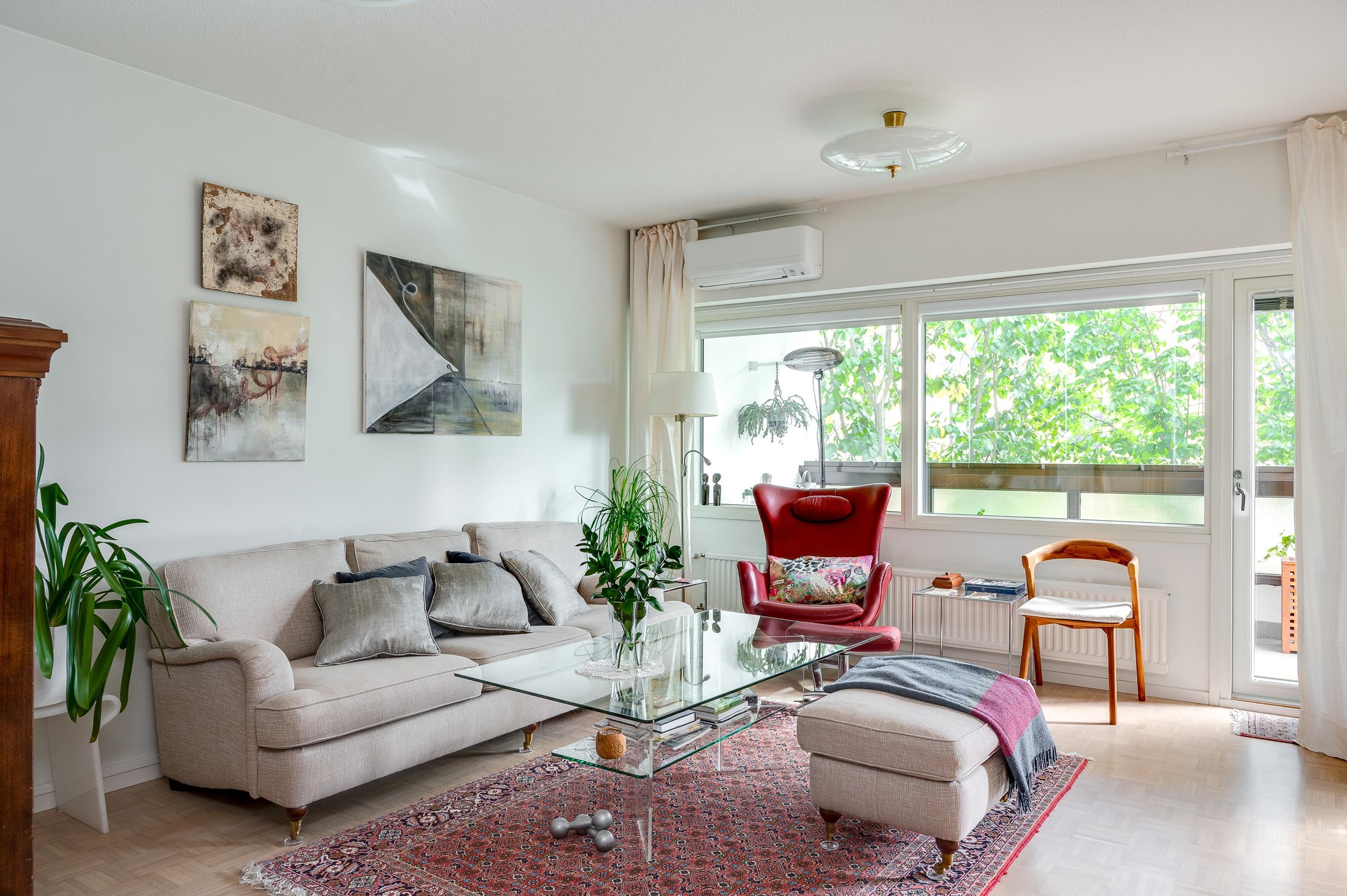 Kuumimpiin kesähelteisiin on varauduttu tässä huoneistossa hyvin, sillä huoneistoon on asennettu ilmalämpöpumppu vuonna 2024.