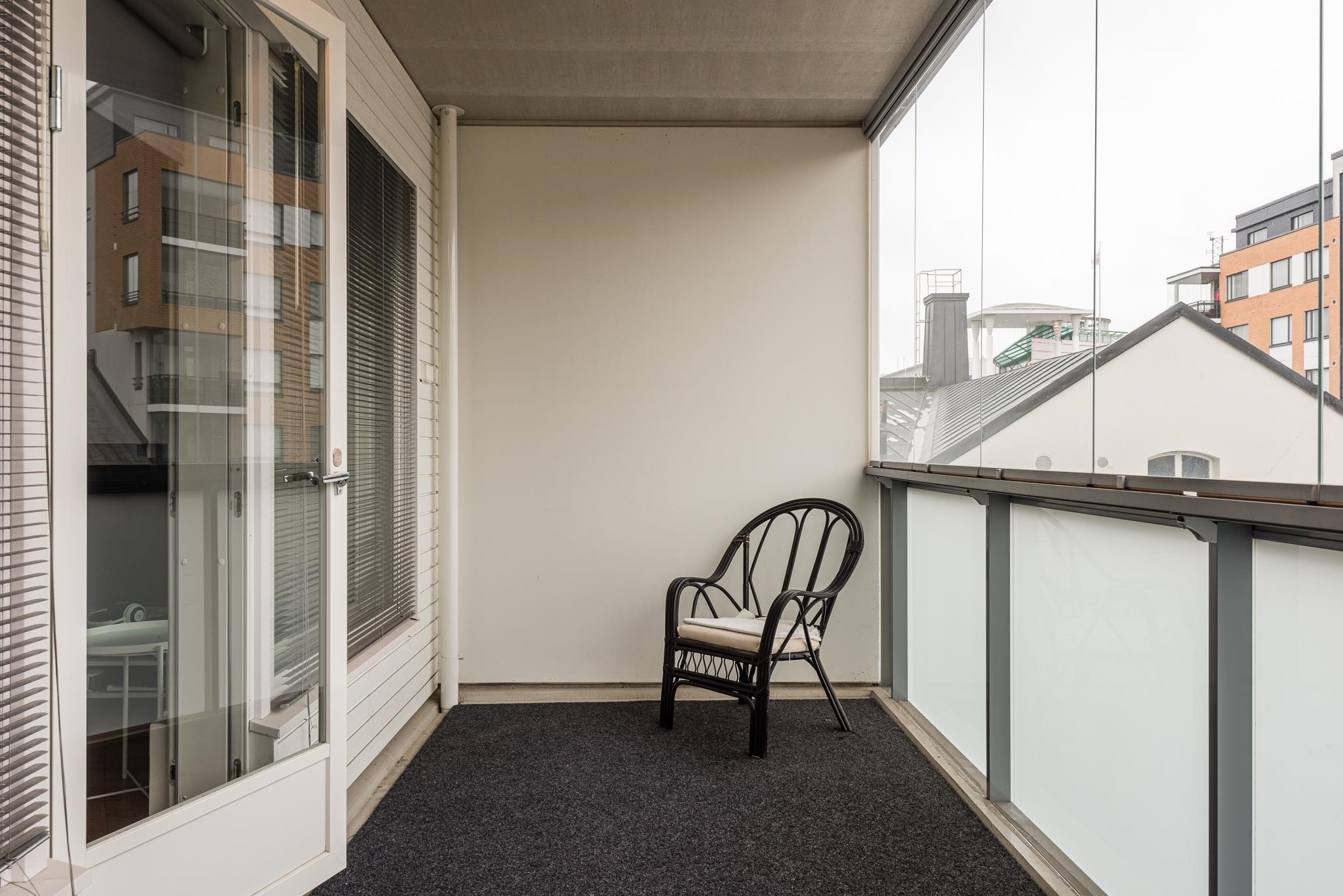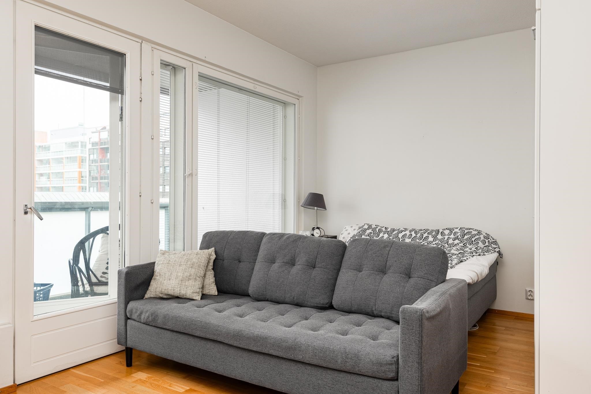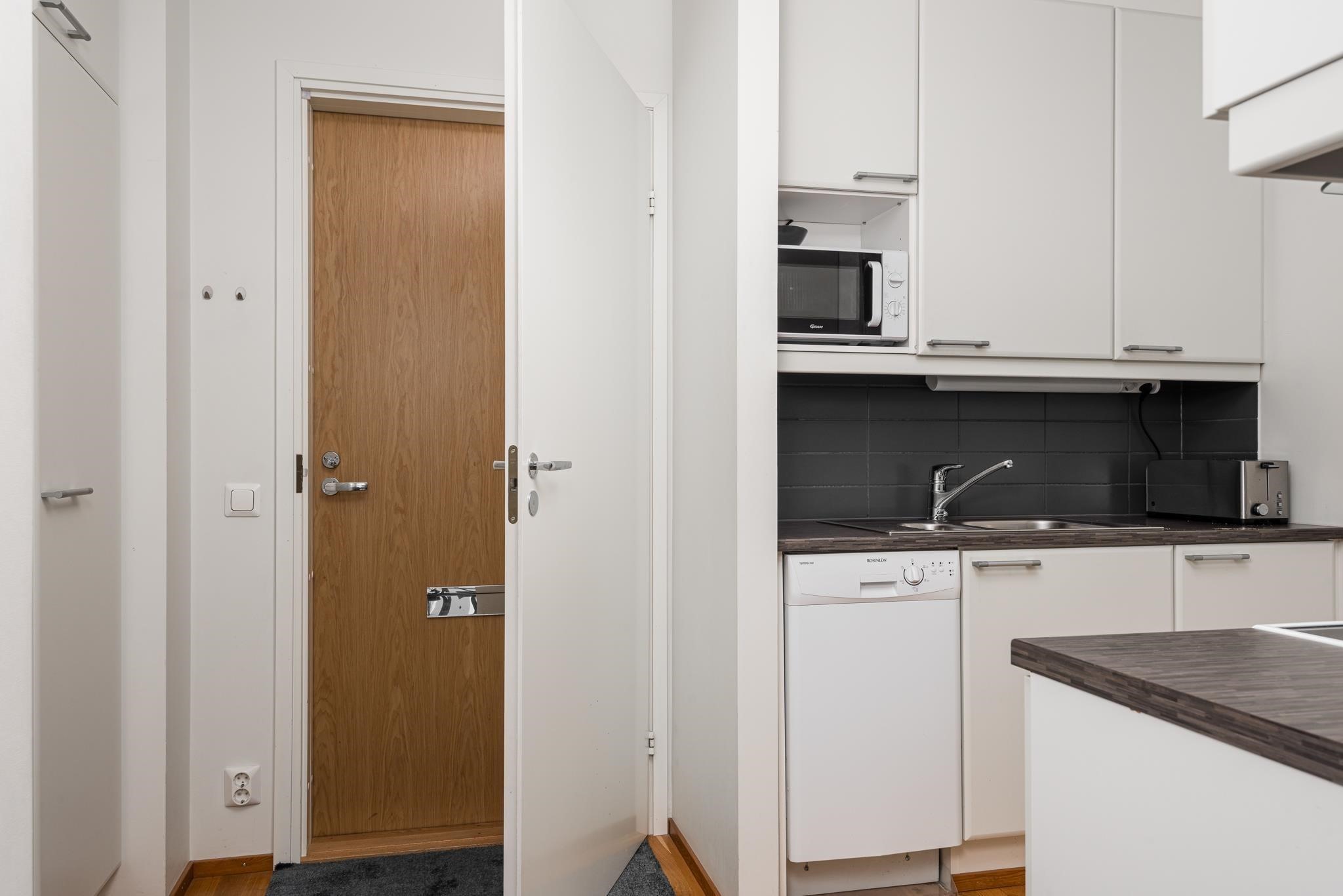 Asunnon pinta-ala on 36,5 m² ja se koostuu yhdestä huoneesta, keittokomerosta sekä kylpyhuoneesta. Keittiössä on keraaminen liesi, jääviileäkaappi, astianpesukone ja kaapistot. Kylpyhuoneessa on suihku, pesukoneliitäntä ja lattialämmitys. Parkettilattia ja valkoiset maalatut seinät luovat tyylikkään ilmeen ja asunnossa on runsaasti säilytystilaa.