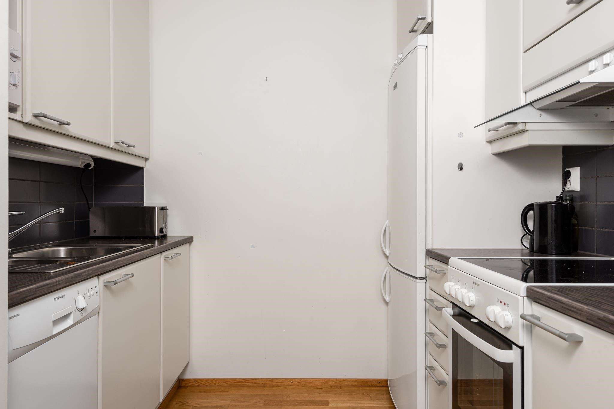 - Jääviileäkaappi, keraaminen liesi, liesituuletin, astianpesukone, kaapistot, kiinteät valaisimet.