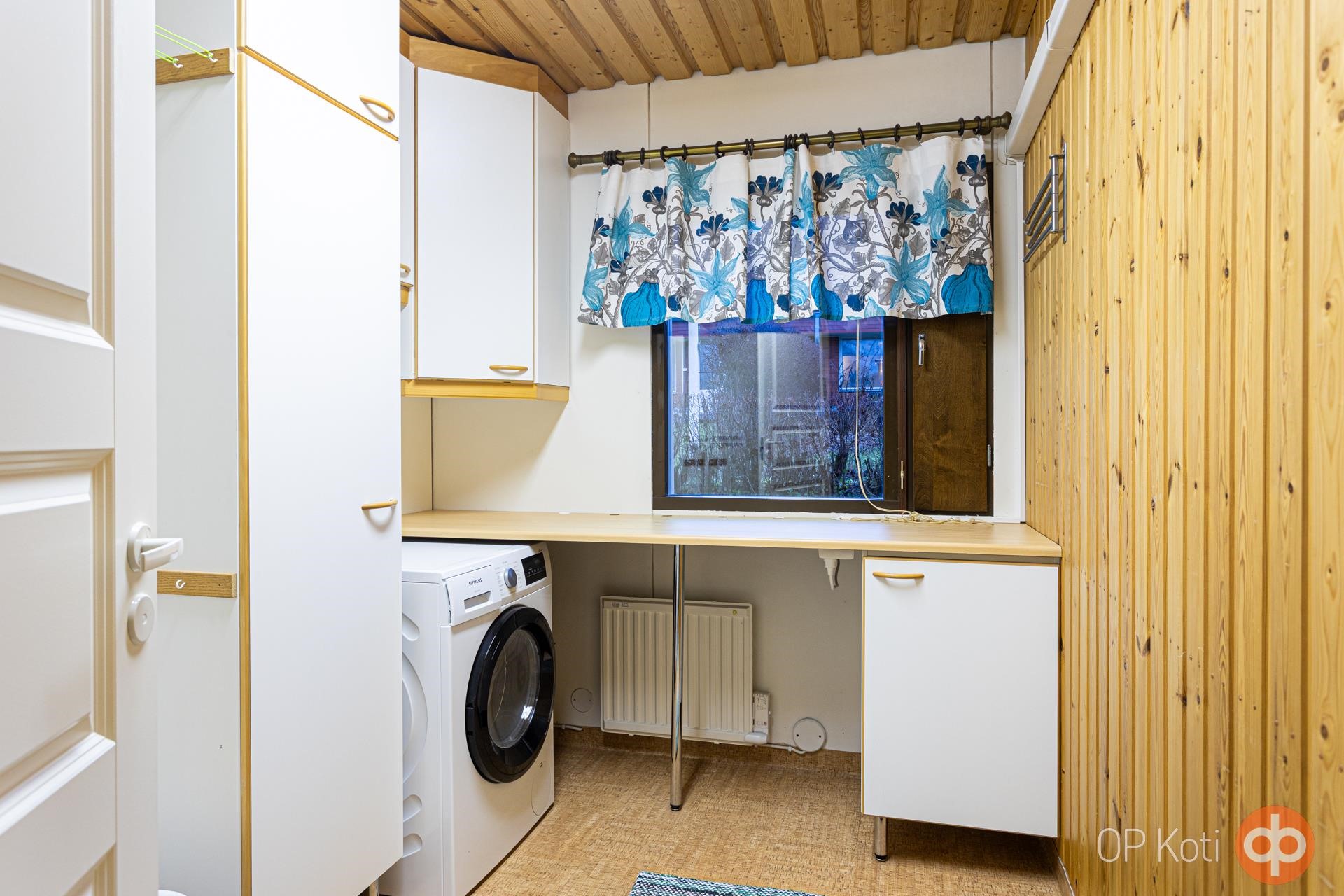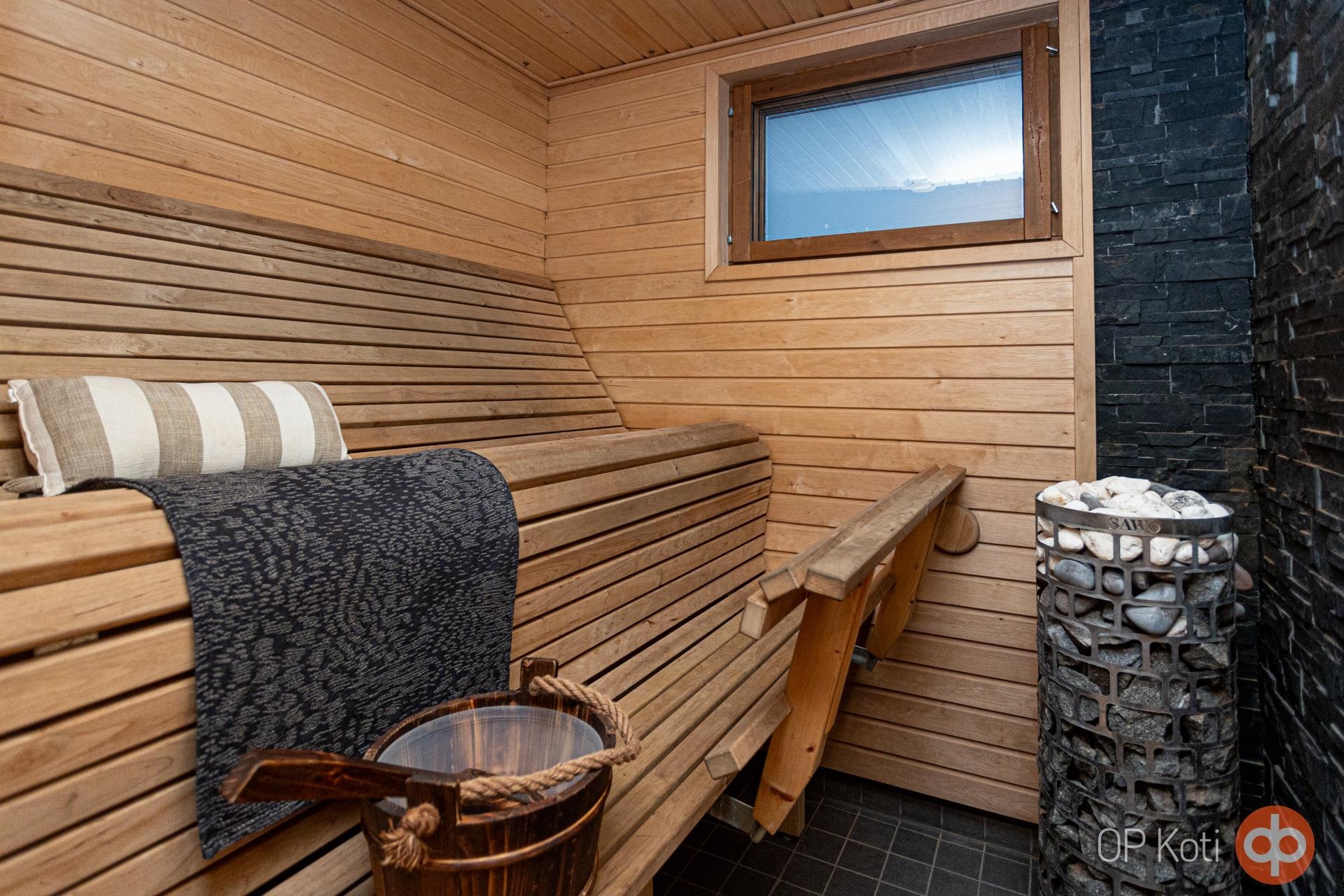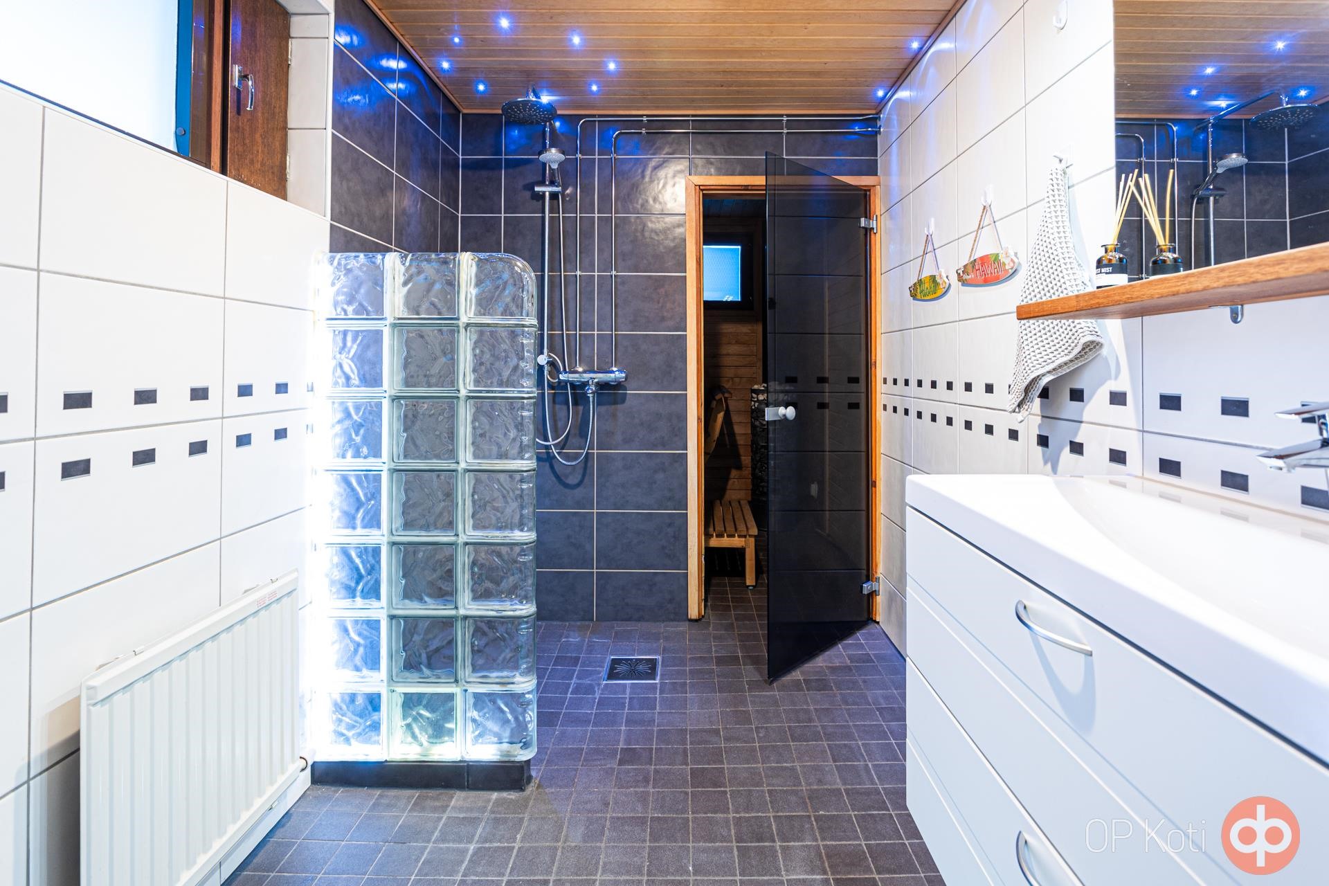 - Sauna, sähkökiuas uusittu 2021, kylpyhuone, erillinen wc, suihku, suihkuseinä, peilit, kaapit, allaskaappi, pesukoneliitäntä kodinhoitotilassa, lattialämmitys pesuhuoneessa, kiinteät valaisimet. Pesutilat remontoitu 2010. Seinät kivirakenteiset (harkoista). Saunassa muotolauteet ja pilarimallinen kiuas. Suihkutilan vierellä seinä (ei täyskorkea) lasitiilistä. Erillinen wc.