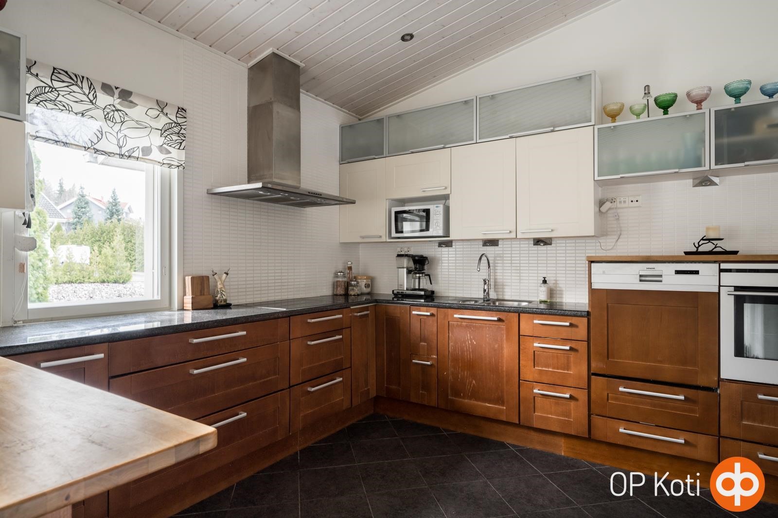 - Jääkaappi, pakastekaappi, erillisuuni, induktioliesi (2 x induktio, 2x keraaminen), liesituuletin, kaapistot, kiinteät valaisimet, pöytätasojen materiaali kivitasot.